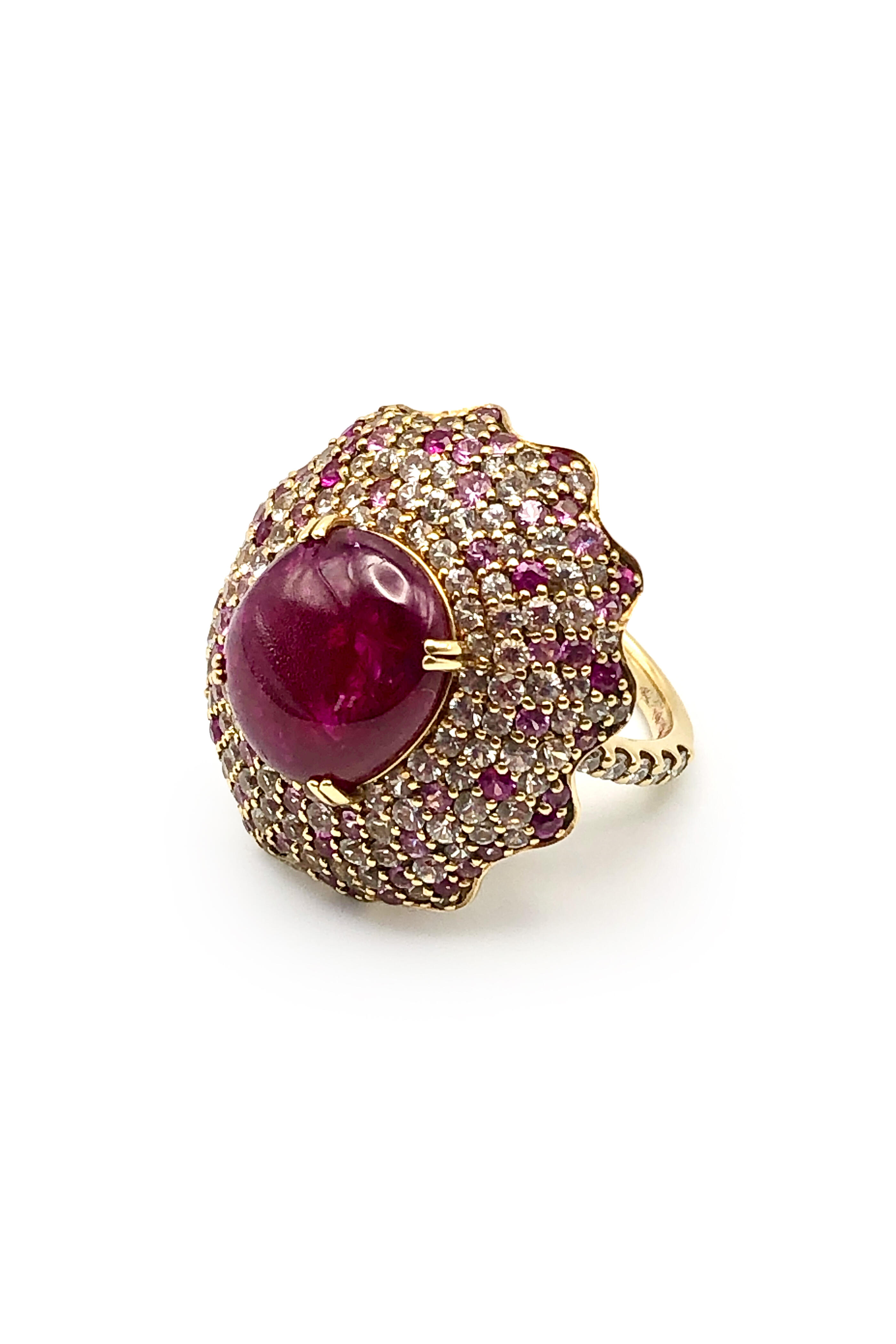 18k Yellow Gold. 0.38 ct Diamond. 4.90 ct Pink Sapphire. 10.68 ct Ruby.
