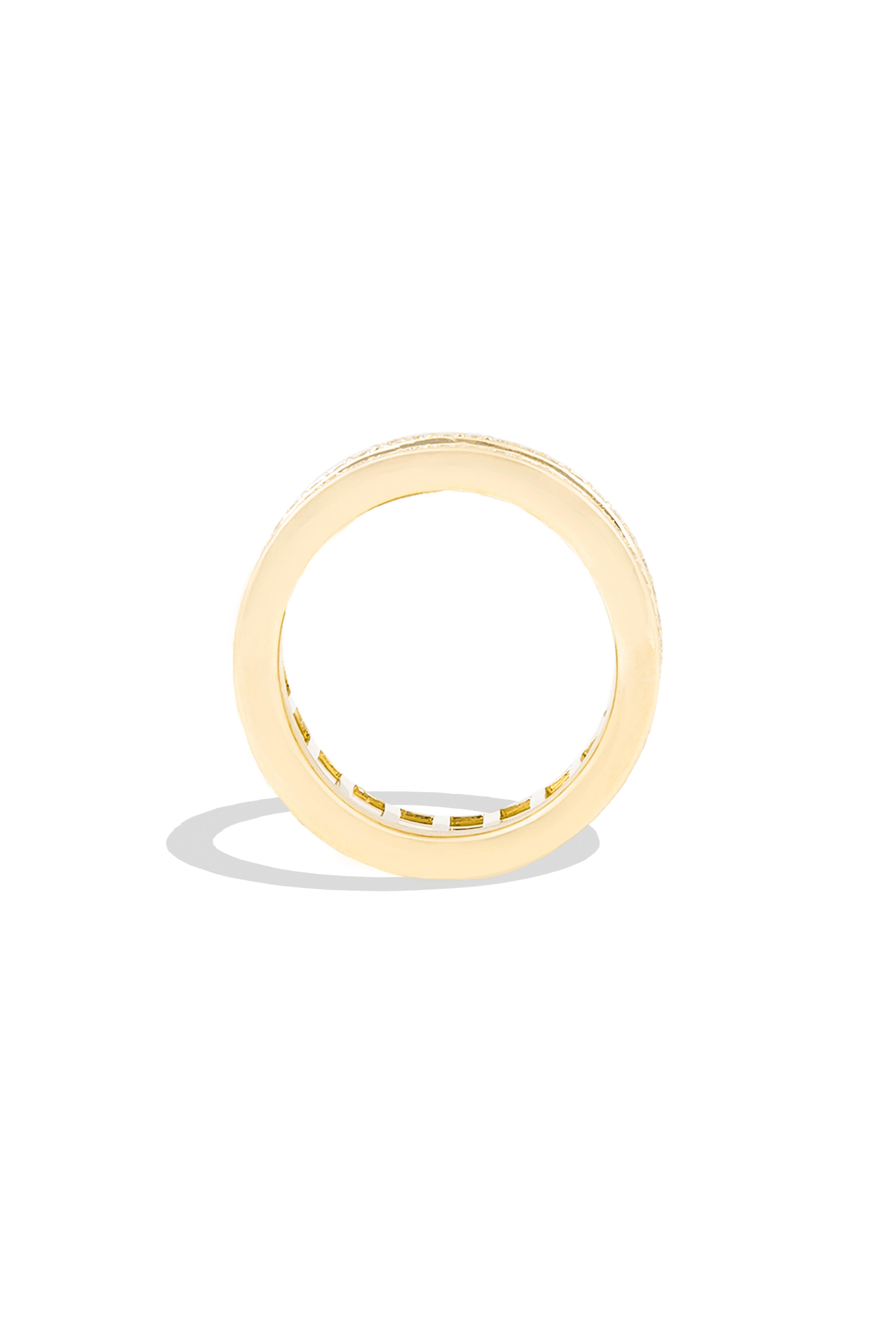 The Revel Pave Dimensional Cigar Band is a modern and sculptural take on the classic cigar band. This statement ring has a concave silhouette, featuring two sloping sides covered completely in rows of diamonds that meet at a gold band in the center. The concave shape is unique and unexpected, delivering a true collector's piece that is a great addition to any collection.