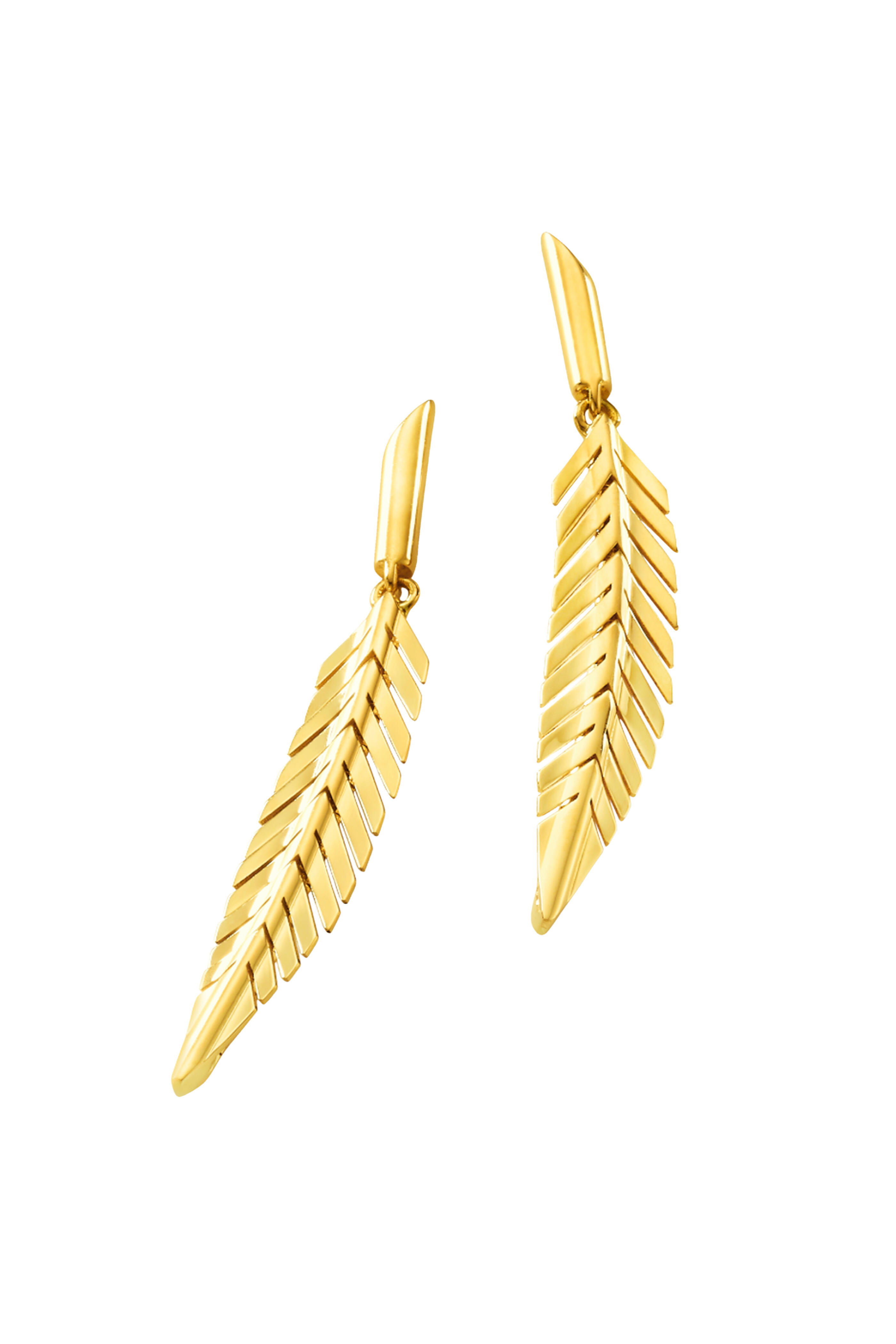 Accent your ear with the small 18K yellow gold Feather Drop Earrings. Measuring approximately 1.5 inches in length they're the perfect everyday earring for a bit of subtle flair or as an accent earring in your second or third piercing. For a funkier, head-turning look, we suggest wearing these small feather earrings in your second or third piercing paired with our Medium Feather Earrings.
