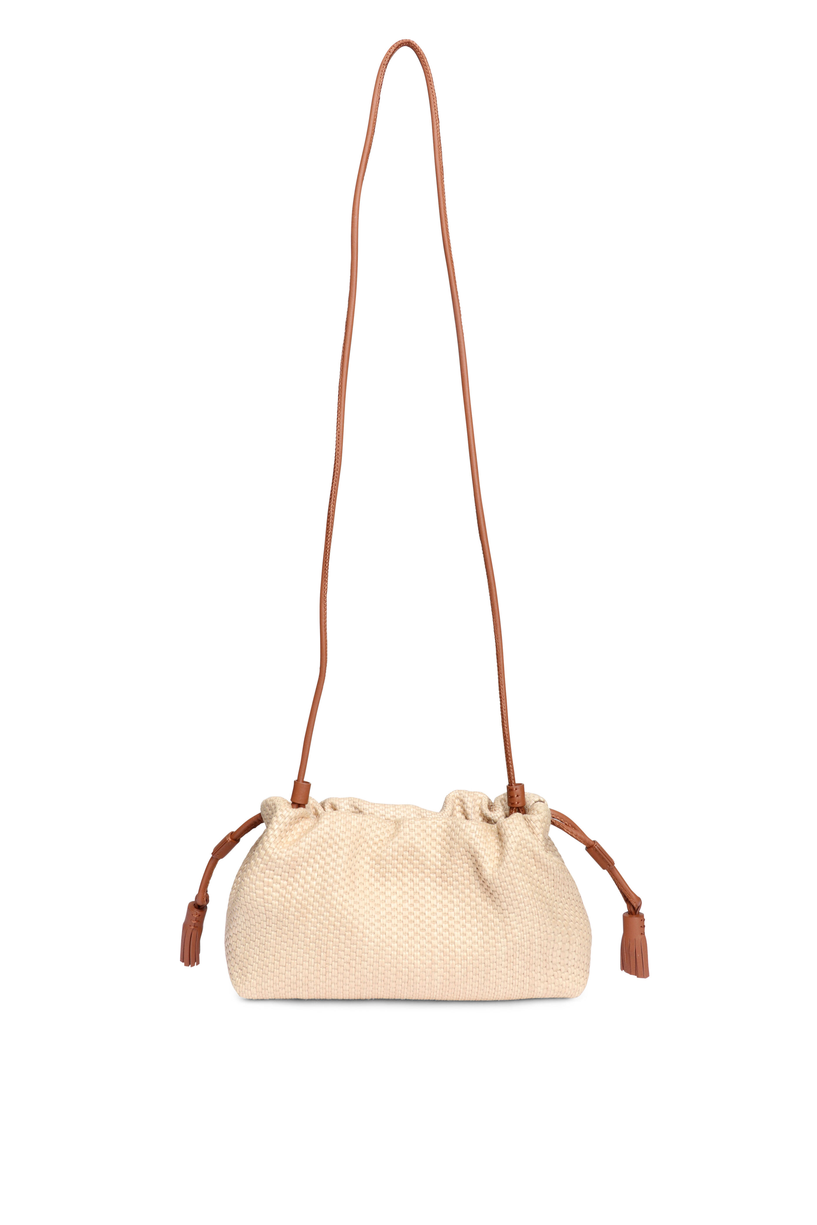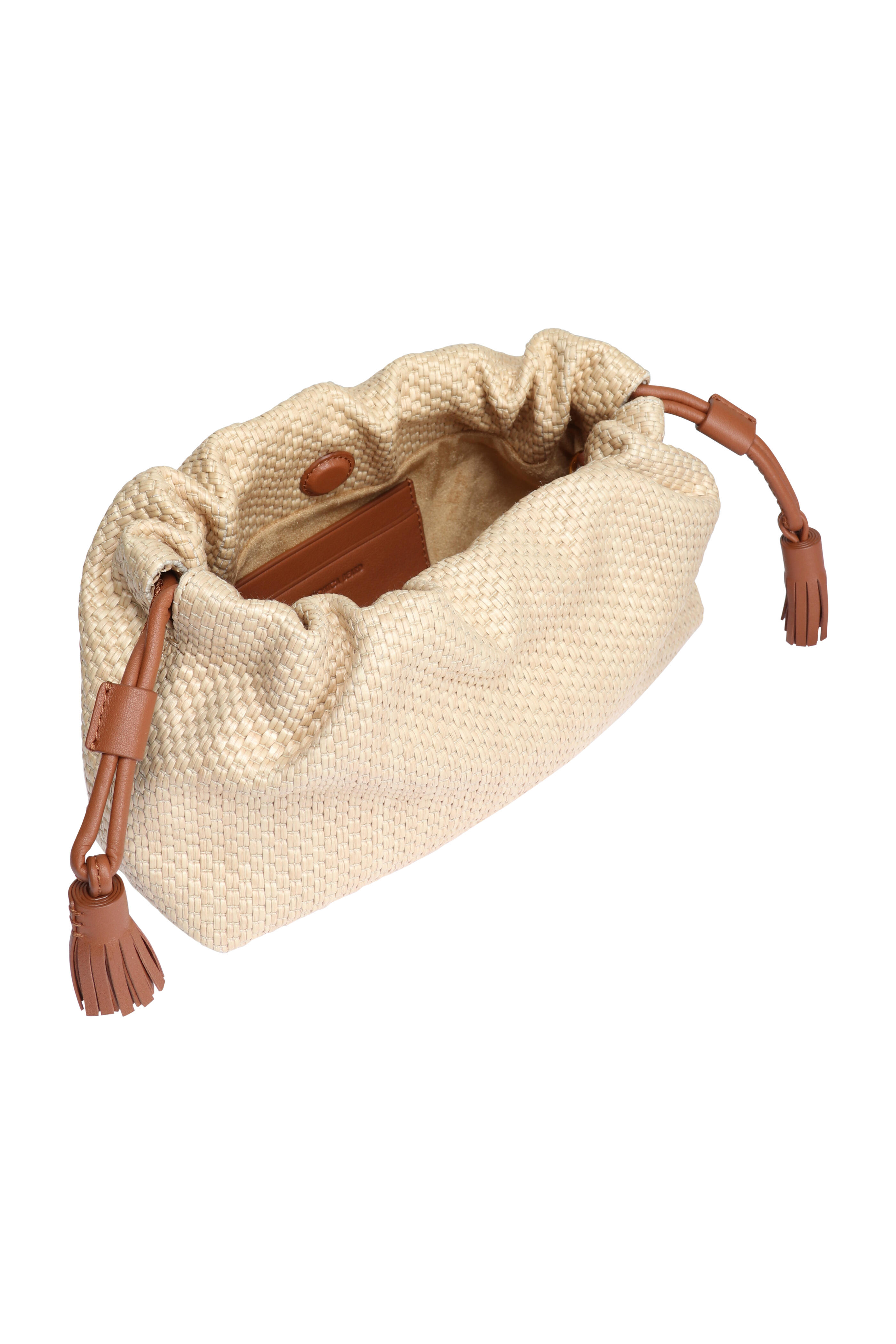 Raffia outer. Microsuede lining. Magnetic clasps. Cinchable top. Crossbody silver snake chain strap. Premium silver leather with a crinkled finish. Leather tassel drawstrings on each end. Interior wall card pocket. Imported. 5.9” L x 10.2” W x 3.1” H. Strap drop: 22”.