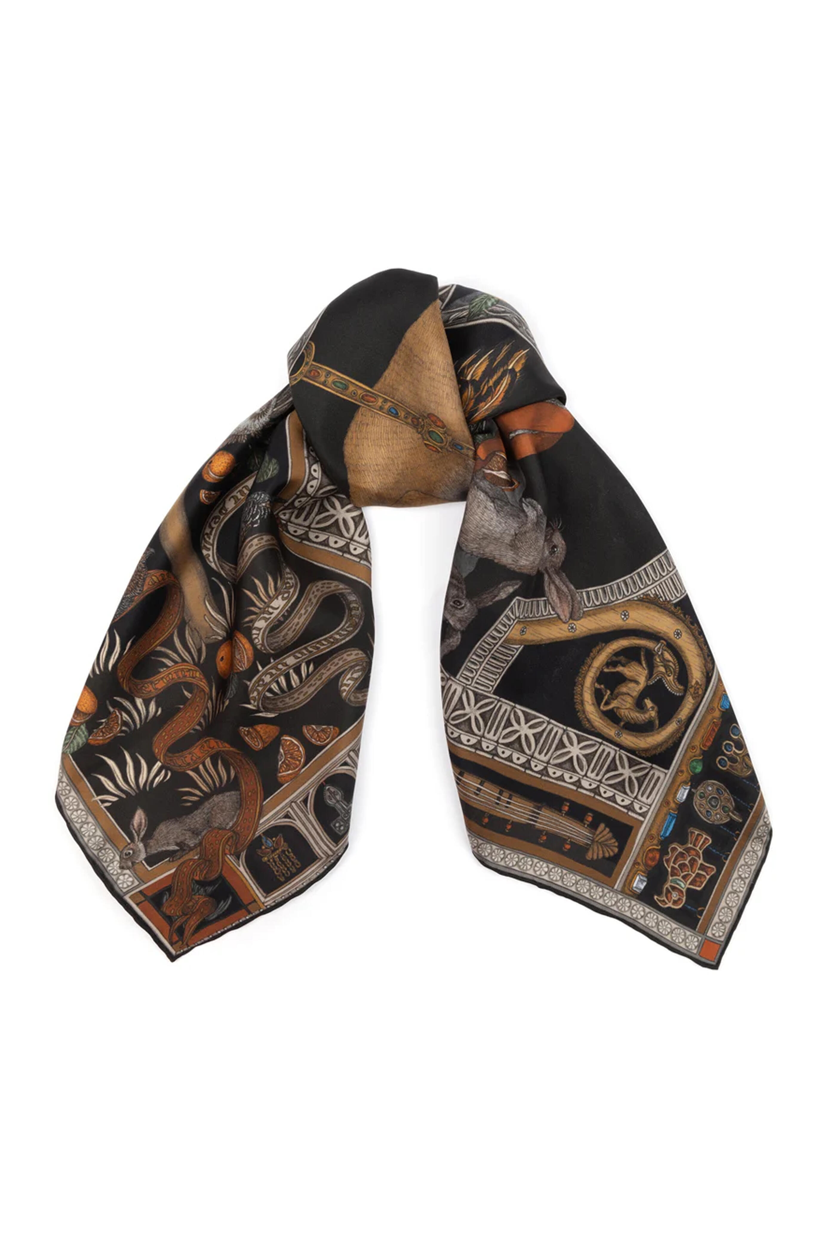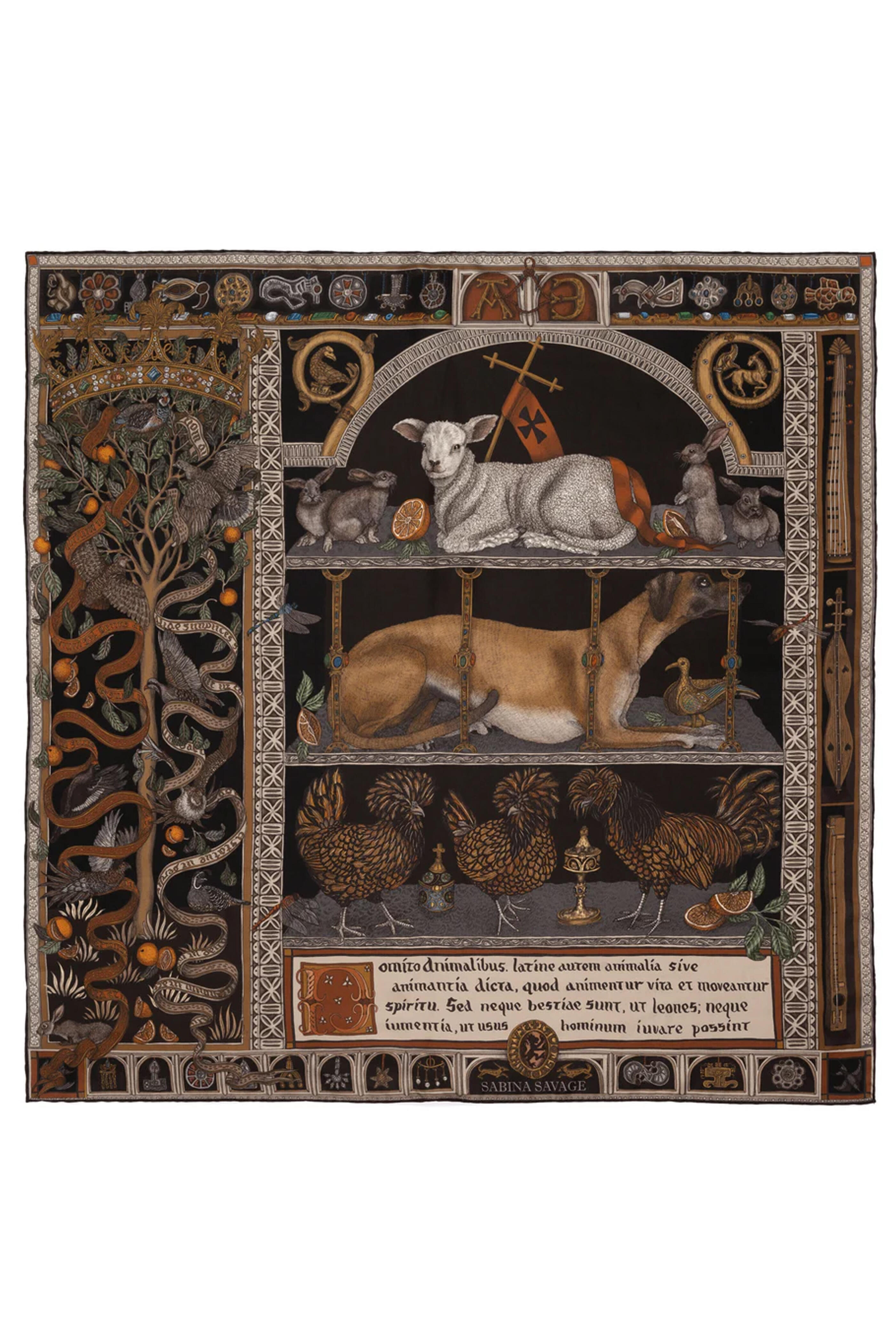 - This design features a variety of kind and good natured animals surrounded by medieval jewels and text, flanked by a beautiful, ribbon-bound tree. Our classic silk twill squares are made from a luxurious 14 momme silk. With a gentle sheen to their surface and a beautiful depth of colour, the finishing touch is added by the masterful hand rolled edging.