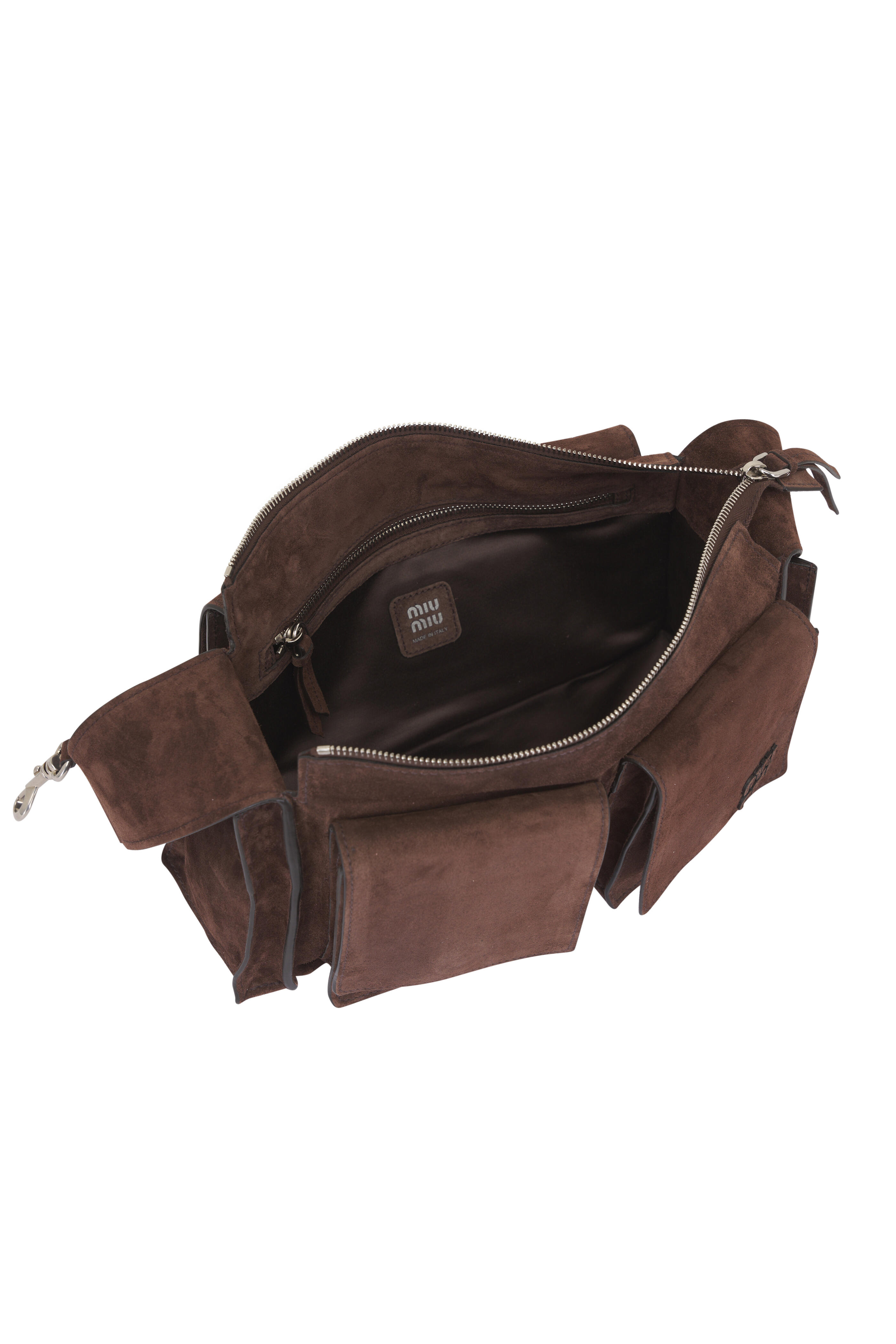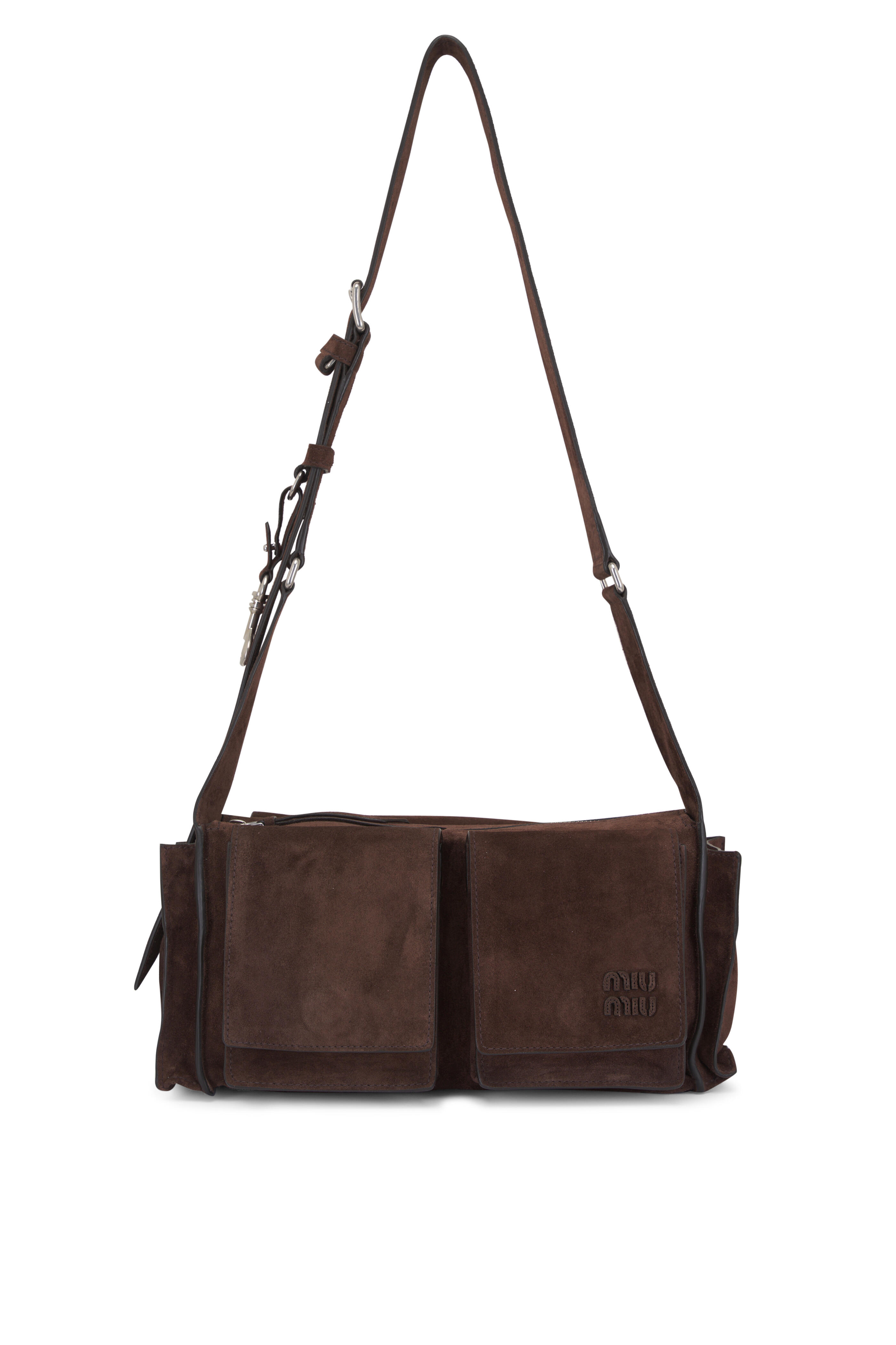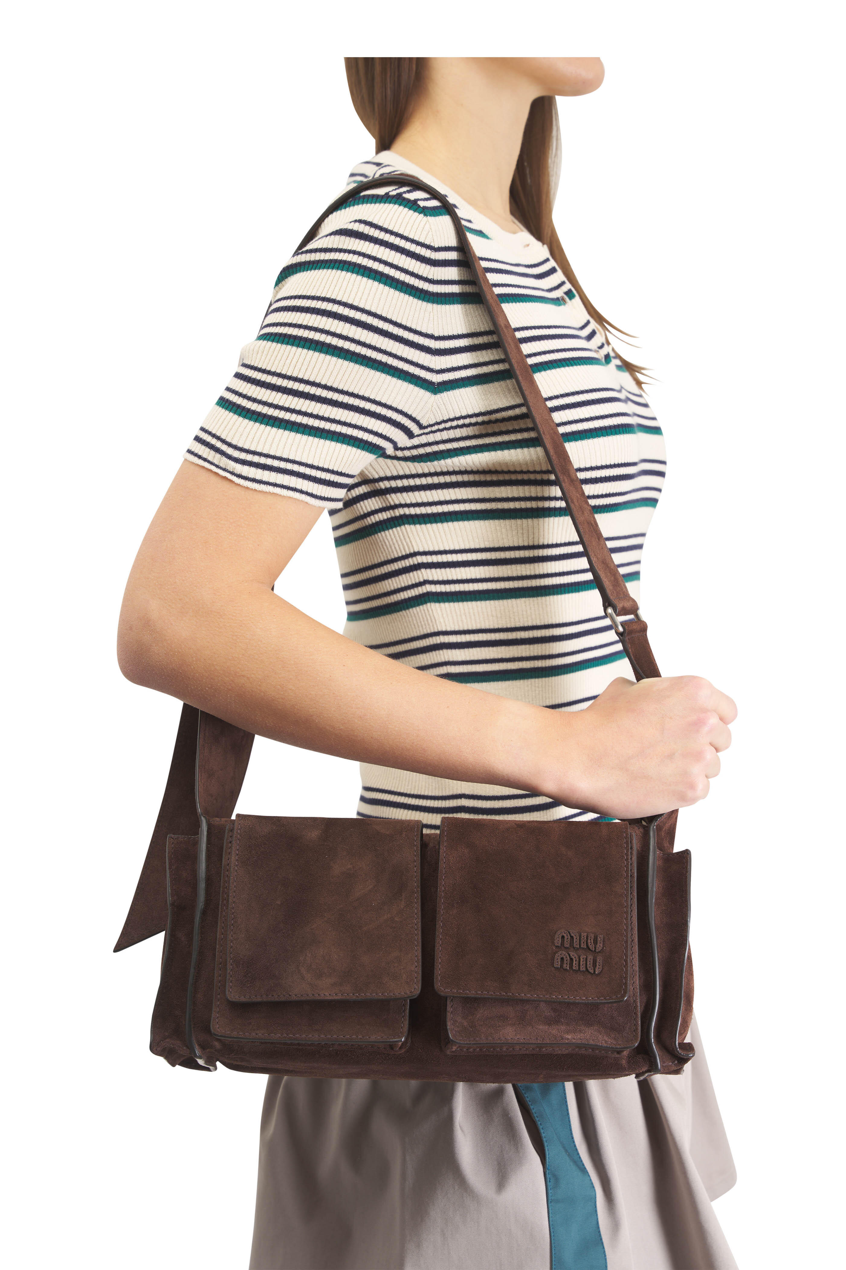 Calfskin suede. Adjustable shoulder strap. Top zip. Single compartments. Interior wall zip pocket. Front and back flap pockets; side pockets with magnetic closure. Cotton satin lining. Leather lettering logo on the front. Dark steel tone hardware. Made in Italy. Height: 14.5cm. Width: 26cm. Length: 9.5cm. Strap length: minimum length: 84 cm - maximum length: 98 cm. Strap drop: minimum drop: 38 cm - maximum drop: 45 cm.