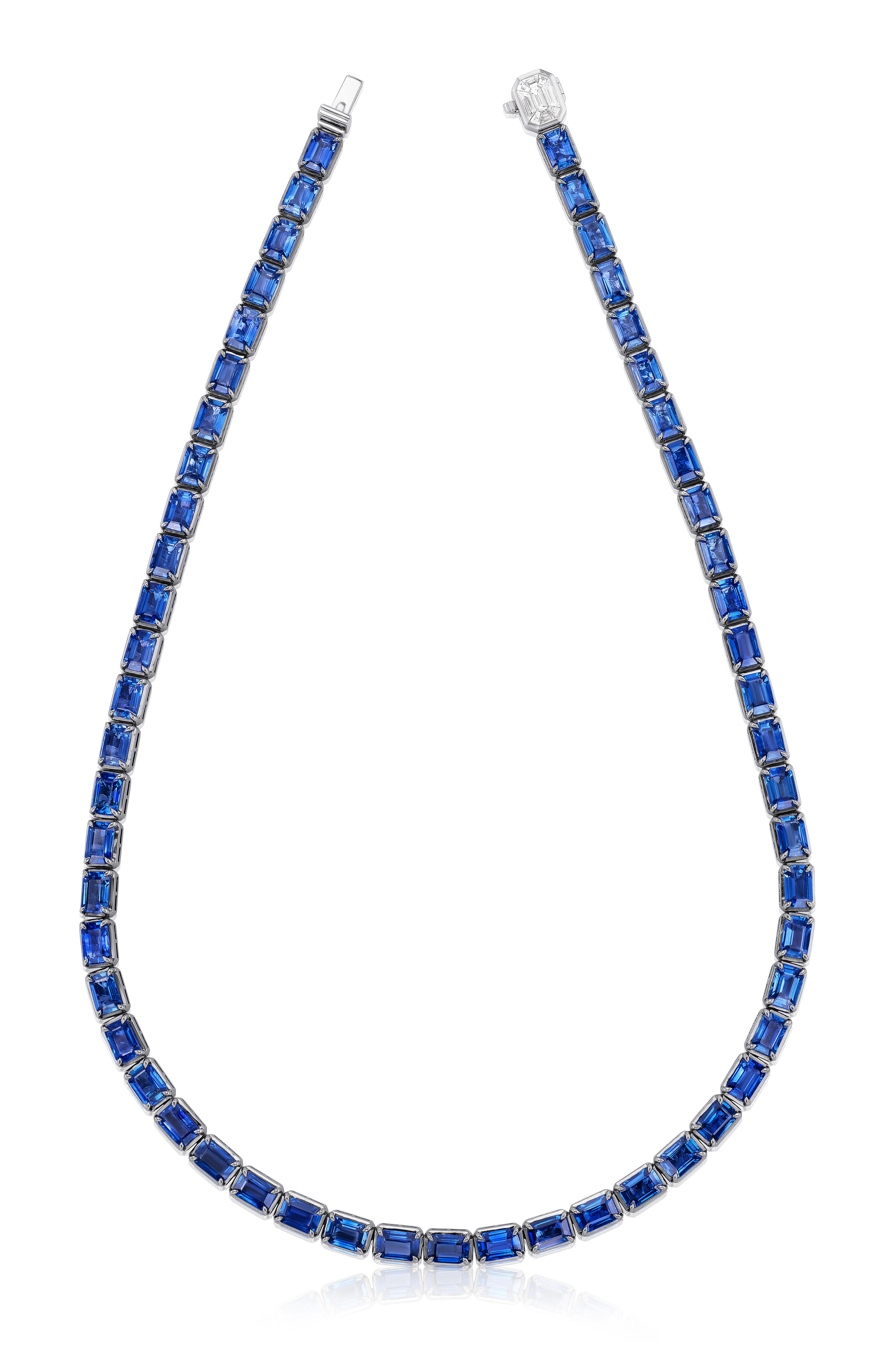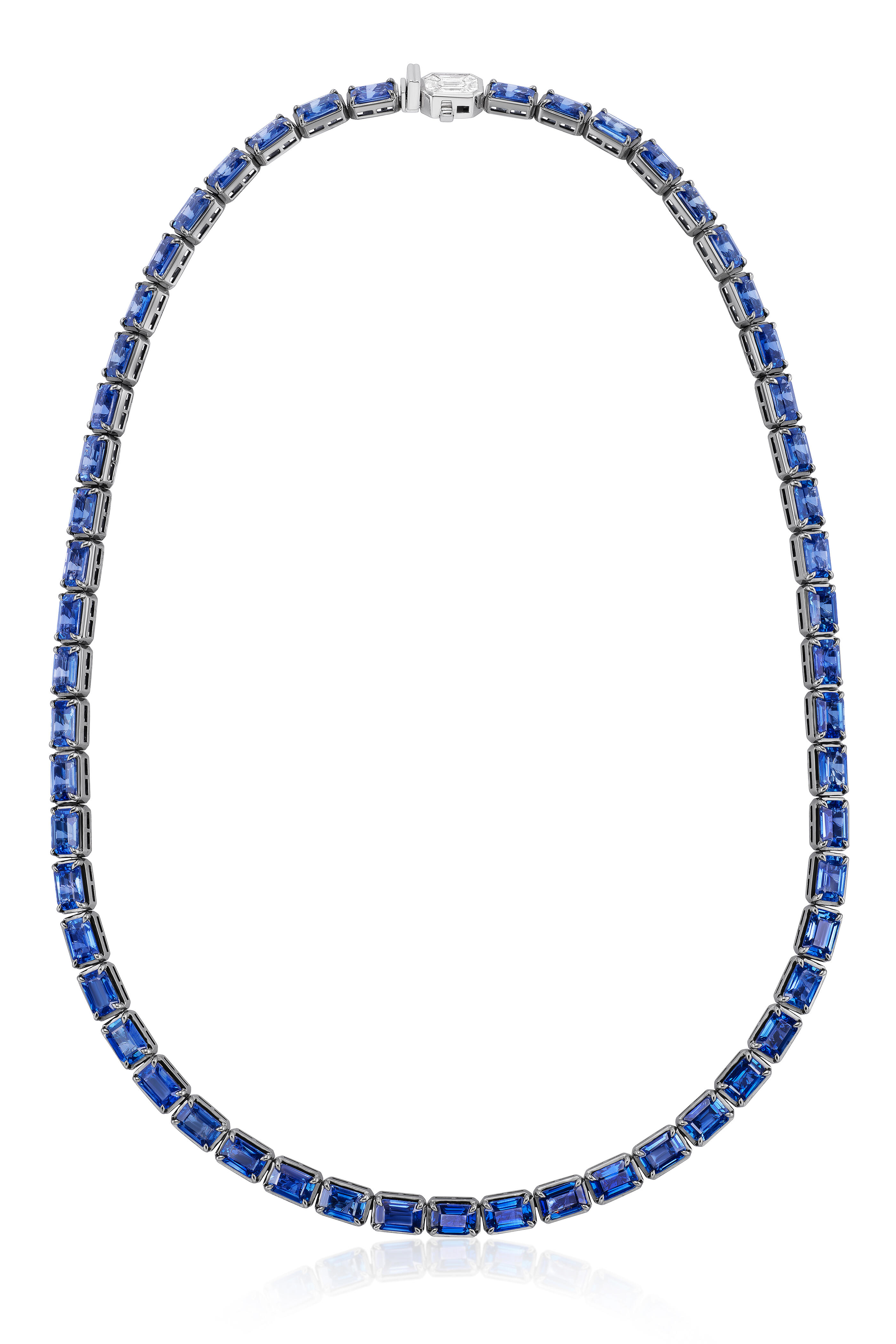 A striking expression of modern refinement, this 16-inch necklace showcases 36.71 carats of octagon-cut Ceylon blue sapphires—each precision-cut to enhance its natural geometry and vivid depth of color. The stones form a seamless, fluid silhouette that curves gracefully along the neckline, catching and reflecting light with every movement. A custom mosaic diamond lock adds an elegant flash of brilliance while maintaining the necklace’s clean, architectural lines. Crafted in 18-karat white gold with contrasting grey and white rhodium finishes, it embodies bold sophistication—stunning worn solo or layered for elevated allure.