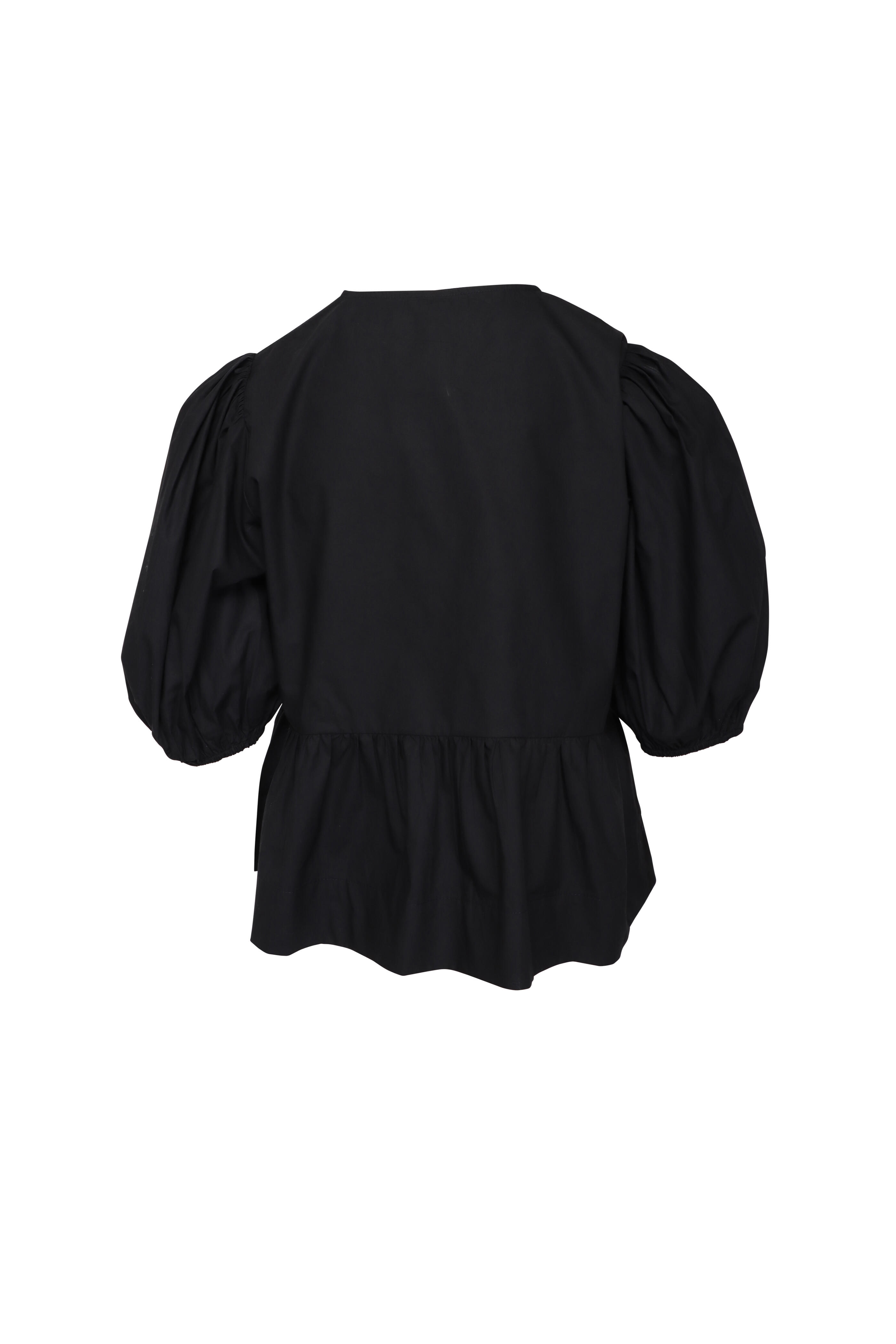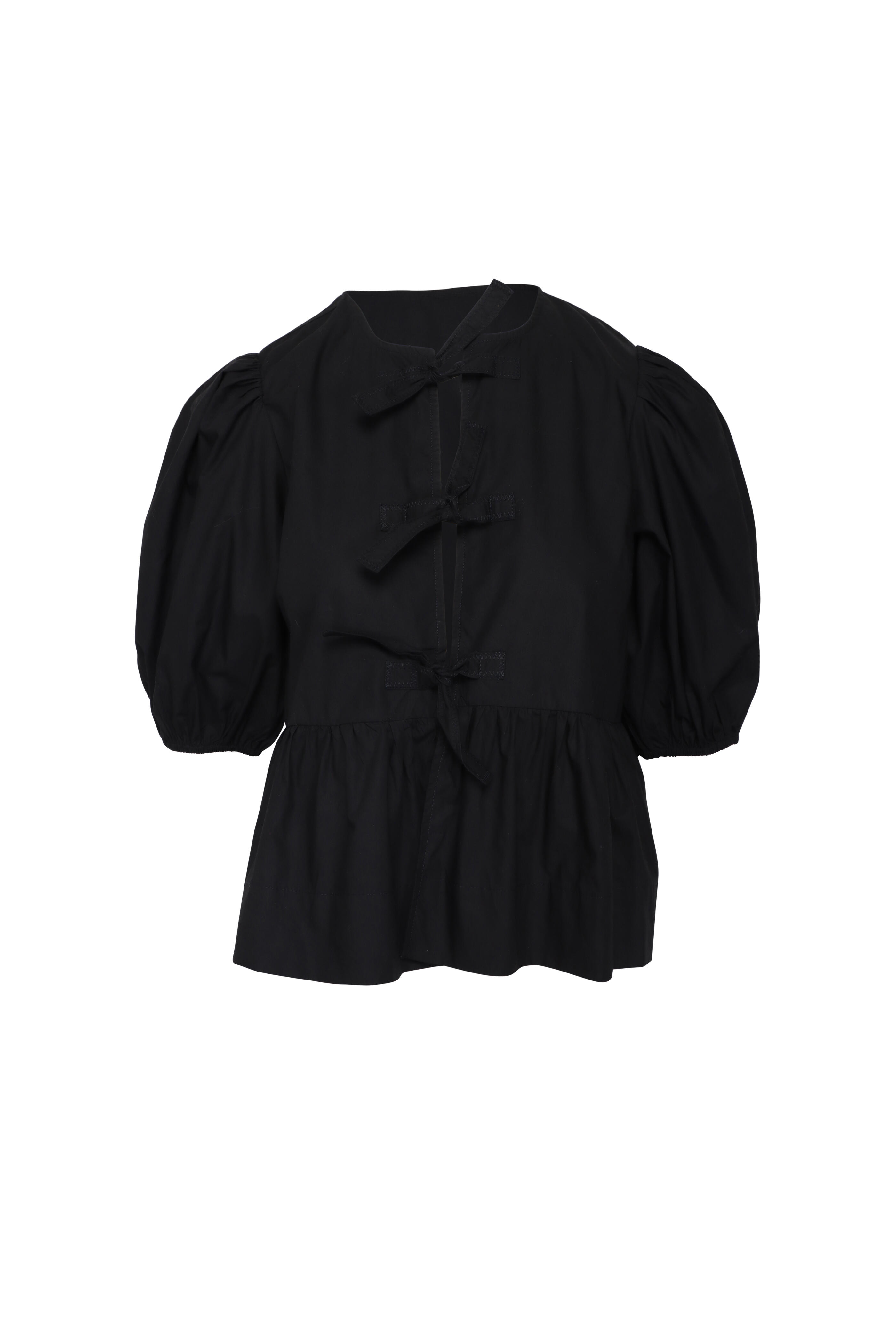 Round neck. Short puff sleeves. Front tie closure. Peplum silhouette. Imported. Bust 39” (US 4). Sleeve 15” (US 4). Length 22.5” (US 4). 100% organic cotton. Dry clean.