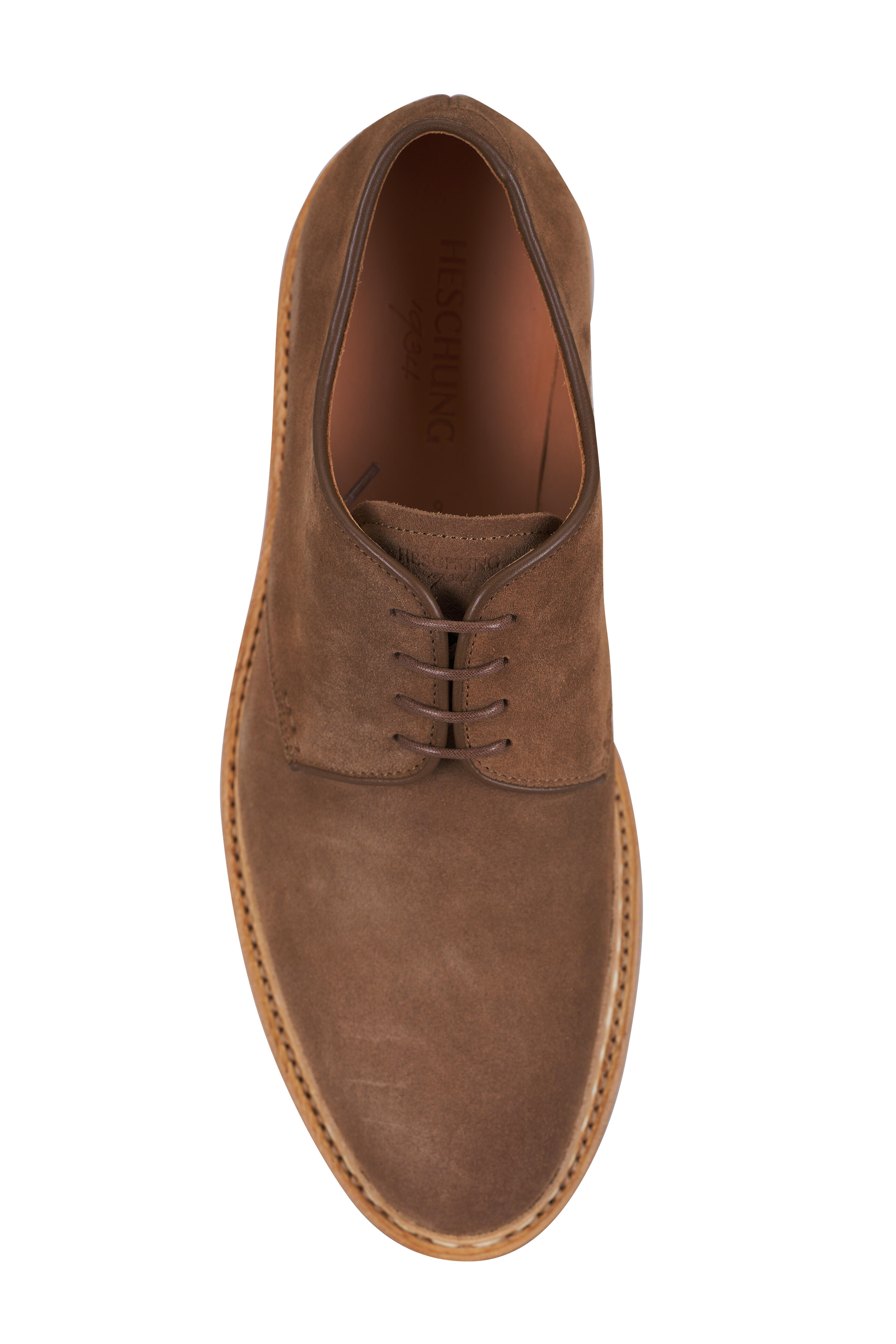 Suede upper. Round toe. Lace up closure. Leather lining and insole. Leather sole. Stacked heel. Made in France.