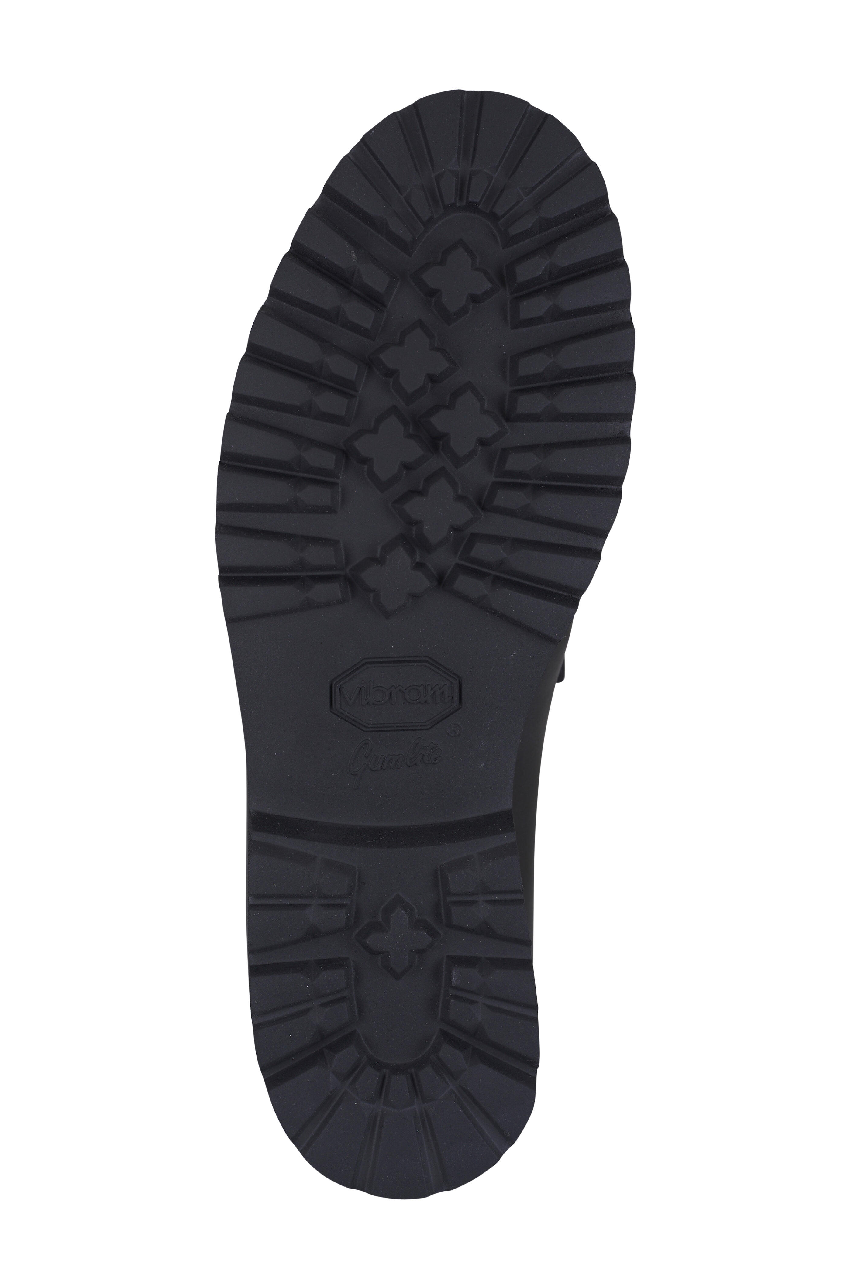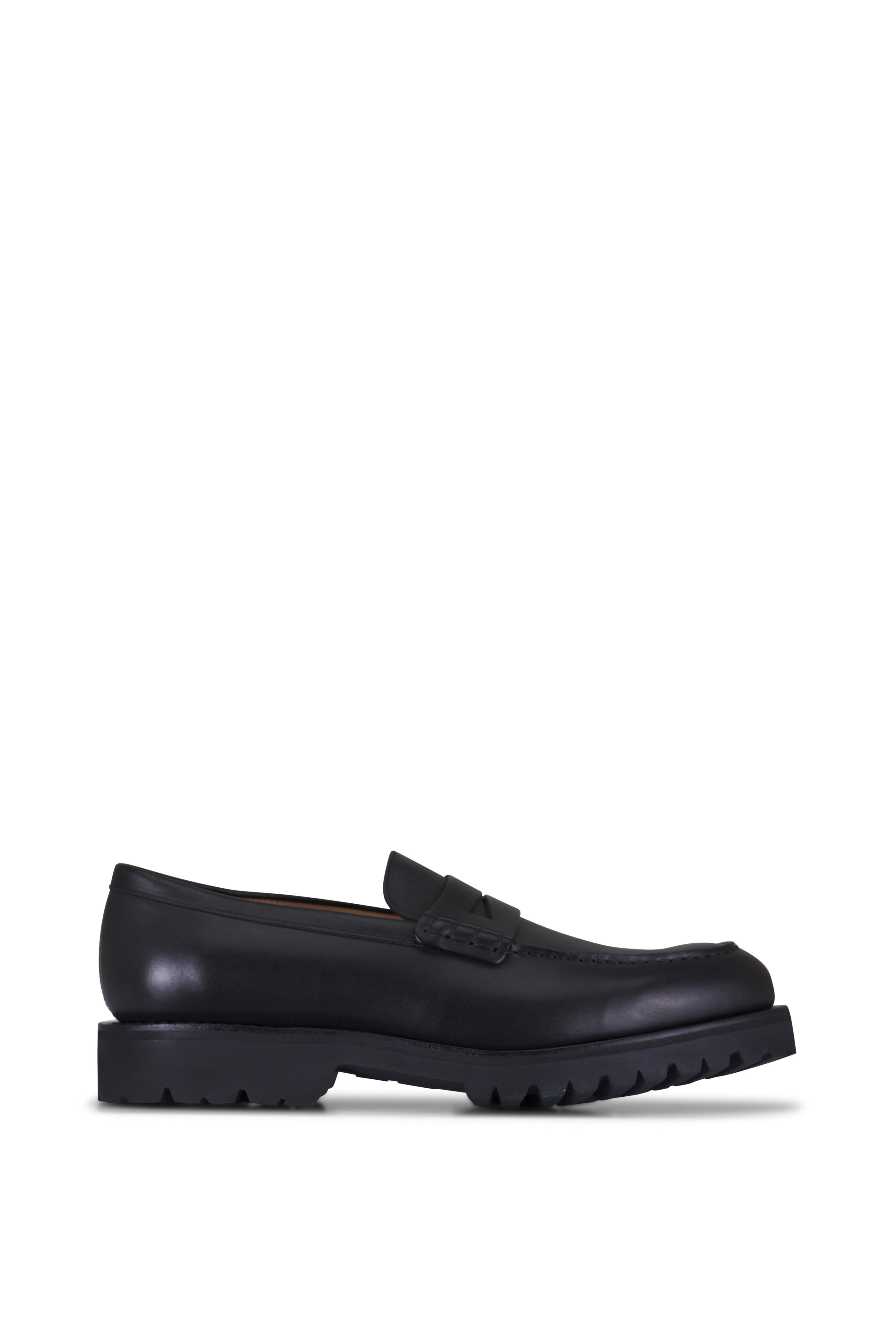 Leather upper. Moc toe. Penny strap at vamp. Leather lining and insole. Rubber lug sole. Made in France.
