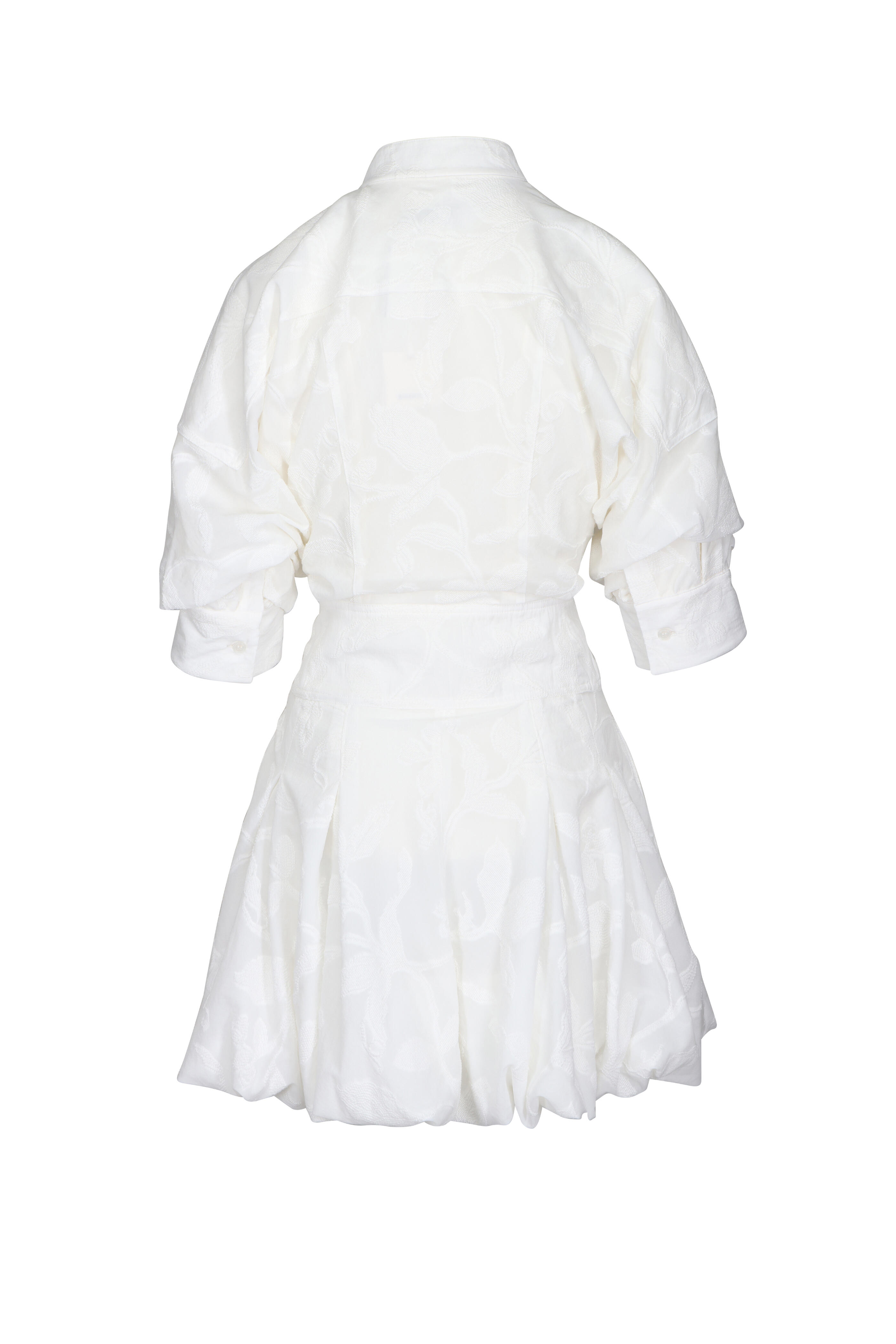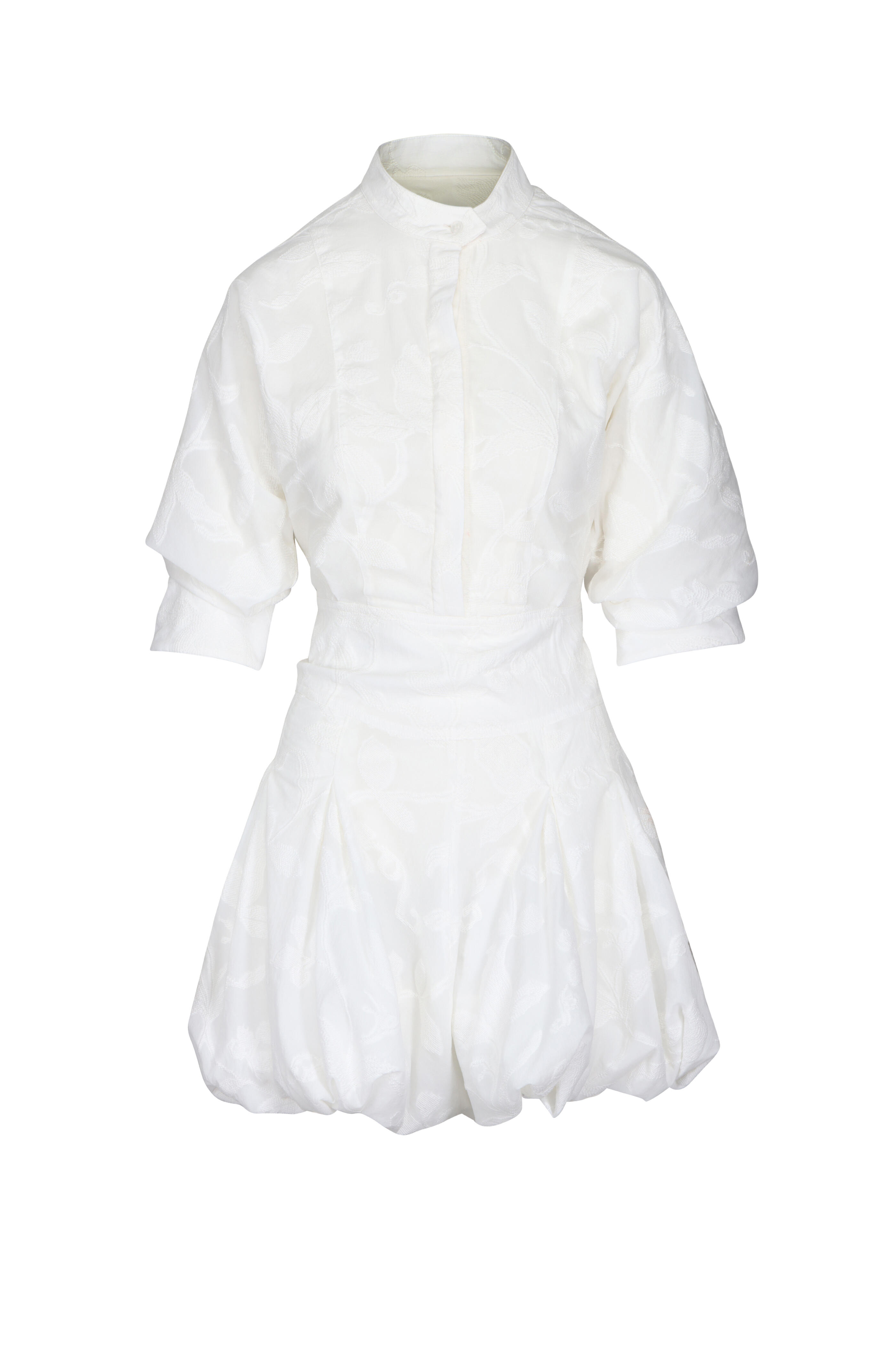 Stand collar; concealed button-front. Three quarter length sleeves. Buttoned cuffs. Bubble hem. Imported. Shoulder seam to hem measures approx. 34" in length. 63% Cotton 37% Polyester. Machine wash.