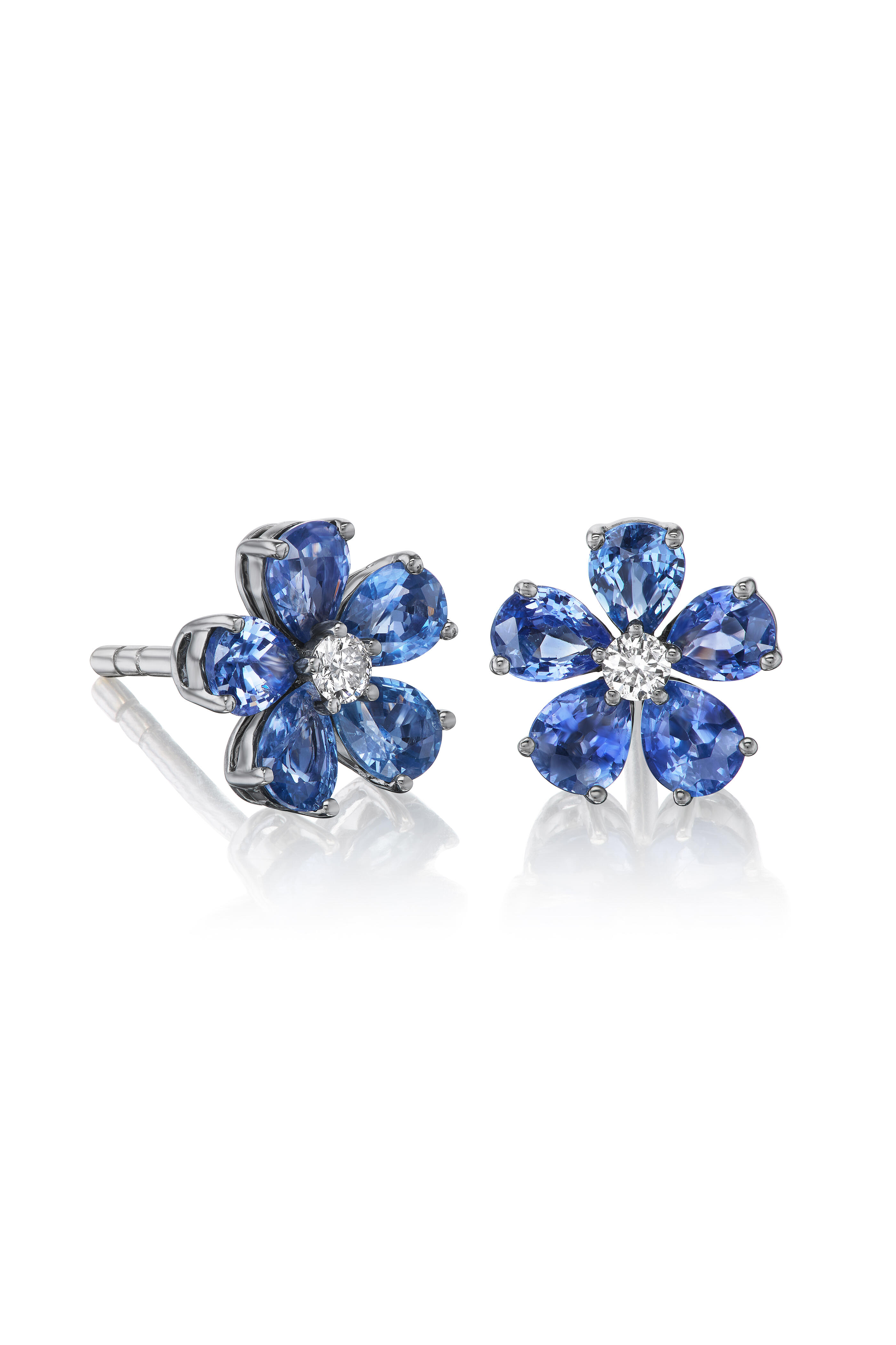 These earrings, reminiscent of wildflowers, are a new signature favorite. The elegant blossom studs are crafted from ethereal pear-shaped blue sapphires, arranged in a radiant floral silhouette. A round diamond center adds a subtle touch of brilliance. A sought-after design, available in multiple sizes, stones, and metals—as well as a matching necklace and ring.