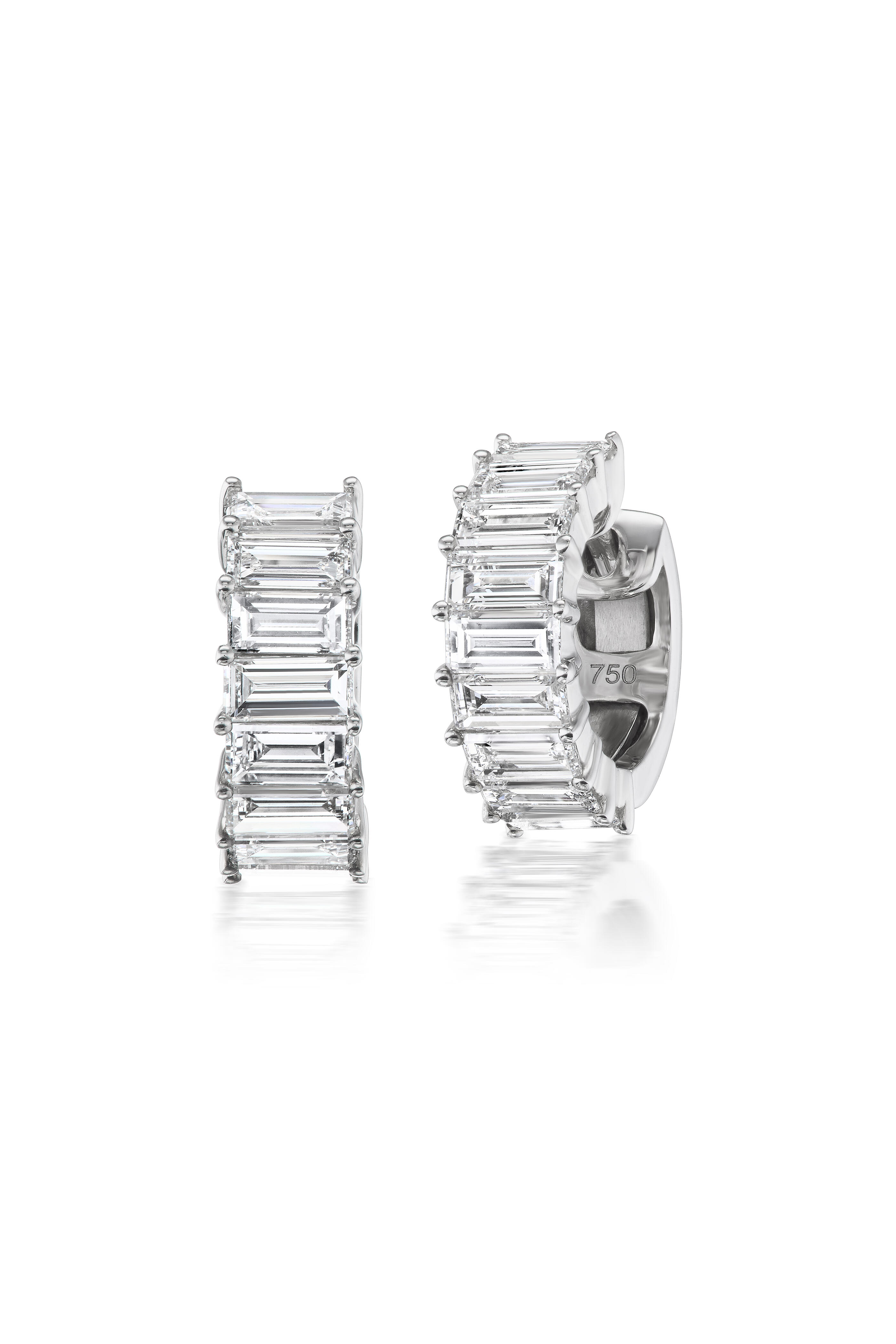 Designed to hug the ear, these classic mini hoops feature brilliant white diamond baguettes horizontally set. The diamonds sit in an 18-karat polished white gold prong setting. A perfect addition to your day-to-evening wardrobe.