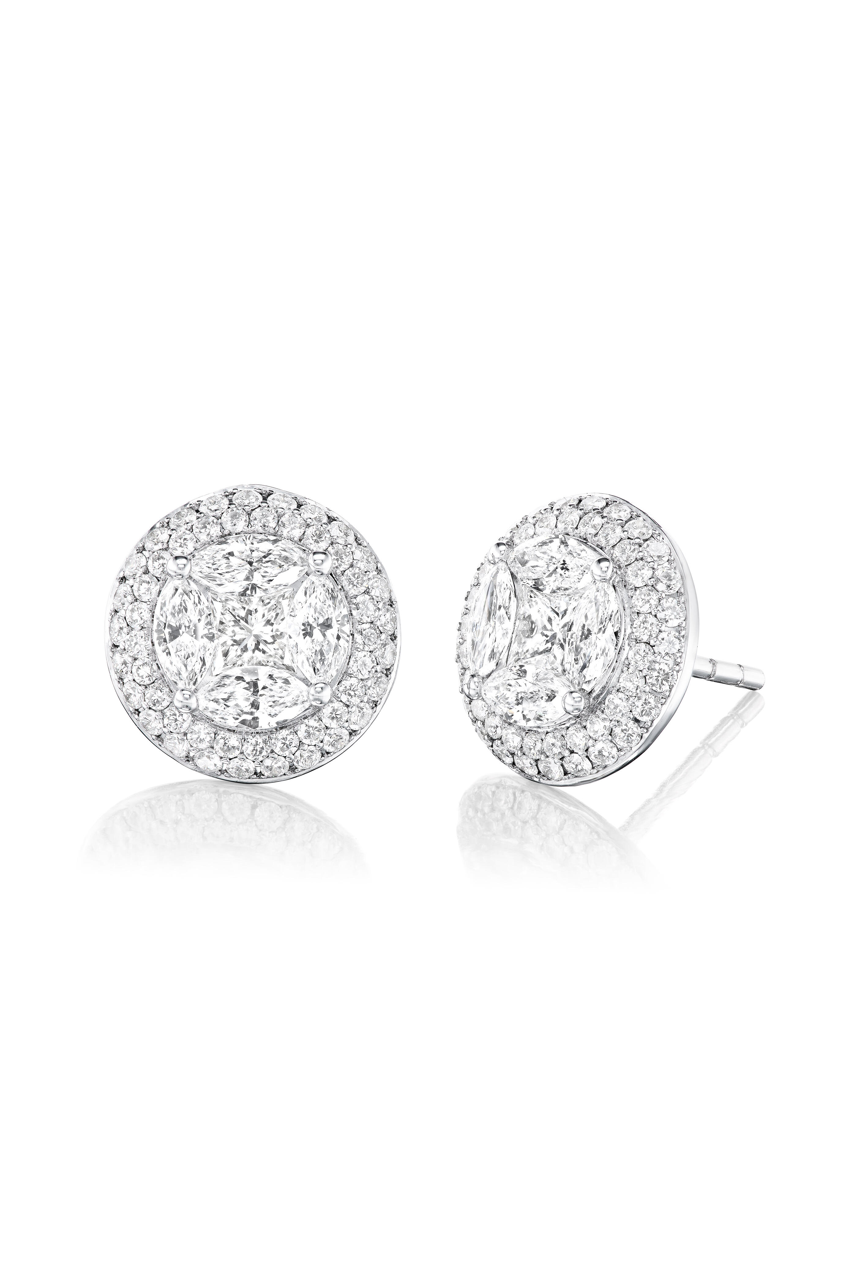 Our bestseller. Designed as a seamless illusion of a single radiant gem, these studs feature 2.02 carats of clustered white diamonds, invisibly set to mimic the look of a 2-carat solitaire center stone, and framed by a halo of pavé diamonds. Crafted in 18k white gold, they embody luminous brilliance in a refined, modern silhouette.