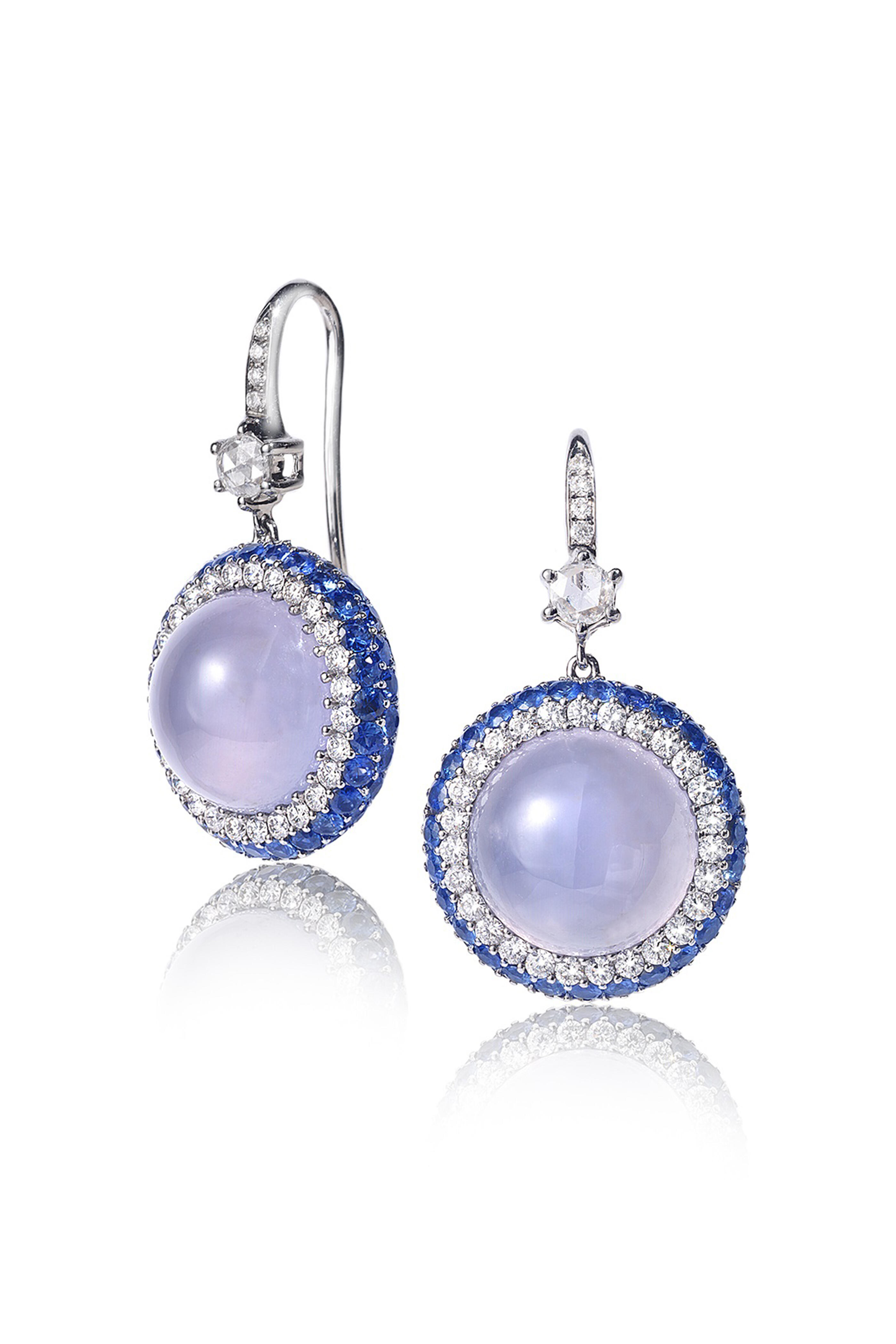Centered on a total 13.52 carats of luminous round chalcedony, these drop earrings are framed first by a ring of white diamonds and then by blue Nigerian sapphires. The triple-layered setting—sapphire, diamond, chalcedony—gives the piece its name and its impact. Suspended from a pavé diamond wire, this 18k white gold silhouette is finished with grey and white rhodium for a subtle, moody edge.