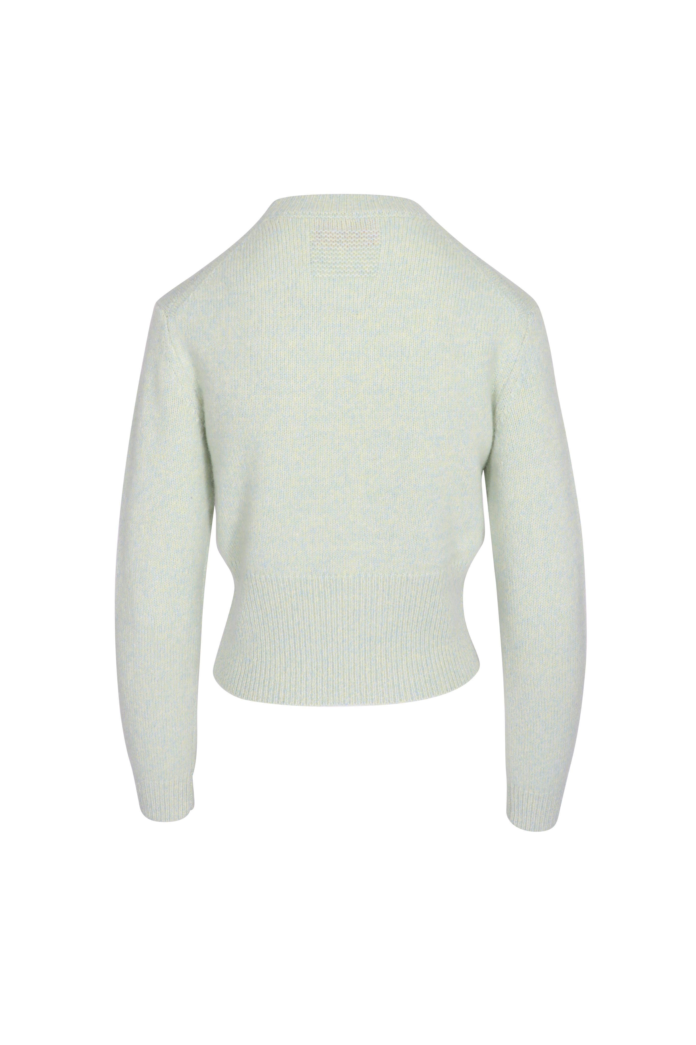 Crewneck. Long sleeves. Shrunken fit. Ribbed neck, cuffs, and hem. Imported. Cropped length. 75% cashmere, 25% silk. Dry clean.