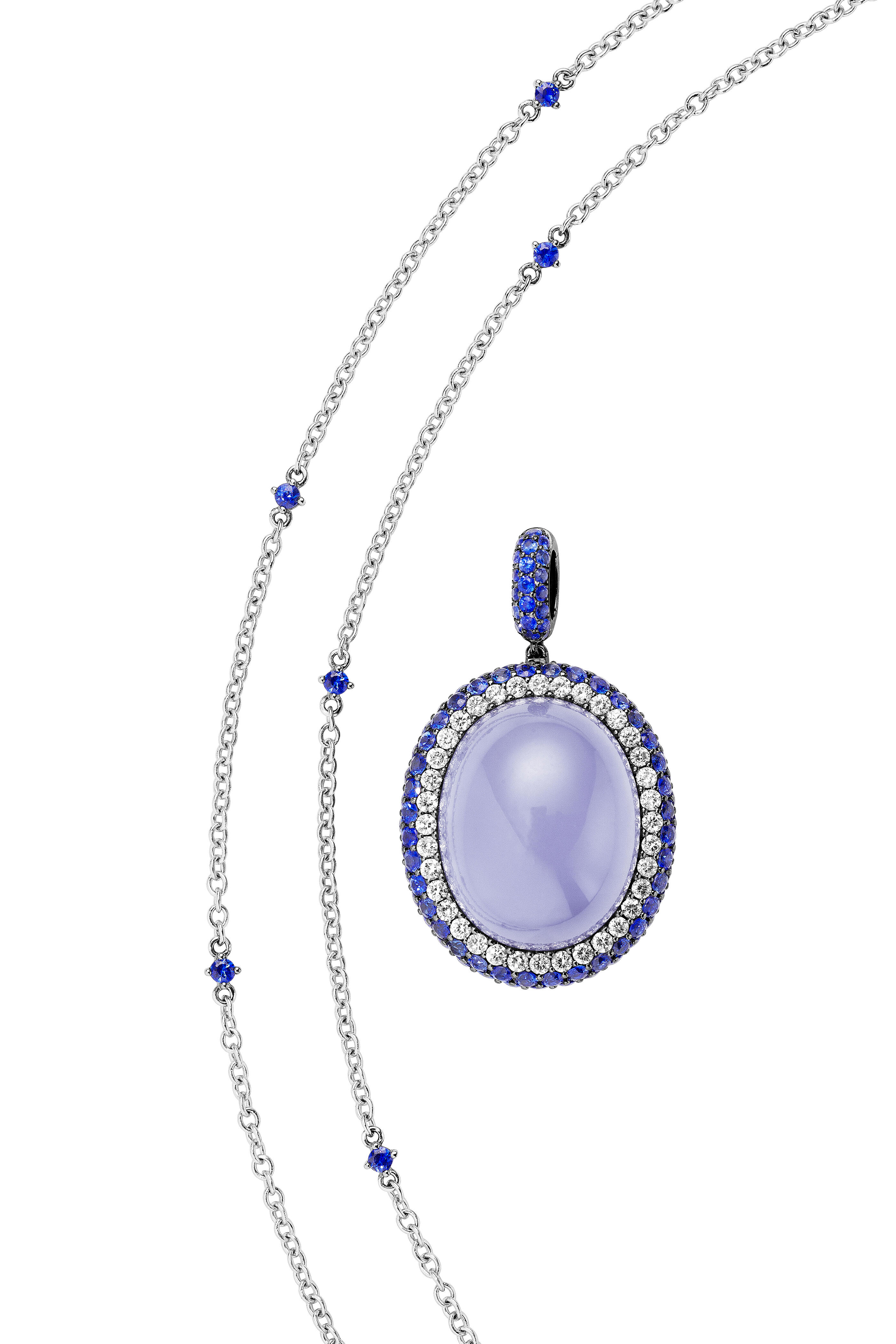 Anchored by a 24.21-carat cabochon chalcedony, this detachable oval shape pendant is encircled in a double halo—first, white diamonds, then a border of rich blue sapphires, all set in 18k white gold with grey and white rhodium. A sapphire-set bale connects to an adjustable chain, accented with sapphire stations throughout. Designed to wear alone or swap onto other chains, this collector's piece is as versatile as it is bold.