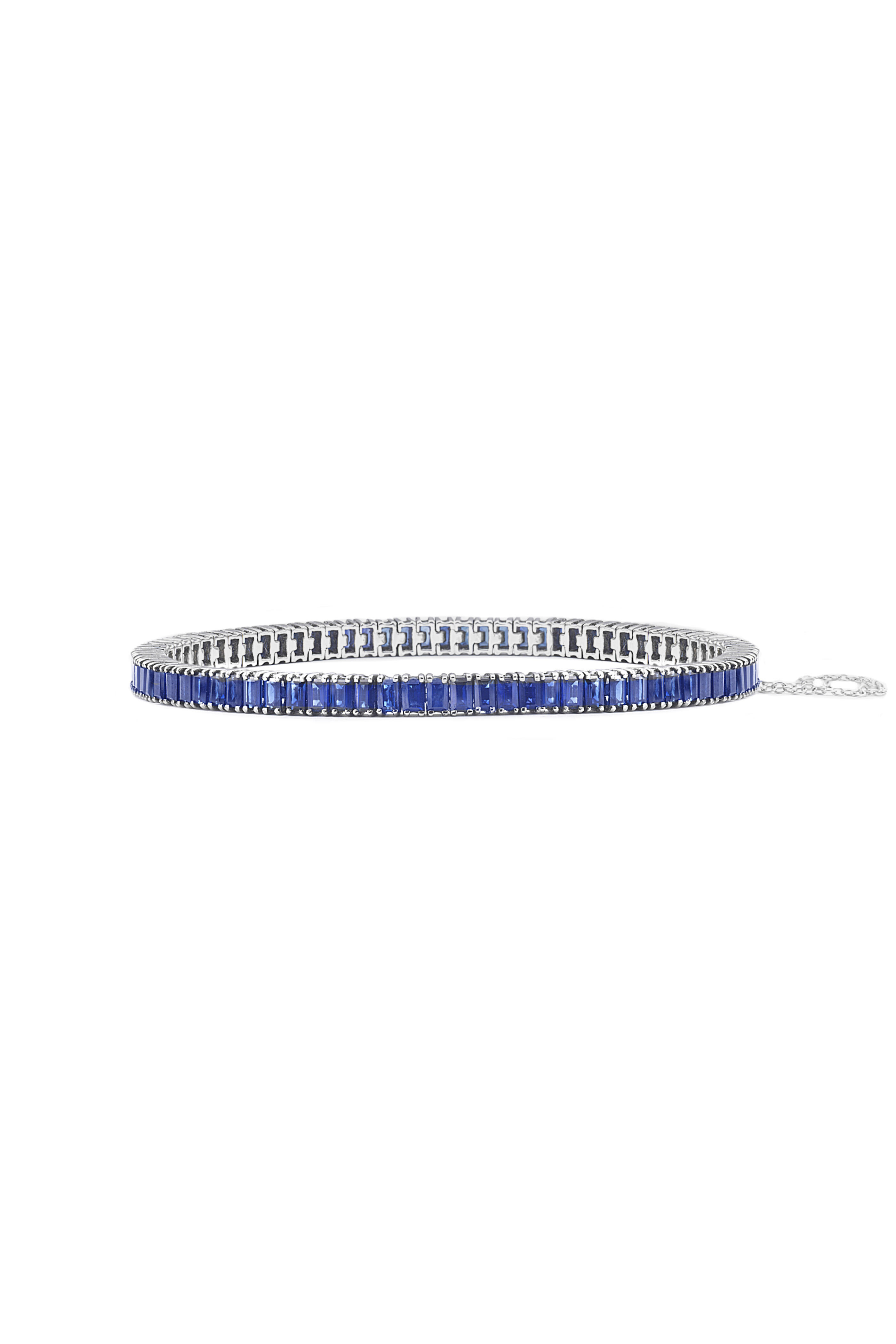 An elegant line of emerald-cut blue sapphires—totaling 9 carats—radiates with deep, saturated color, set in 18K white gold with grey and white rhodium finish. A touch of white diamonds adds refined brilliance. Finished with a delicate chain for extra security, this tennis bracelet is a modern statement of effortless luxury—perfect worn solo or layered for high-impact glamour.