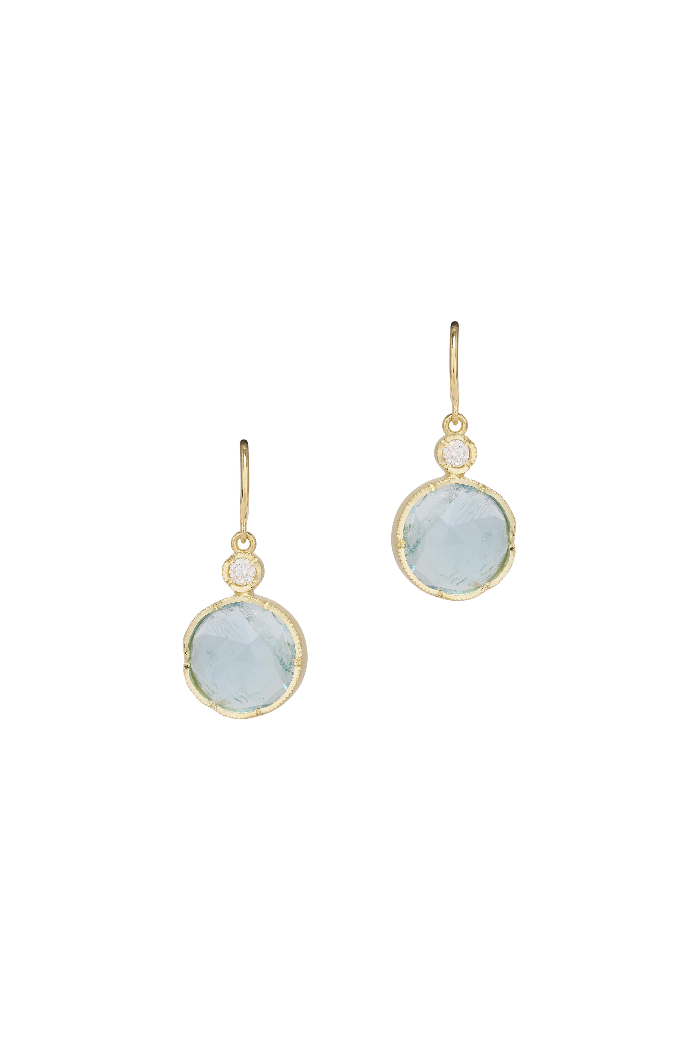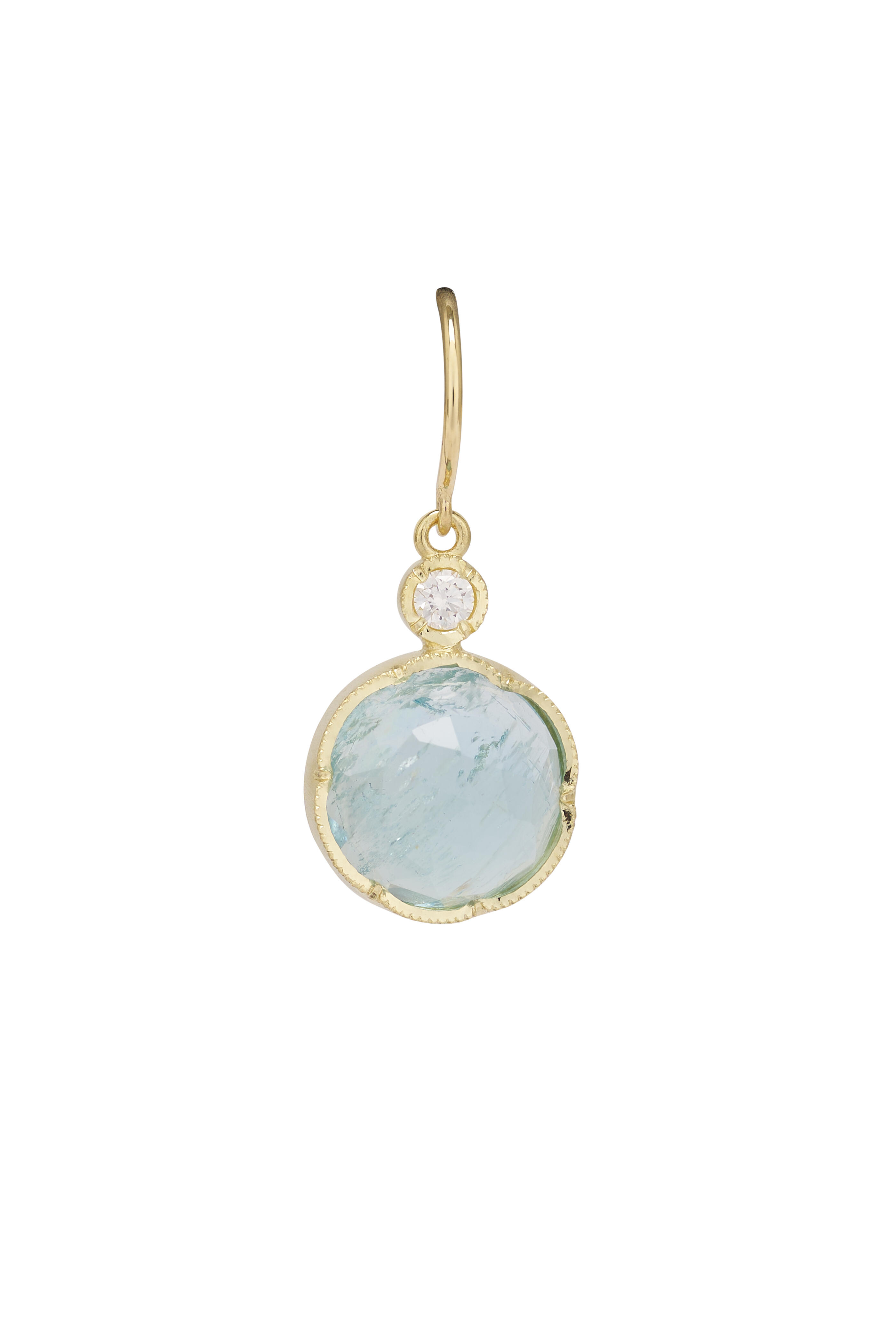 18k yellow gold. 11mm aquamarine. .16ct diamond.