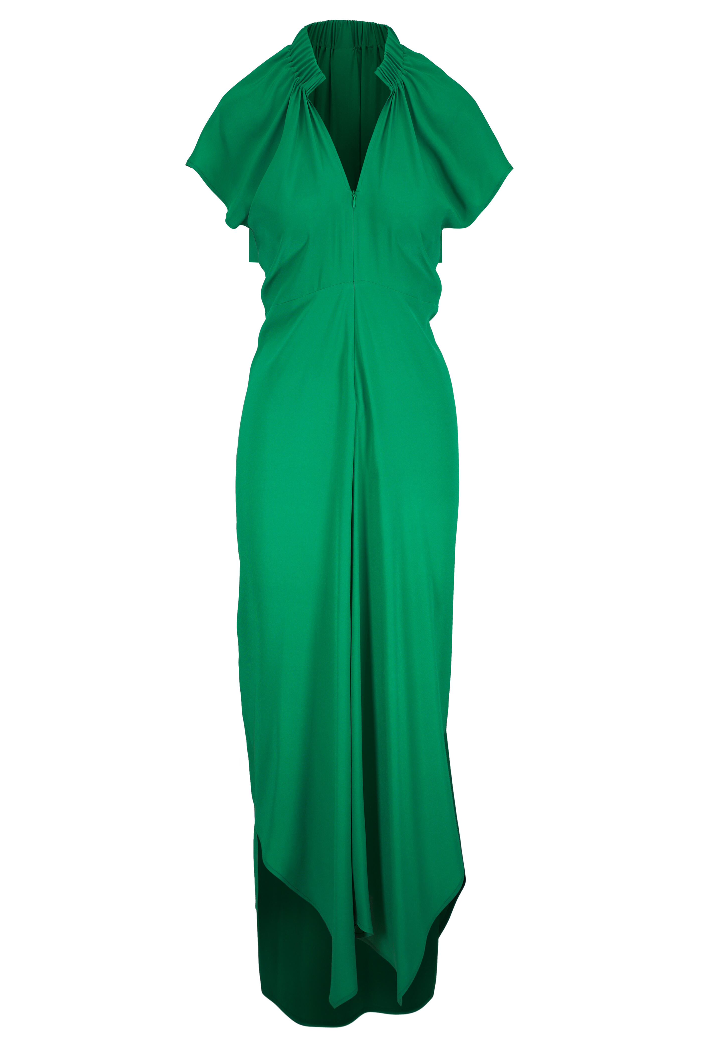 V-neckline; elasticized back neck. Concealed front zip. Vented hem. Made in the USA. 56" shoulder to hem. 95% silk, 5% elastane. Dry clean.