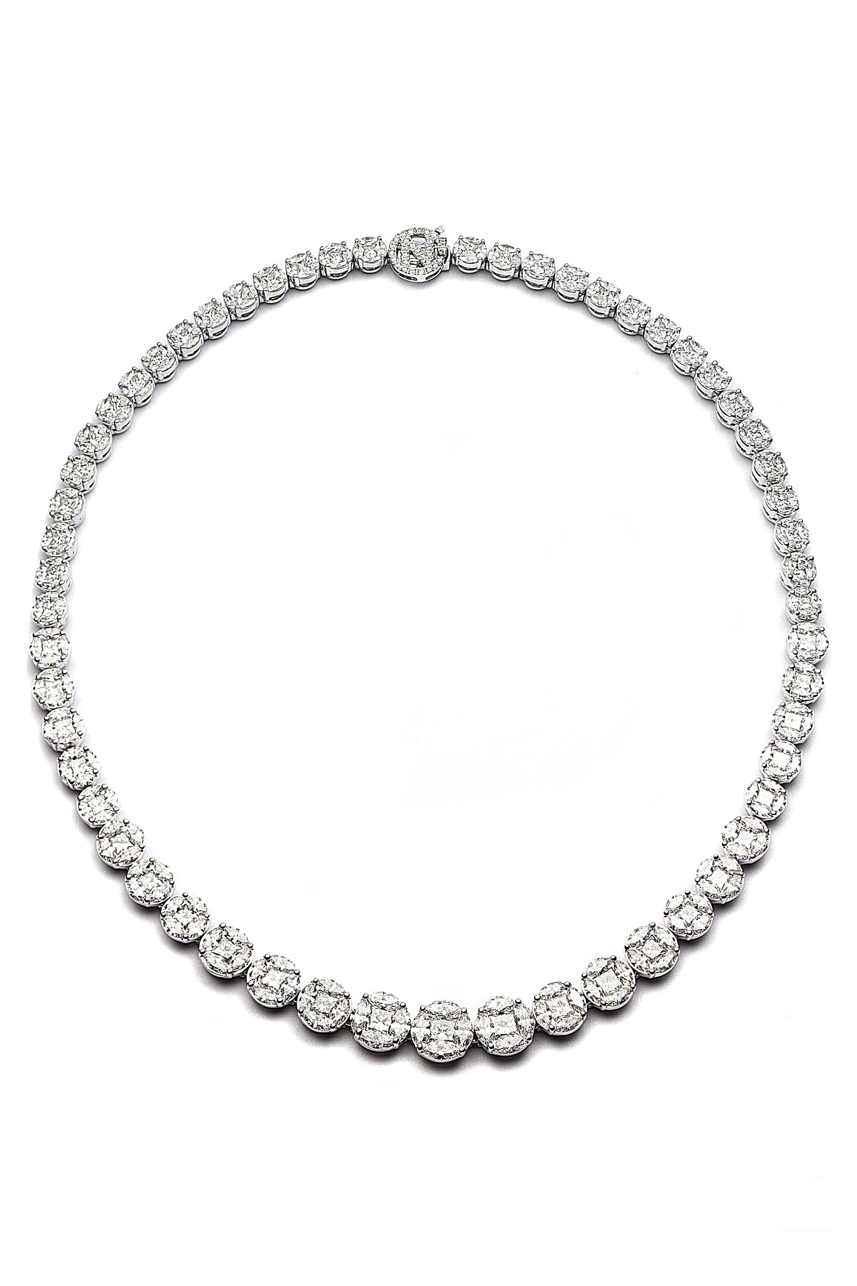 Classic in design, this stunning Rivera necklace features 18.34 carats of VS/G,F color brilliant diamonds invisibly set in 18K white gold. Designed to create the illusion of a flawless, unbroken line, it frame the neckline with luminous brilliance - a timeless piece to treasure for generations.