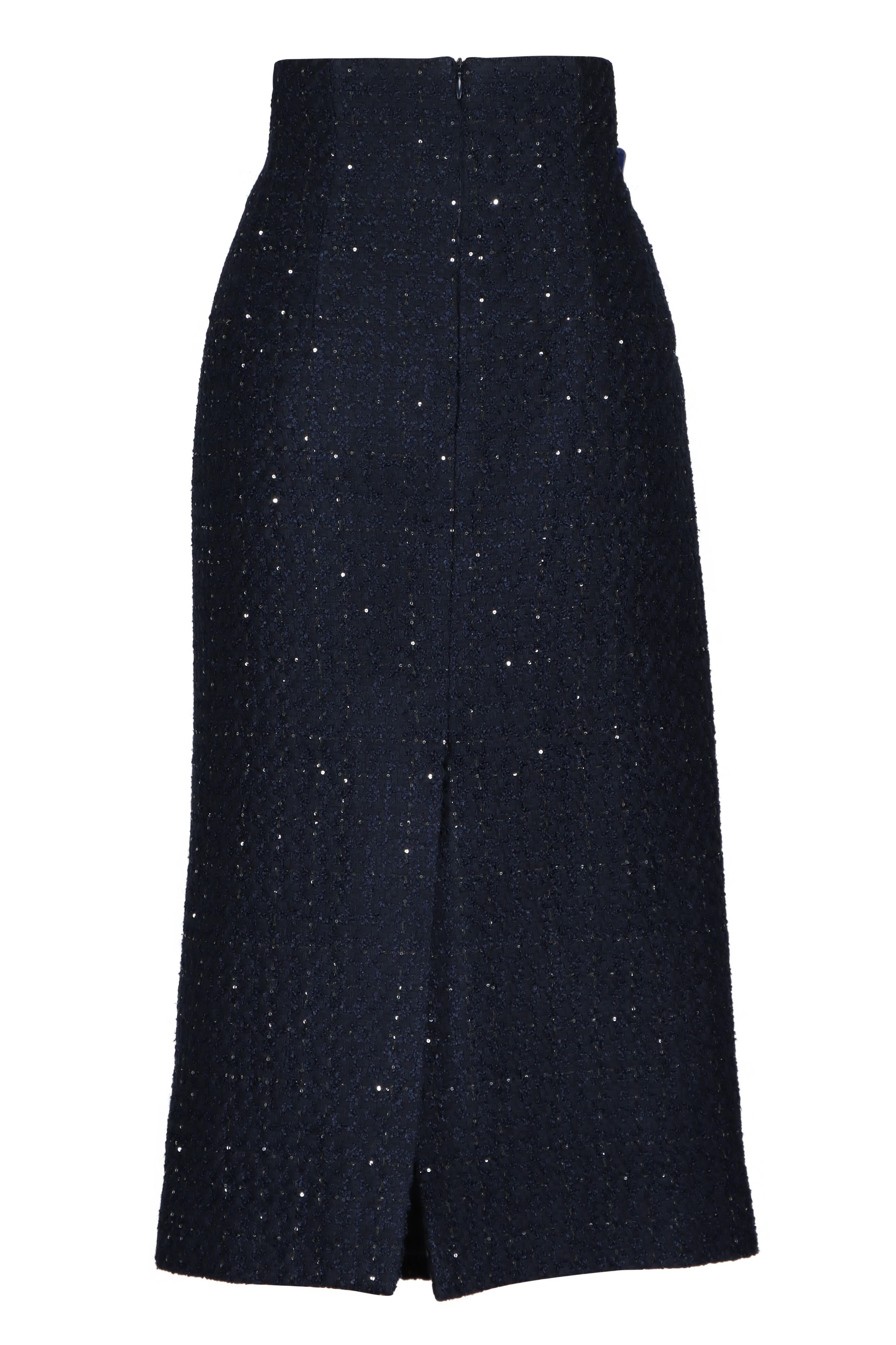 Concealed back zip. Straight hem with center back slit. All over sequin detailing. Made in Italy. 36% viscose, 22% linen, 18% cotton, 13% silk, 9% nylon, 2% metallic. Dry clean. Dry clean.