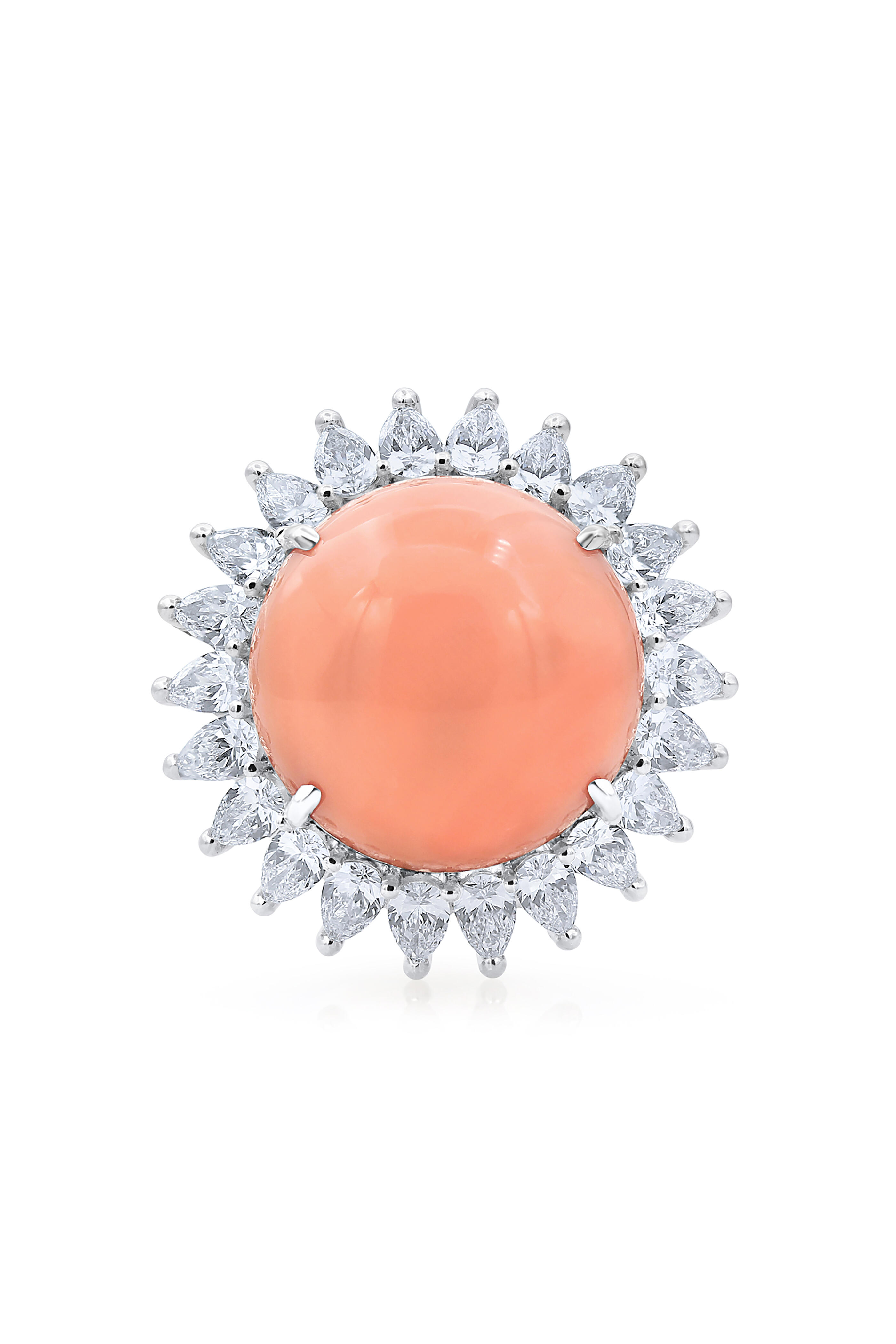 Platinum. 27.71 ct Round Coral. 3.26 ct Pear Shape Diamond F/VS.