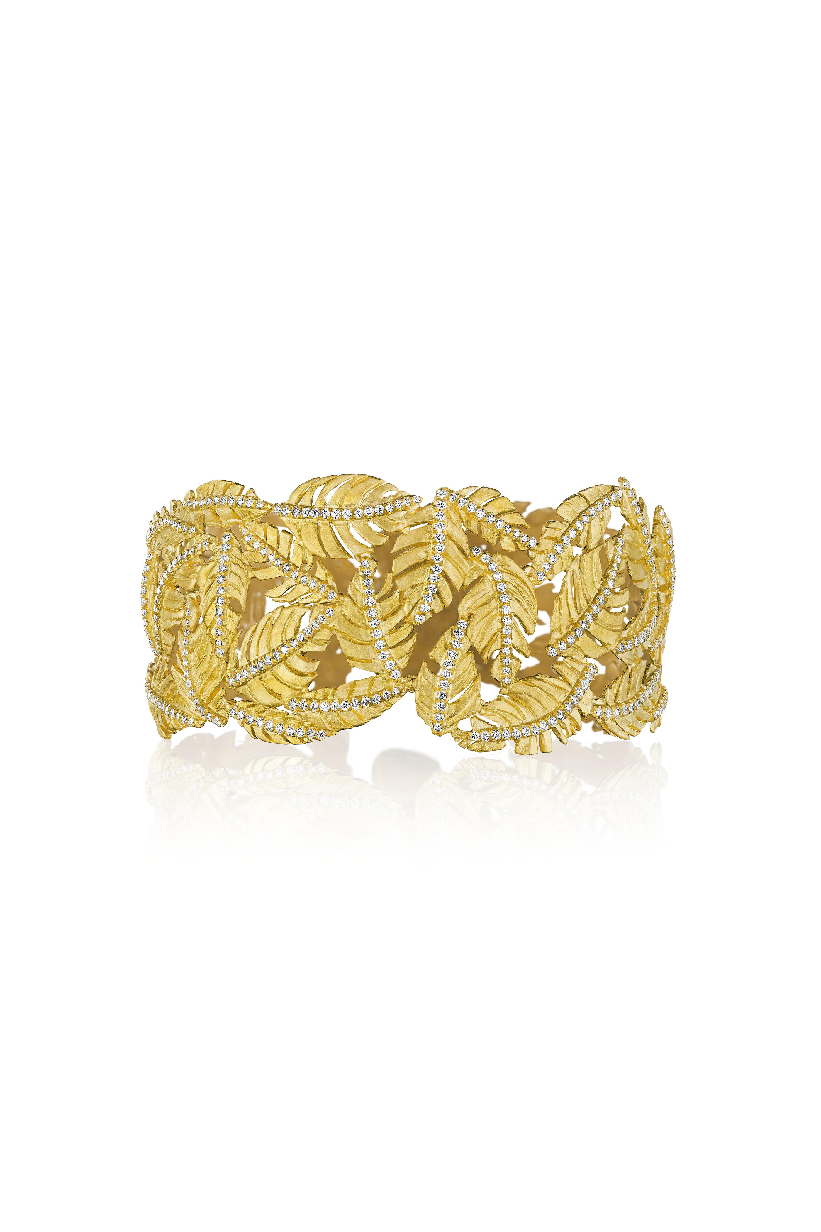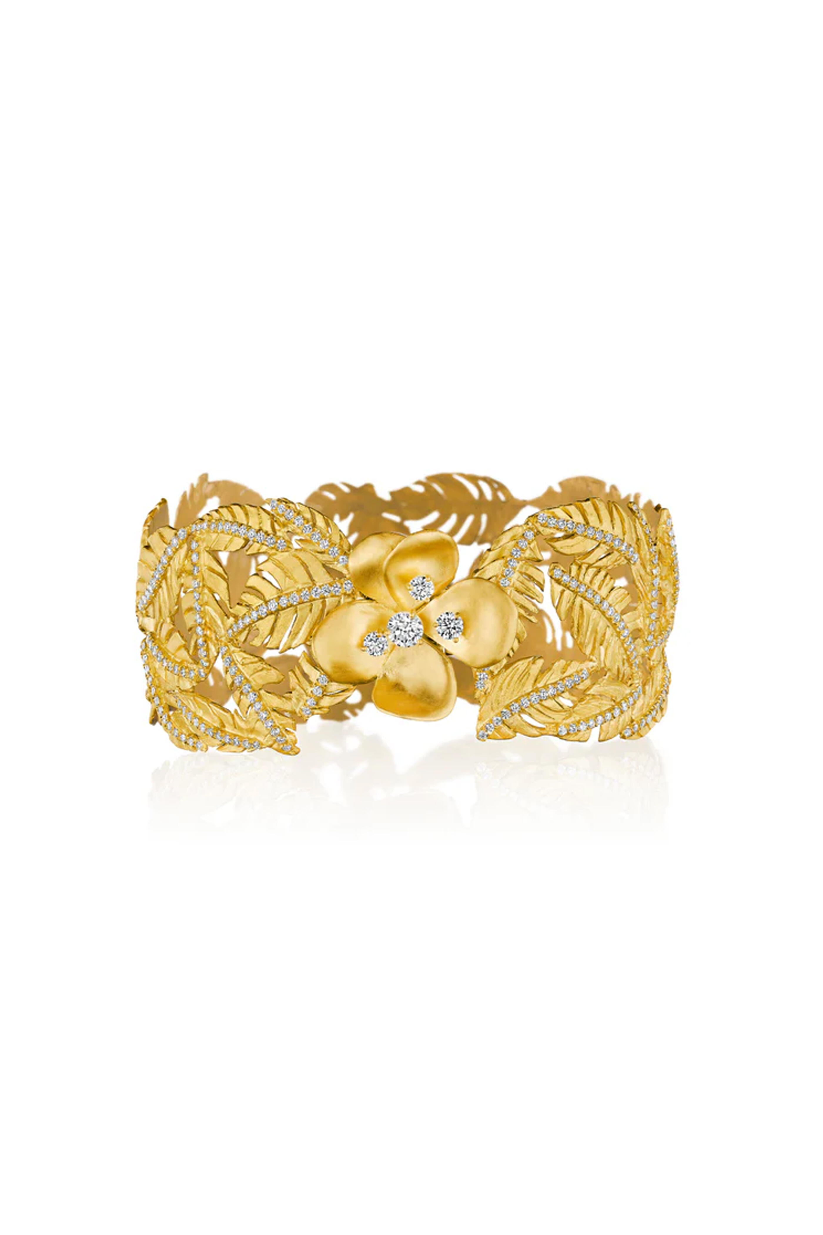 22k gold. Diamond 39.73 total carat weight. Pavé diamonds. Leaf design. Engraved detailing. Cuff style. Prong setting. Flower lock clasps. One of a kind. Made in the USA.