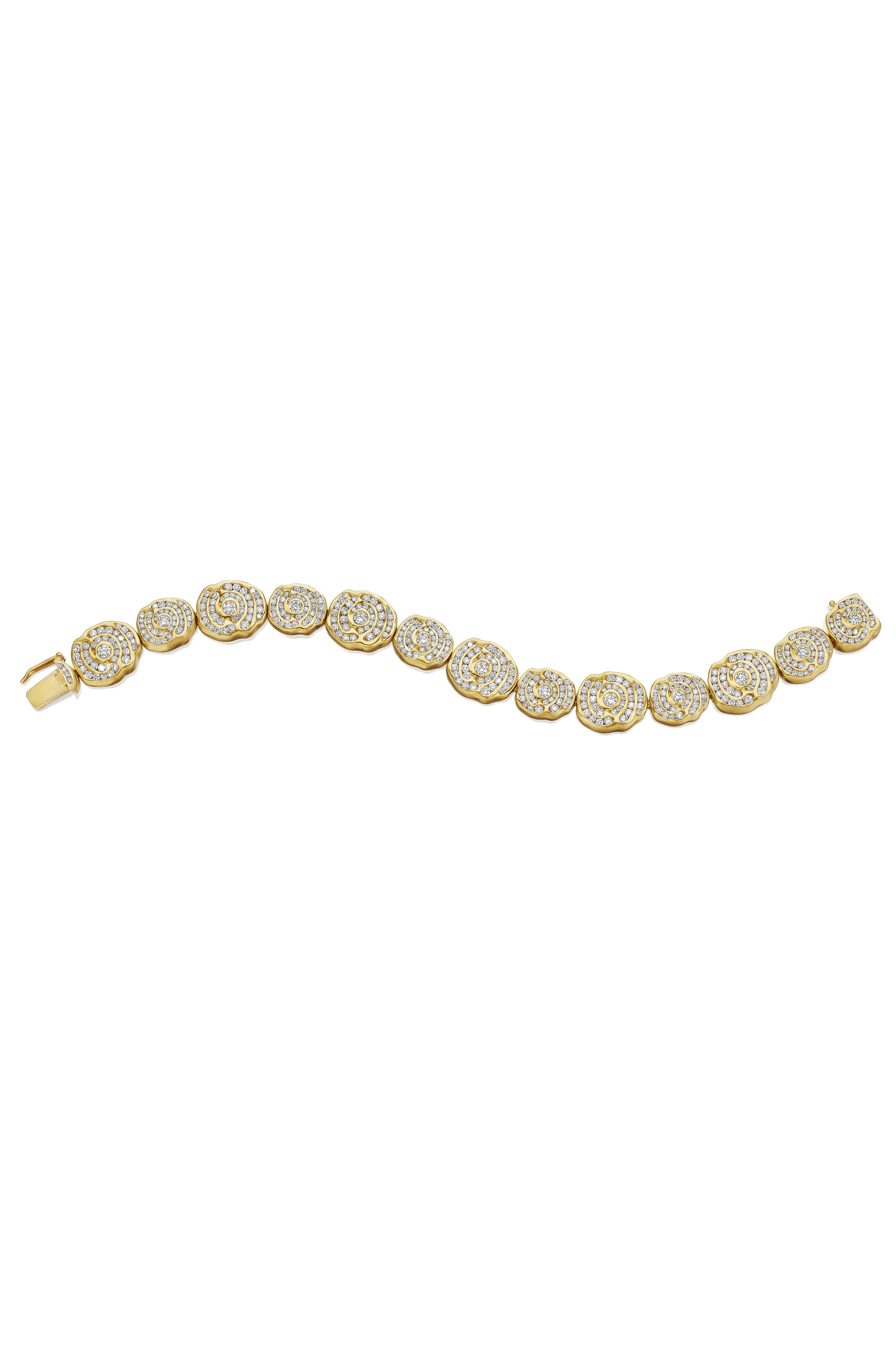 22k gold. Diamond 9.63 total cart weight. Pavé set of diamonds. Ranunculus design. Tennis style. Prong setting. Box clasps with lock. Made in the USA.