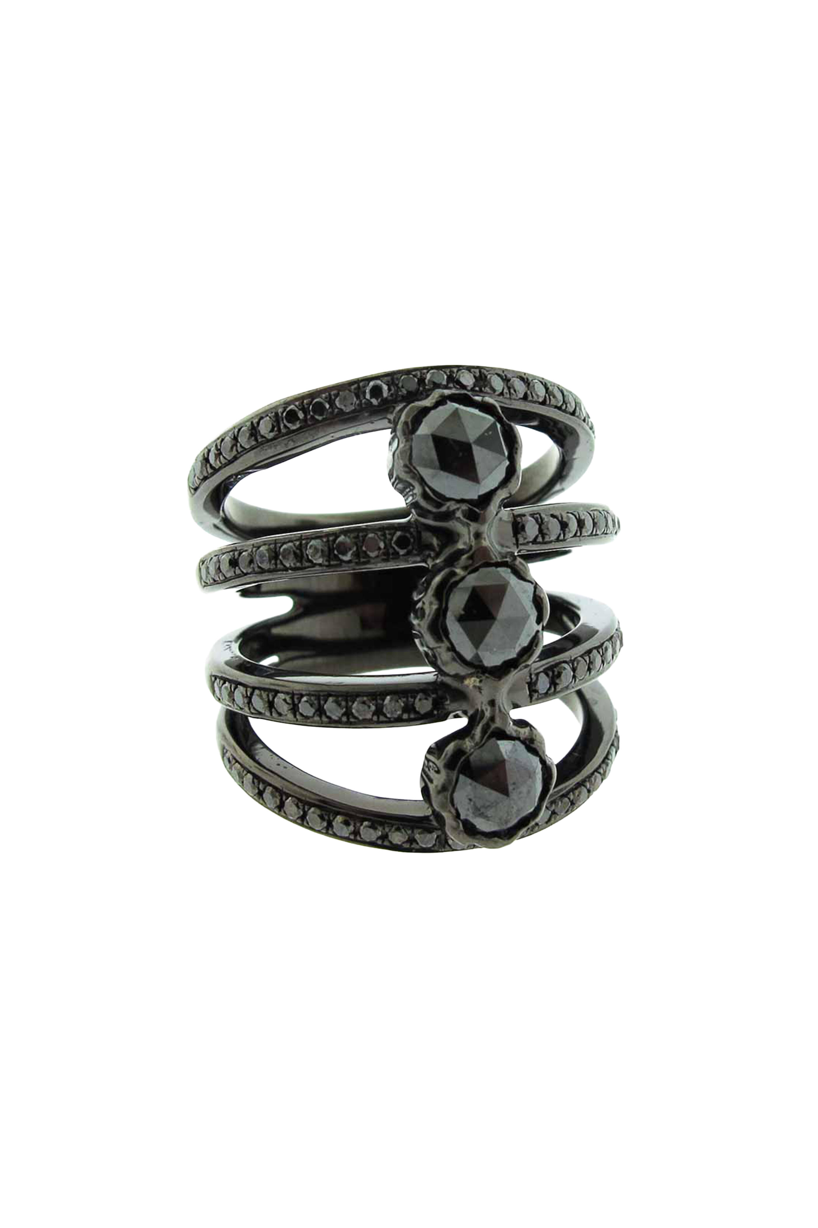 14k white gold. Black rhodium finish. .70ct black diamonds. 1.99ct round cut black diamonds.