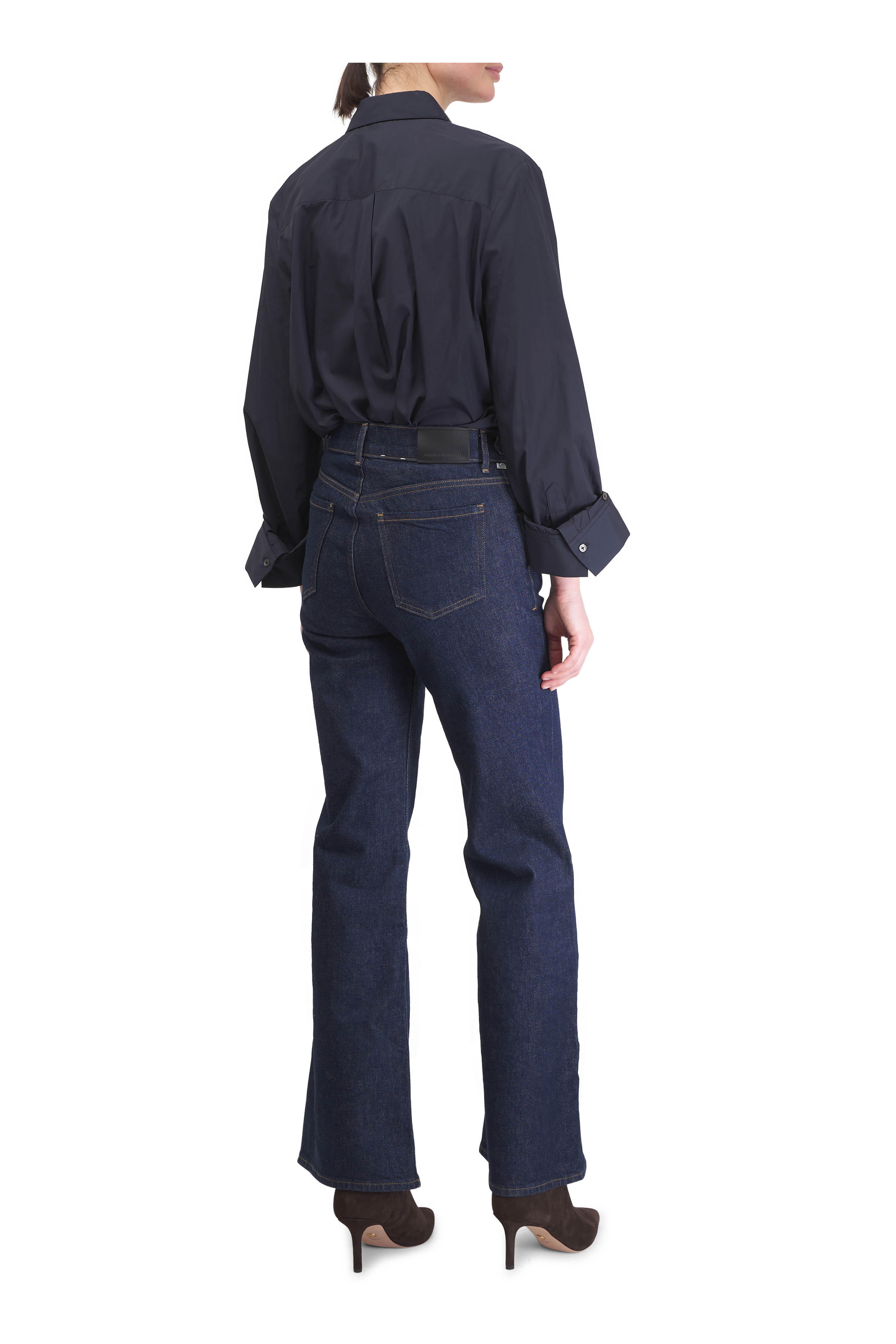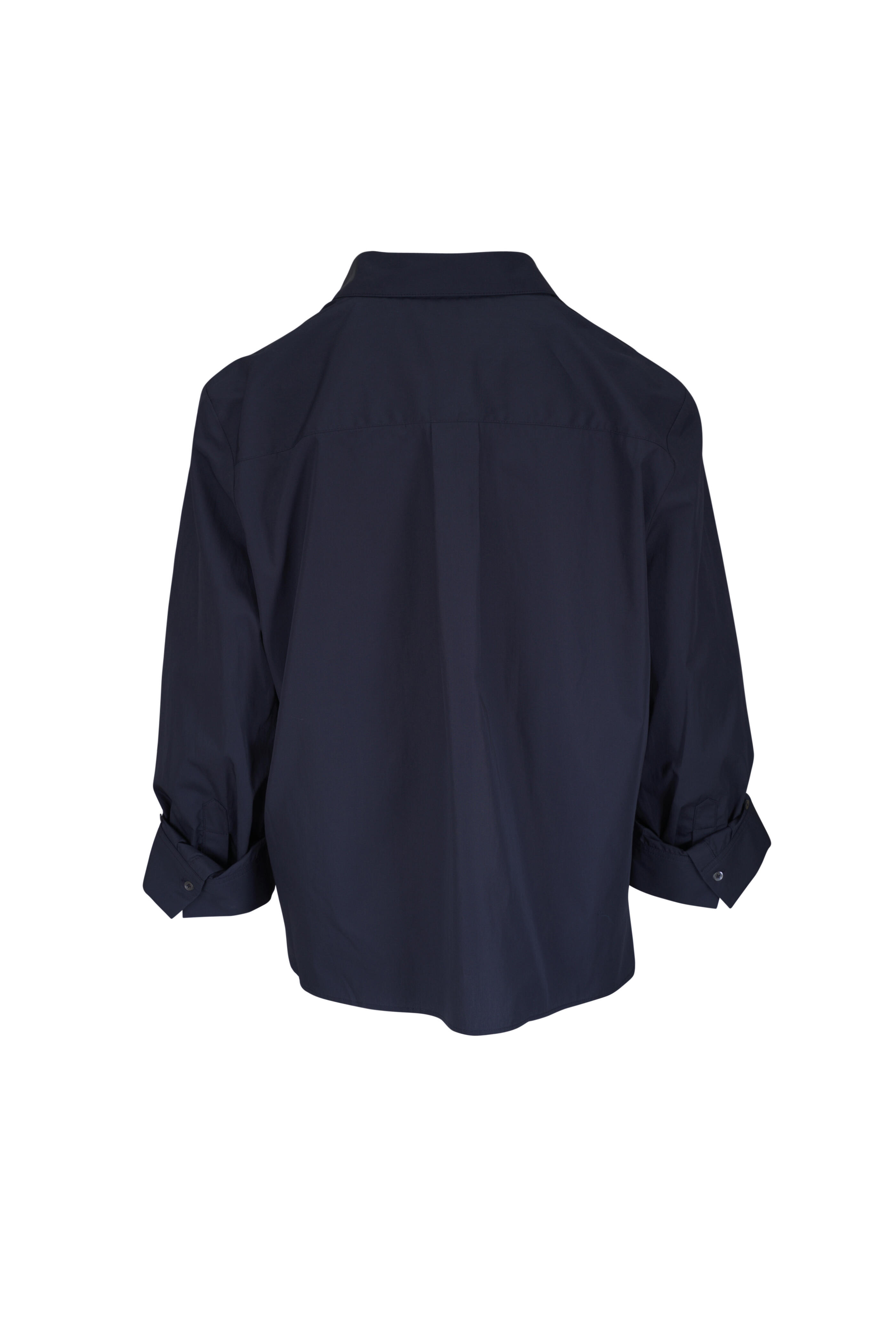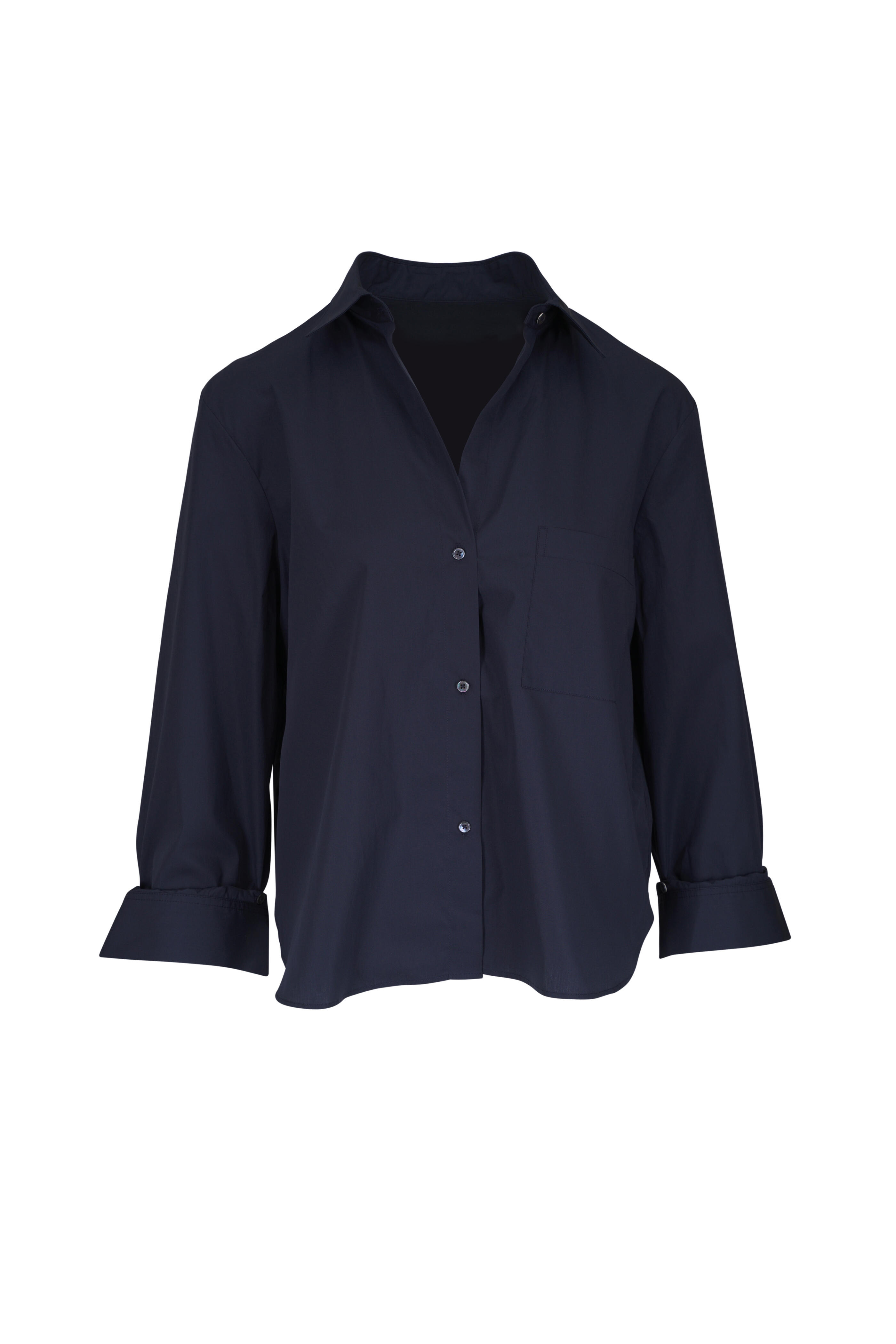Spread collar. Front button placket. Chest patch pocket. Single roll button cuffs. Center box pleat at the back. Rounded hem. Made in the USA. Approximately 27" shoulder to hem (measurements taken from size XS/S). 100% cotton. Machine wash.