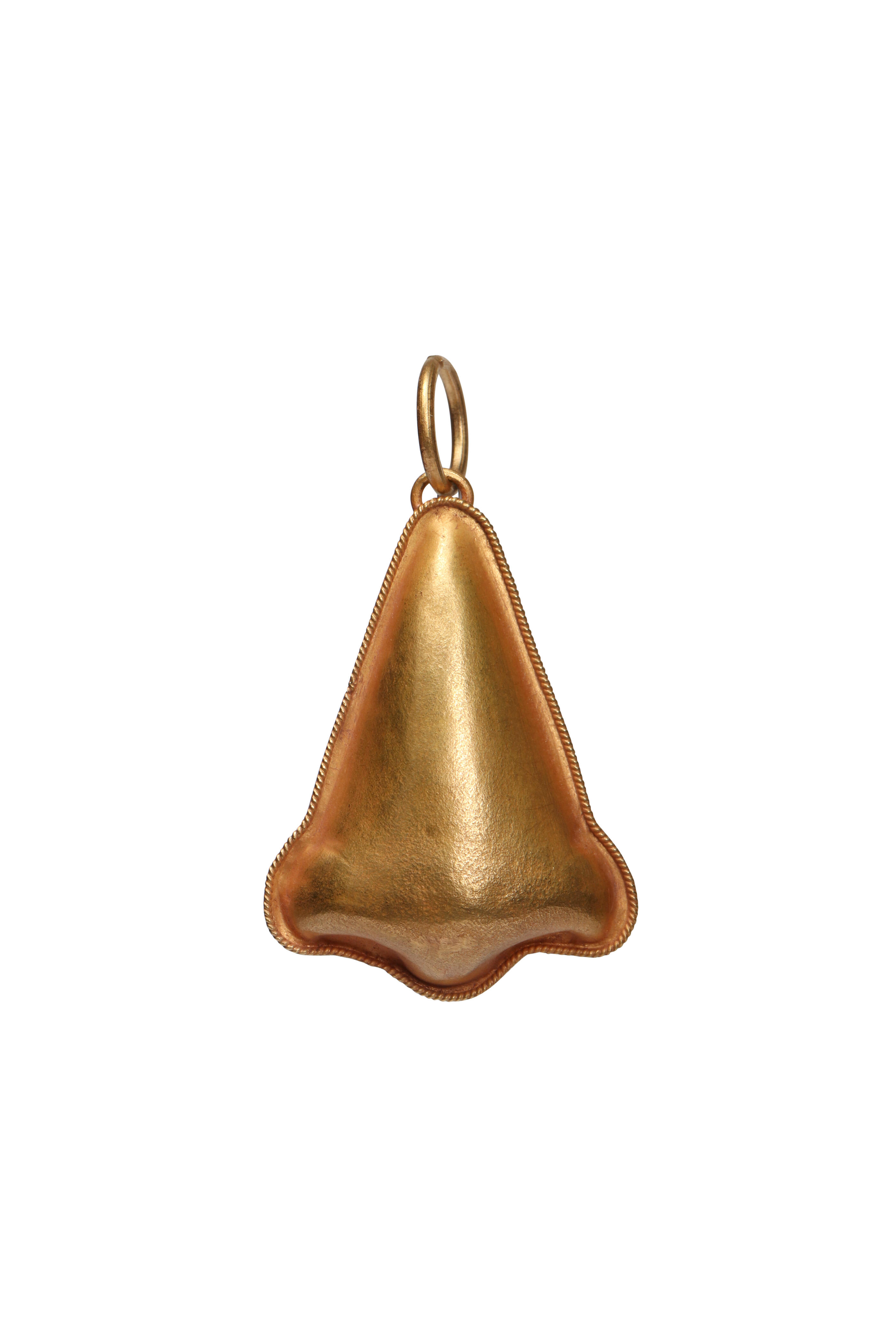 22k yellow gold. Nose design pendant. Engraved detailing. Gold bail. Handcrafted in Texas.