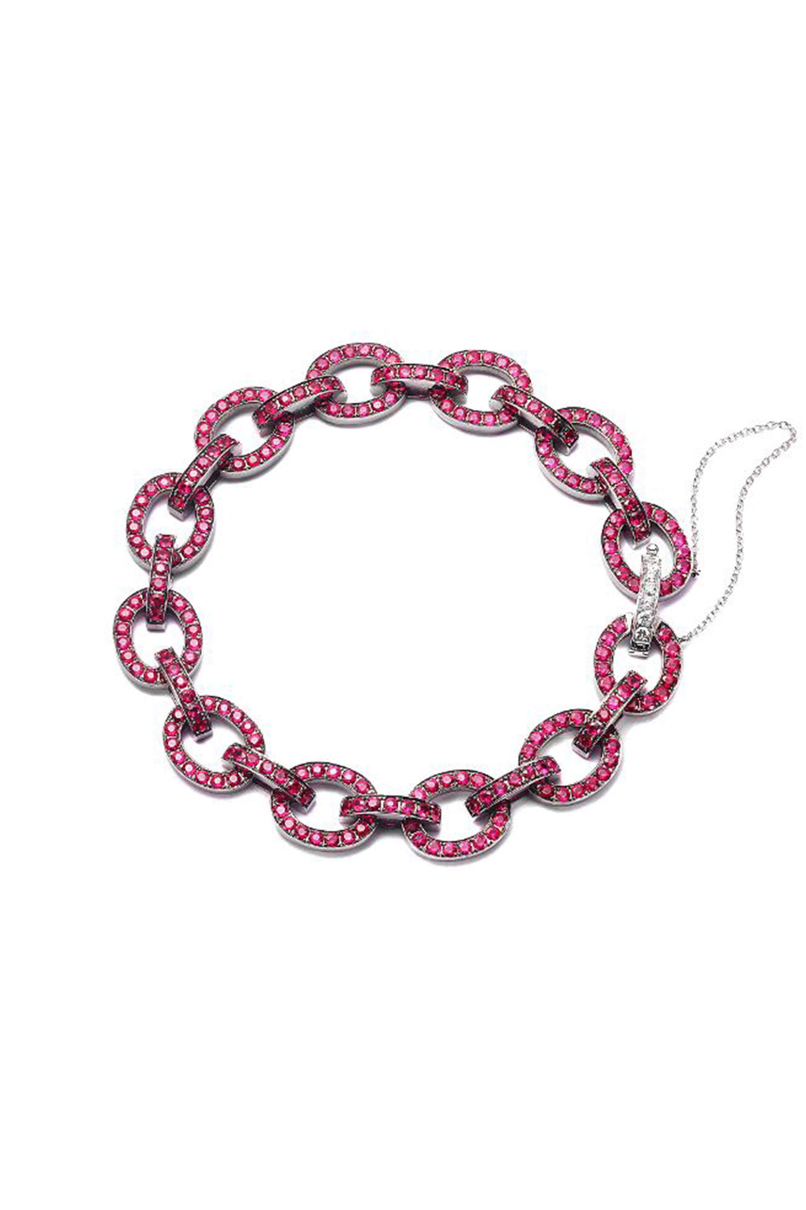 This oval-link pavé bangle showcases 7.16 carats of rubies, delicately set to catch the light with every movement and infuse the sleek silhouette with vibrant color. Crafted in 18-karat white gold with grey and white rhodium, it features a discreet security chain for added assurance. Designed to be worn solo or layered with other favorites, this timeless piece is a refined staple for any jewelry collection.