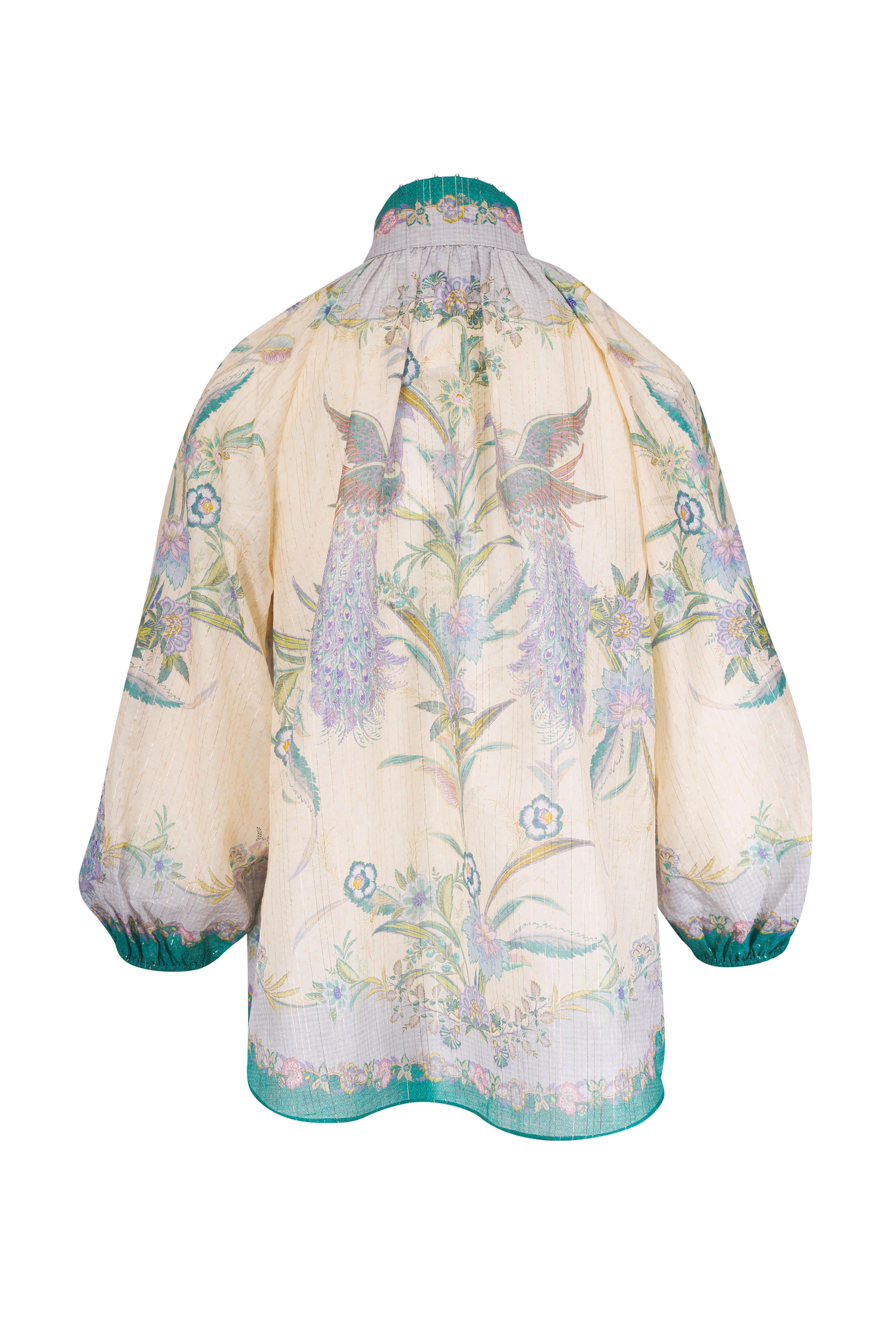 Stand collar. Front button placket; enamel buttons. Gold bead edge trim at collar. Elasticated cuffs. Placement printed. Length: 26 ¾" measurements from size S). 70% cotton, 27% silk, 3% metallized fiber. Dry clean.