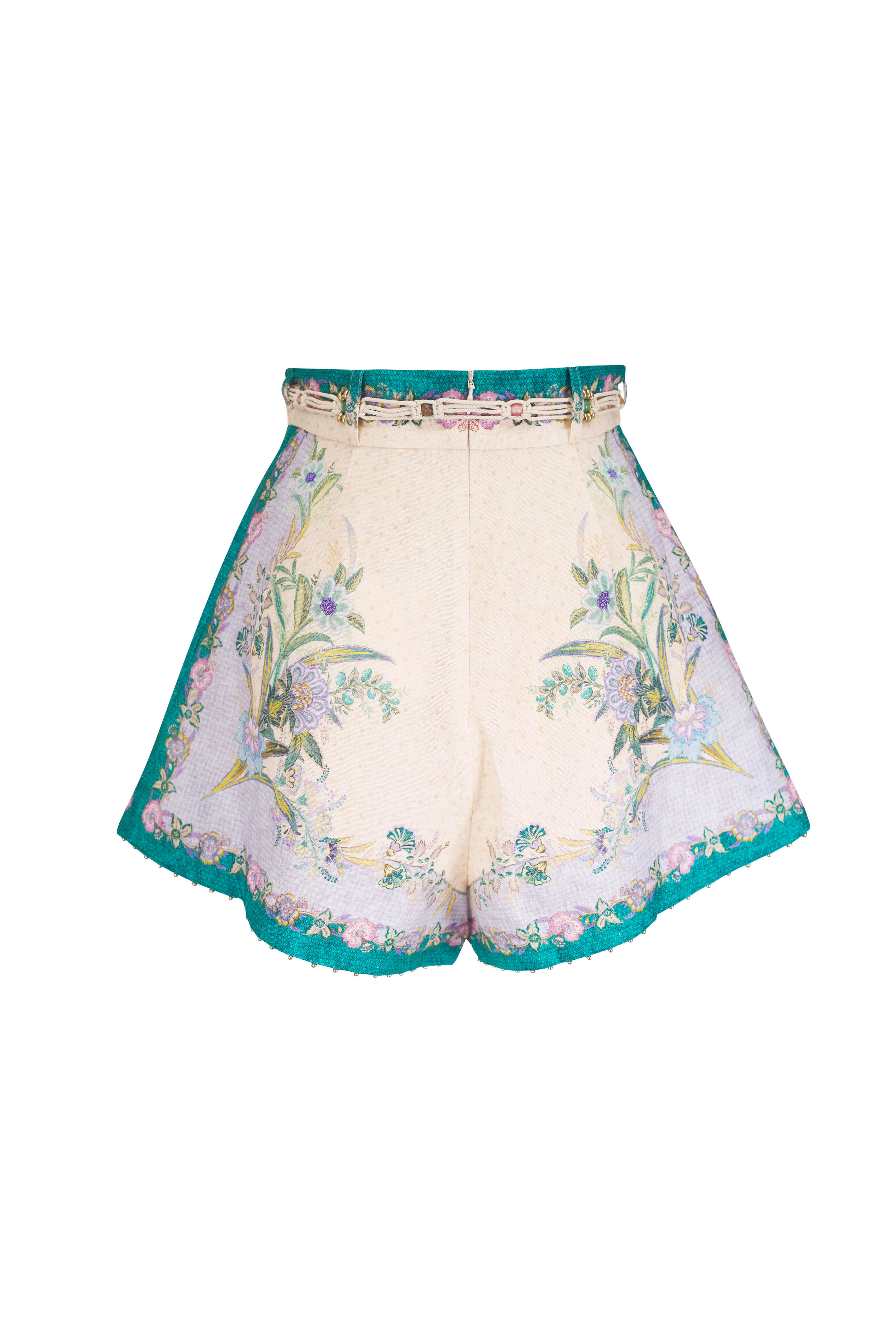 Concealed back zip. Banded waist; belt loops. Removable macramé belt. Side seam pockets. Beaded trim at hem. Placement printed. Imported. Inseam: 6". 100% linen; lining: 100% cotton. Dry clean.