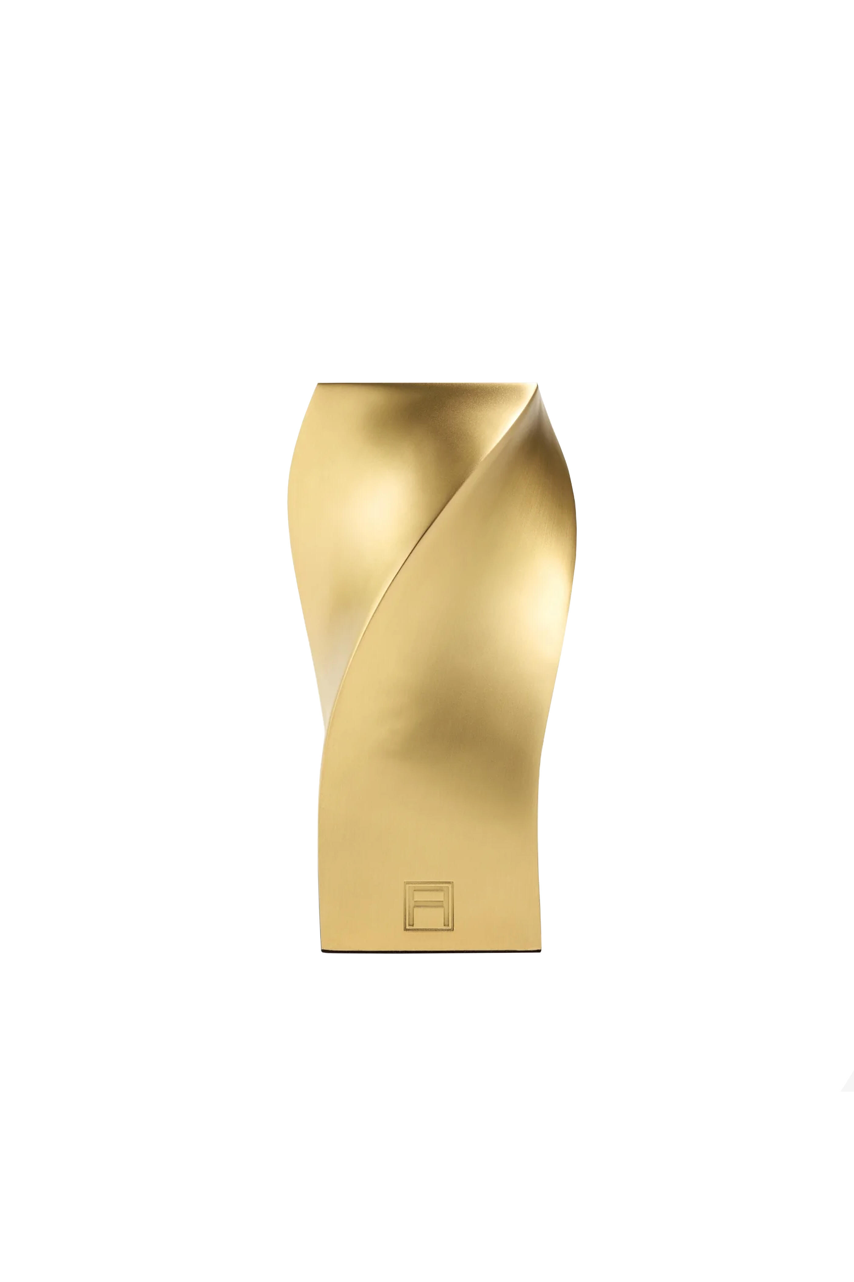 Materials: brushed matte brass, suede bottom. The Twist Bookends, designed by Prosper Assouline, were made to be admired from every angle. With a contemporary reinterpretation of the classic plinth shape, these bookends push the boundaries of traditional design through their smooth contours and surfaces.. These handcrafted materials may naturally develop unique marks, color shifts over time, enhancing their character and individuality.. Dimensions: 4.8” x 4” x 9”.