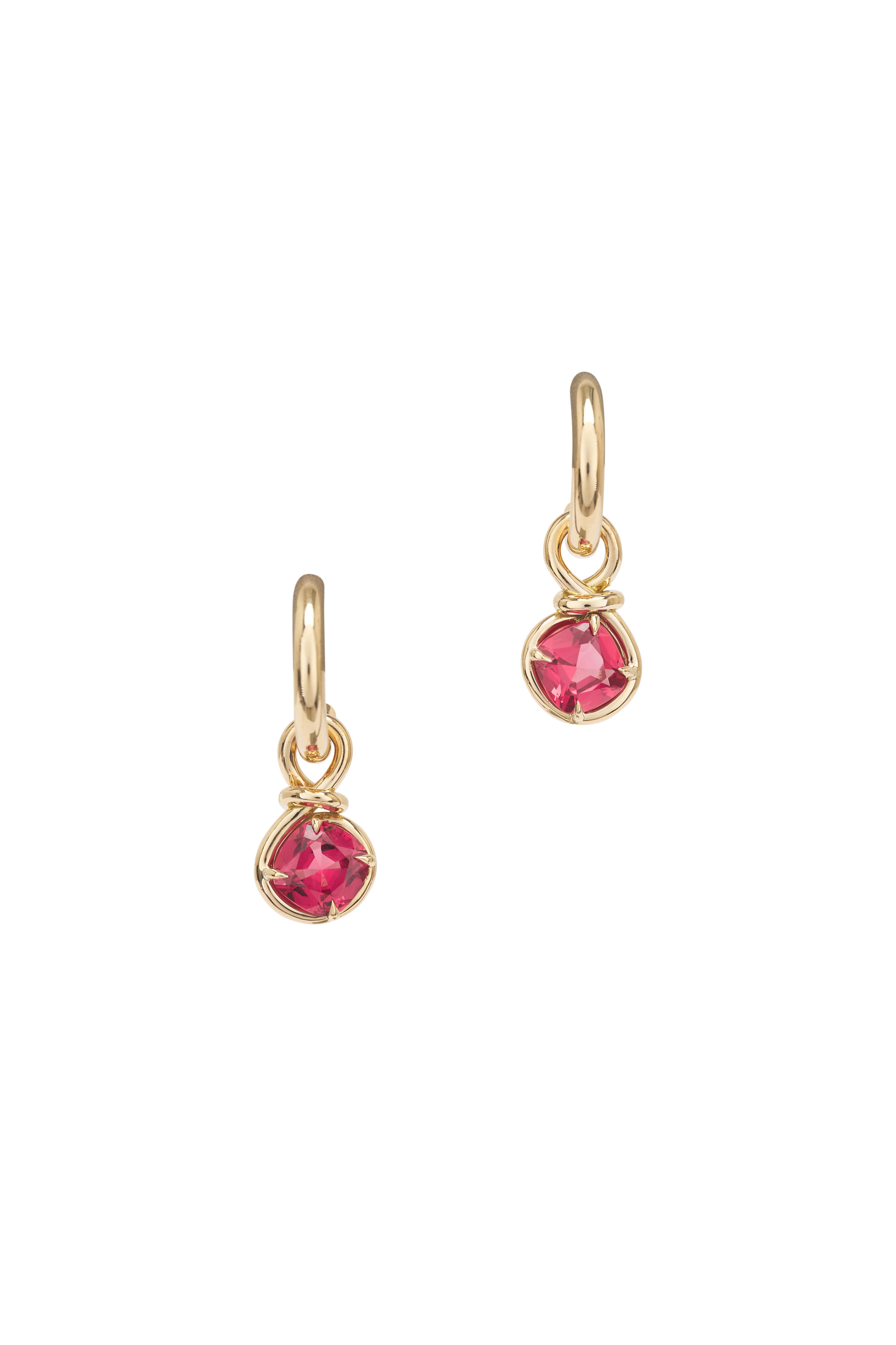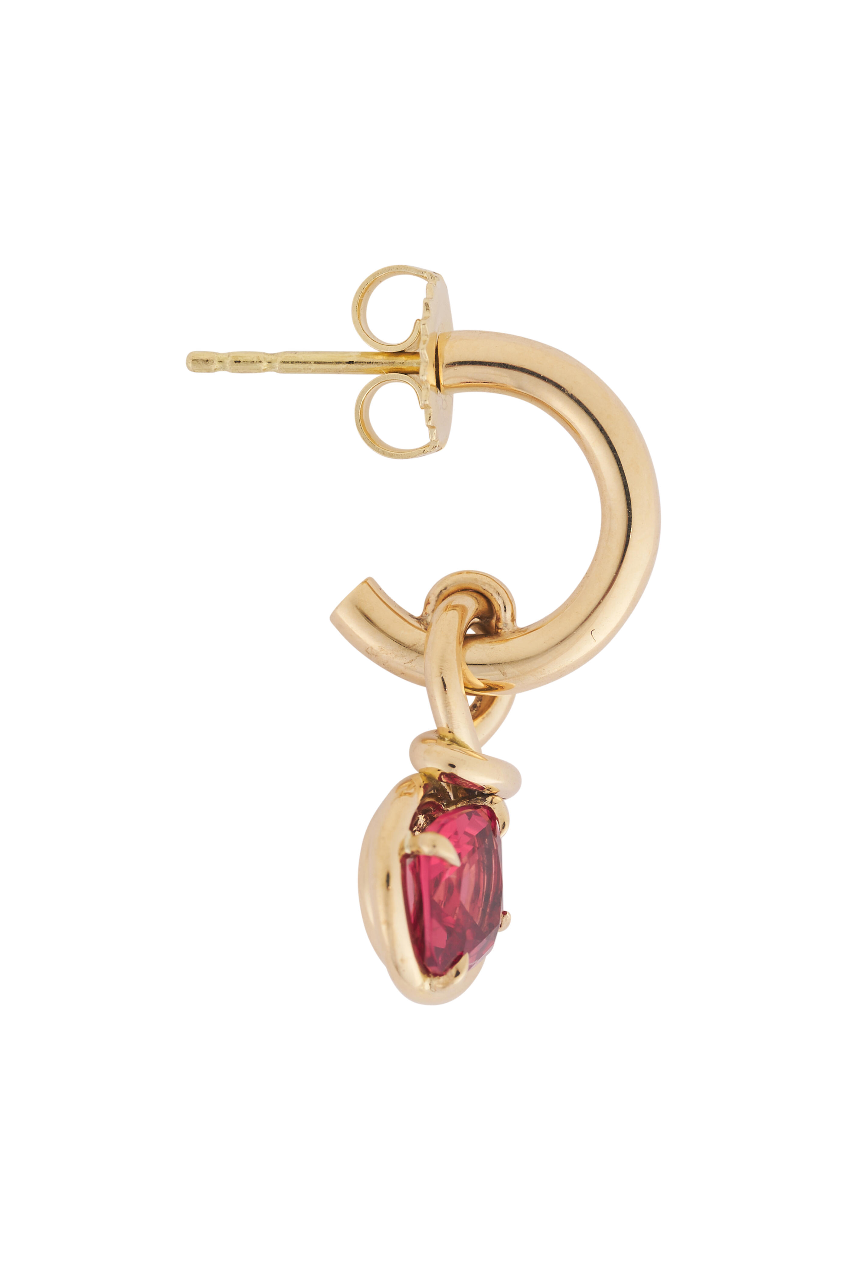 18k yellow gold. Spinel 2.64 total carat weight. Pink spinel. Red spinel. Prong setting. Gold bezel. Drop style. Push back post.