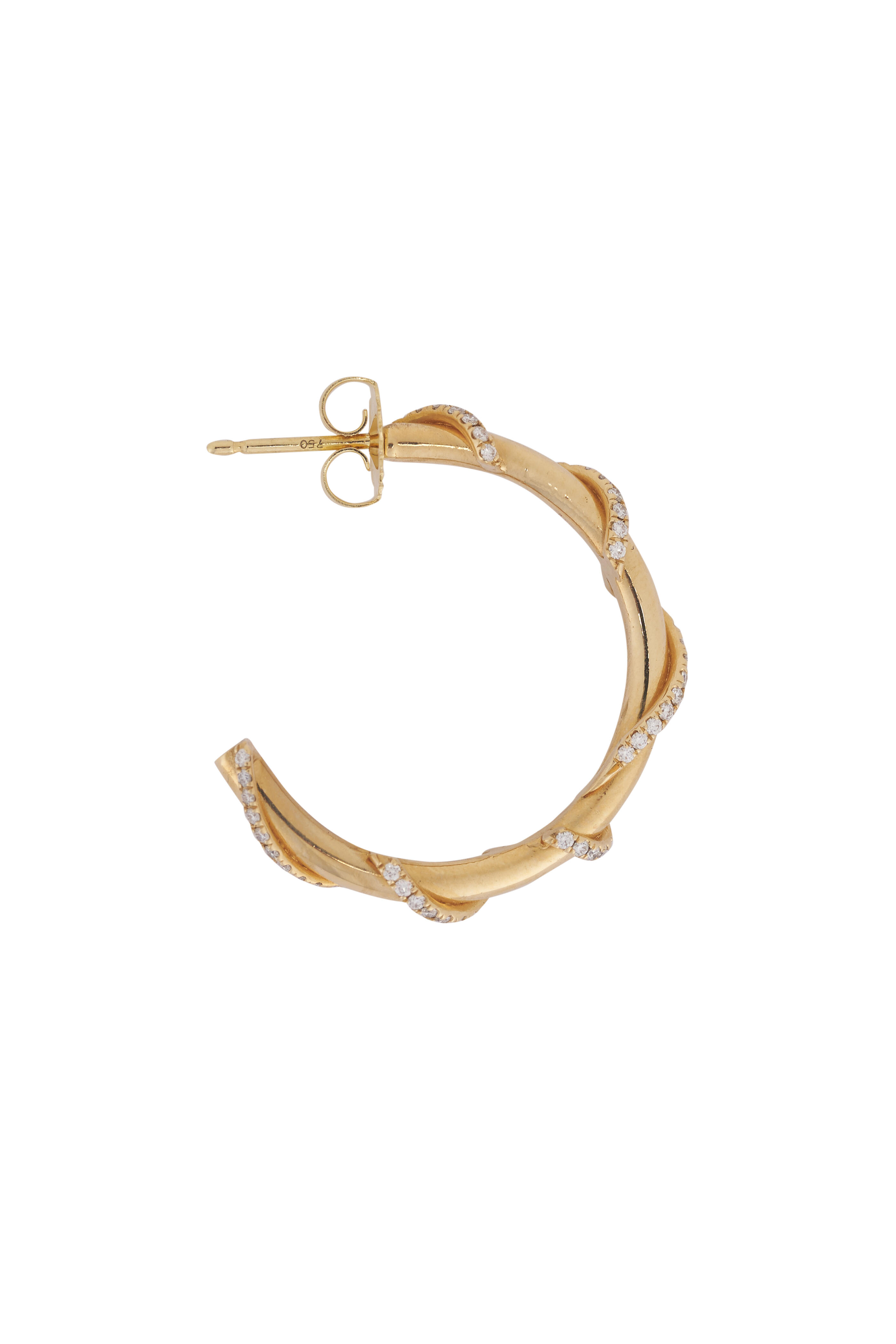 18k yellow gold. Diamond 1.00 total carat weight. Wrap around design. Prong setting. Hoop style. Push back post.