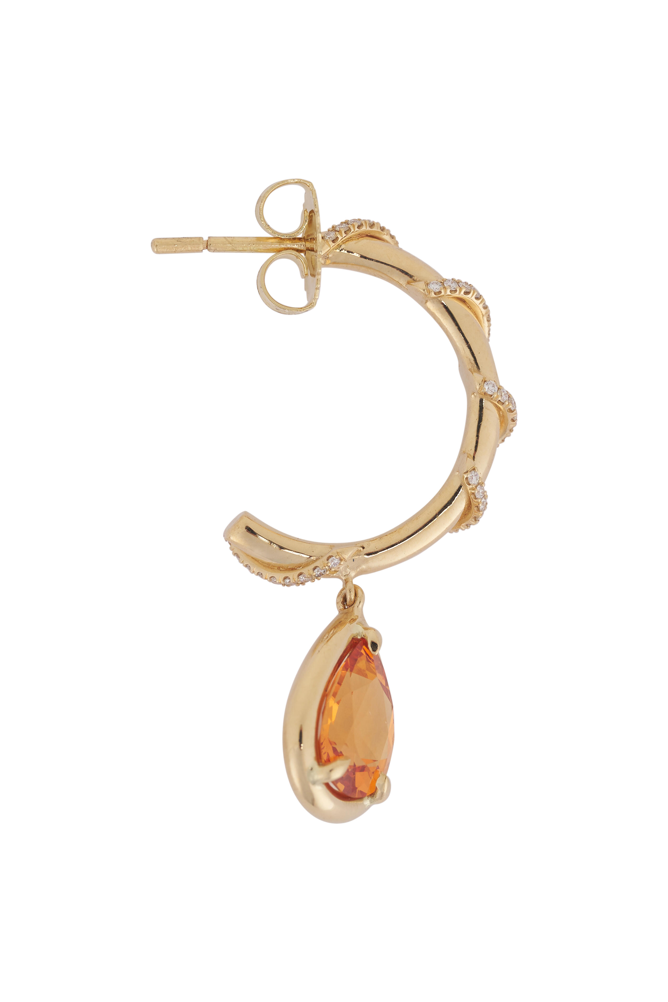 18k yellow gold. Diamond 0.60 total carat weight. Mandarin Garnet 3.13 total carat weight. pear cut garnet. Droplet design. Wrap around design. Prong setting. Hoop style. Drop style. Push back post.