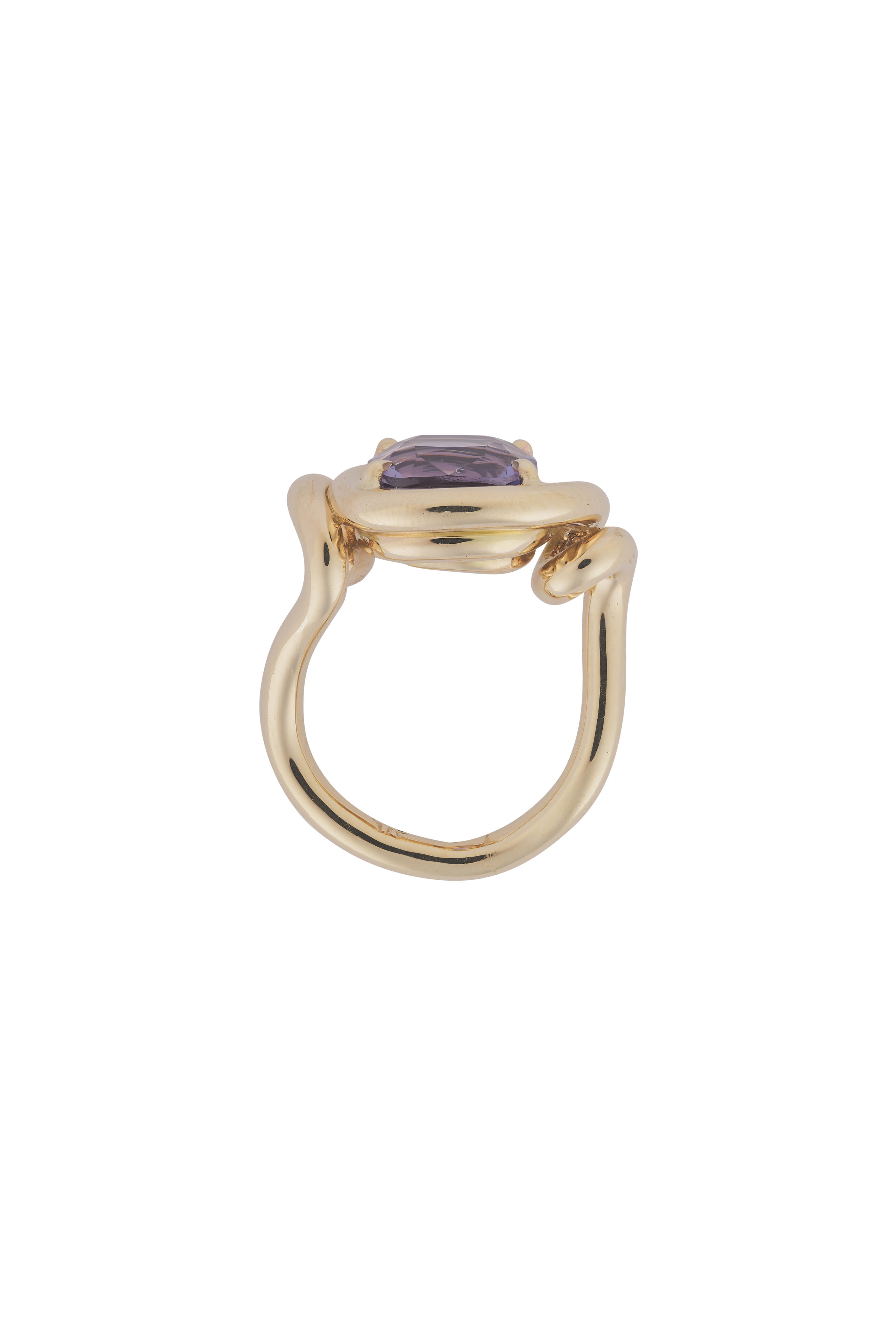 18k yellow gold. Sapphire 4.12 total carat weight. Violet sapphire. Knotted design. Prong setting. Call for ring size.