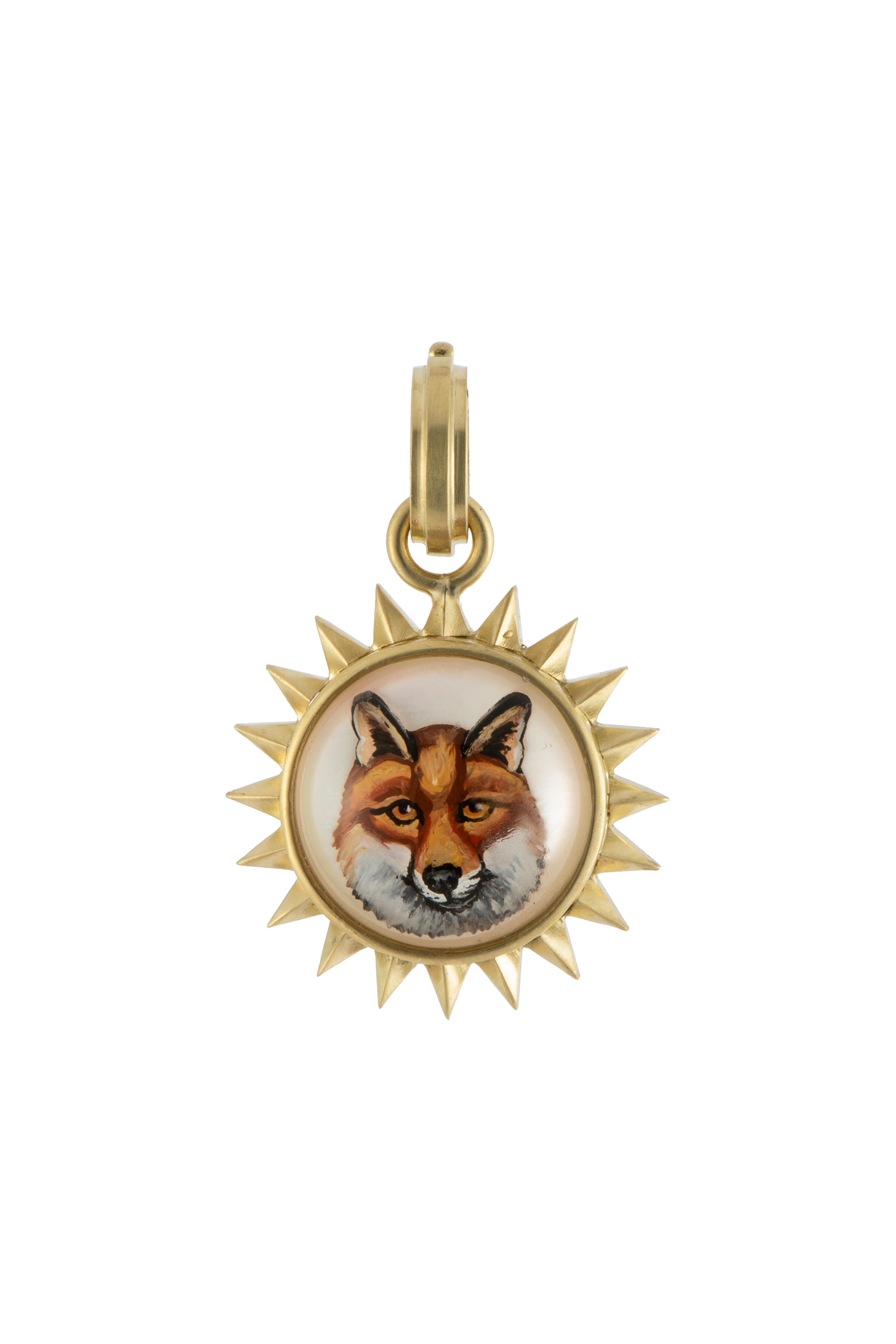 18k gold. Fox design. Hand-painted. Gold spike halo. Hinge bail. Made in the USA.