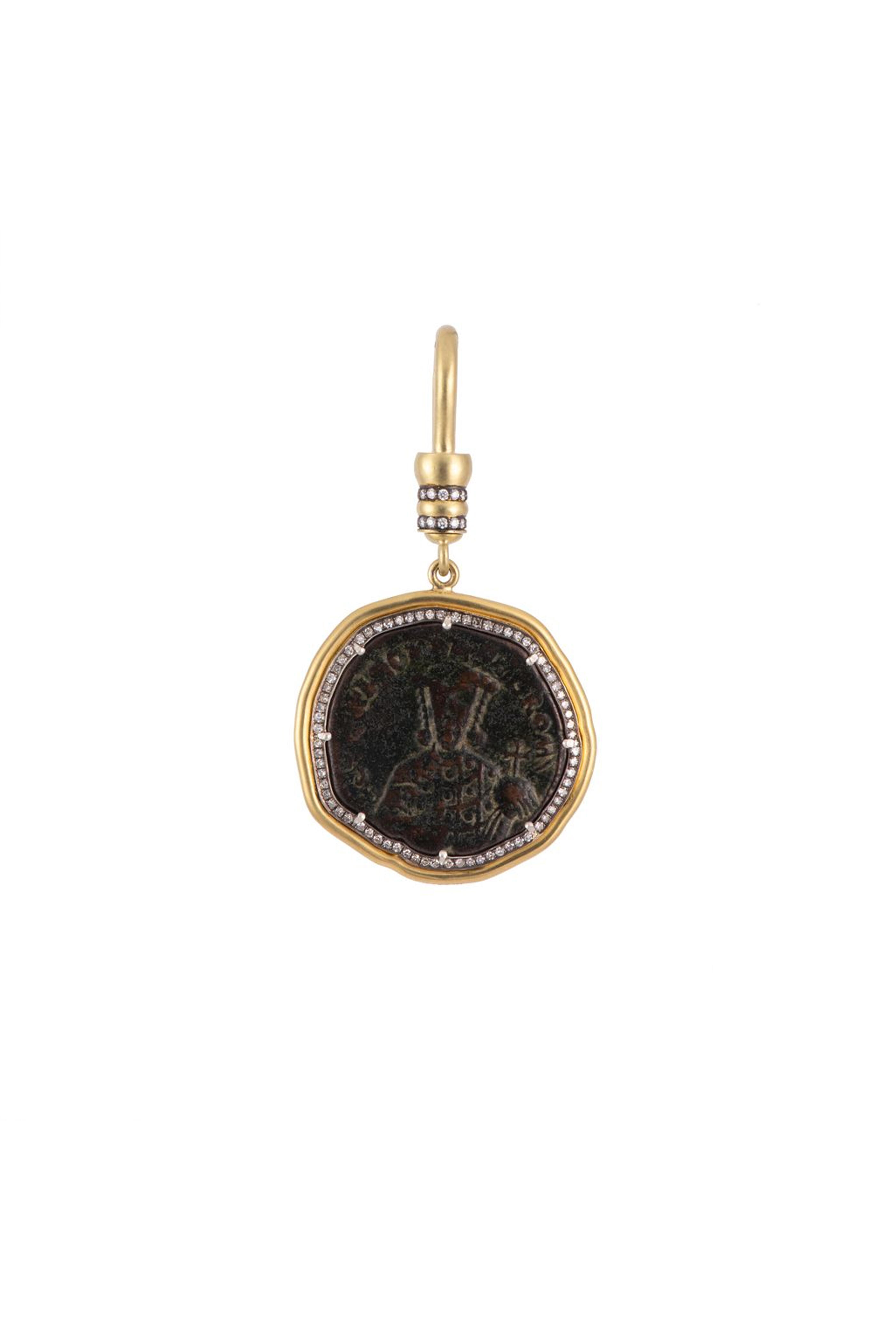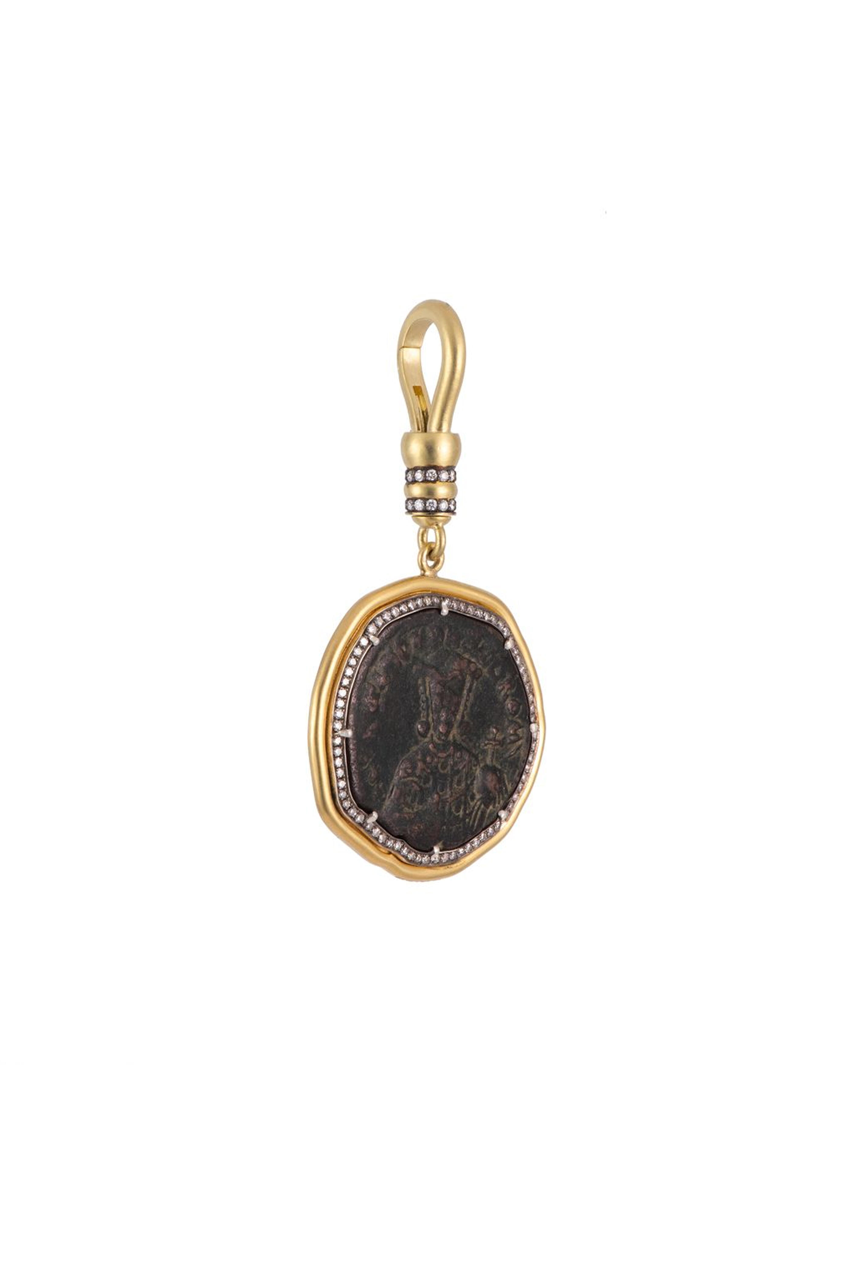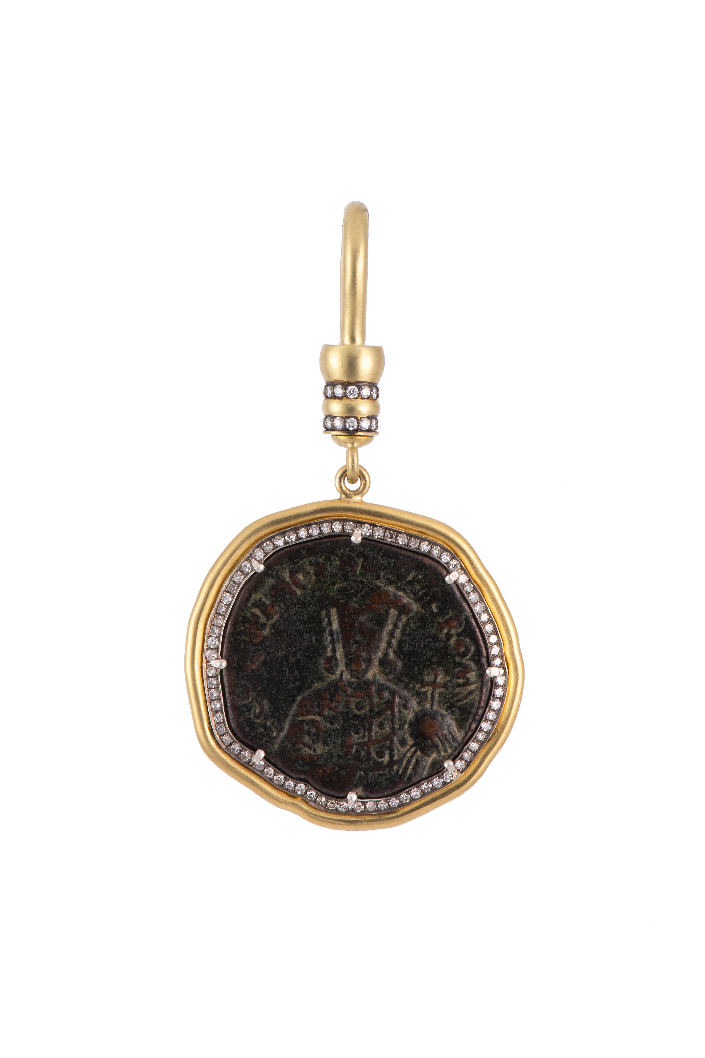 18k gold. Diamond 0.50 total carat weight. Constantine VII Byzantine Bronze Coin. Diamond halo. Prong setitng. Gold bezel. Diamond hinge bail. Made in the USA.