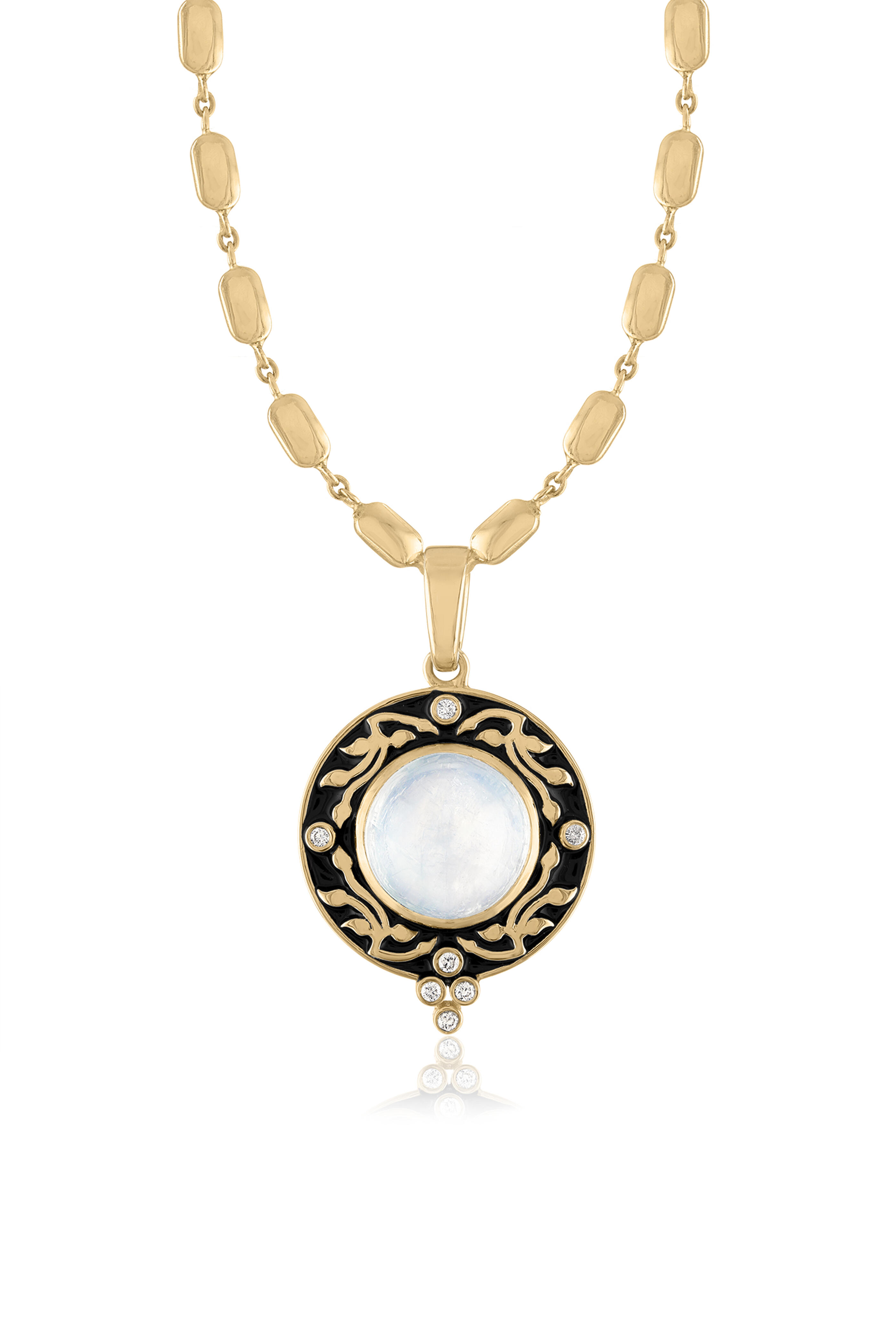 14k Yellow Gold. Gold Weight: 2.76 g. 0.06 ct Diamond. Black Enamel. Moonstone. Gemstone Weight: 5.07 ct. 18". 29 mm x 18 mm.
