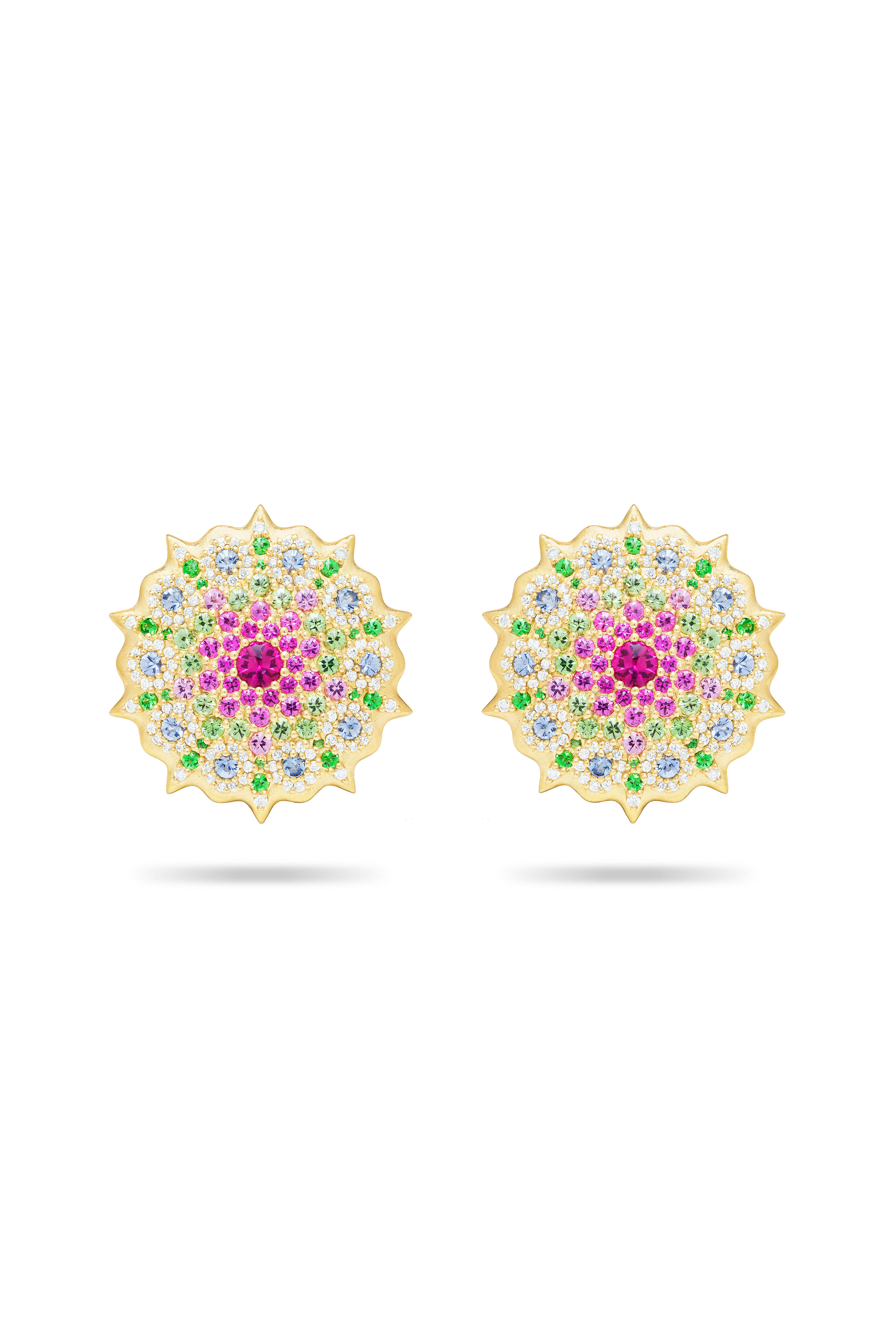 18k Yellow Gold. 1.27 ct Diamond. 1.94 ct Pink Sapphire. 1.0 ct Tsavorite. 1.07 ct Blue Sapphire.