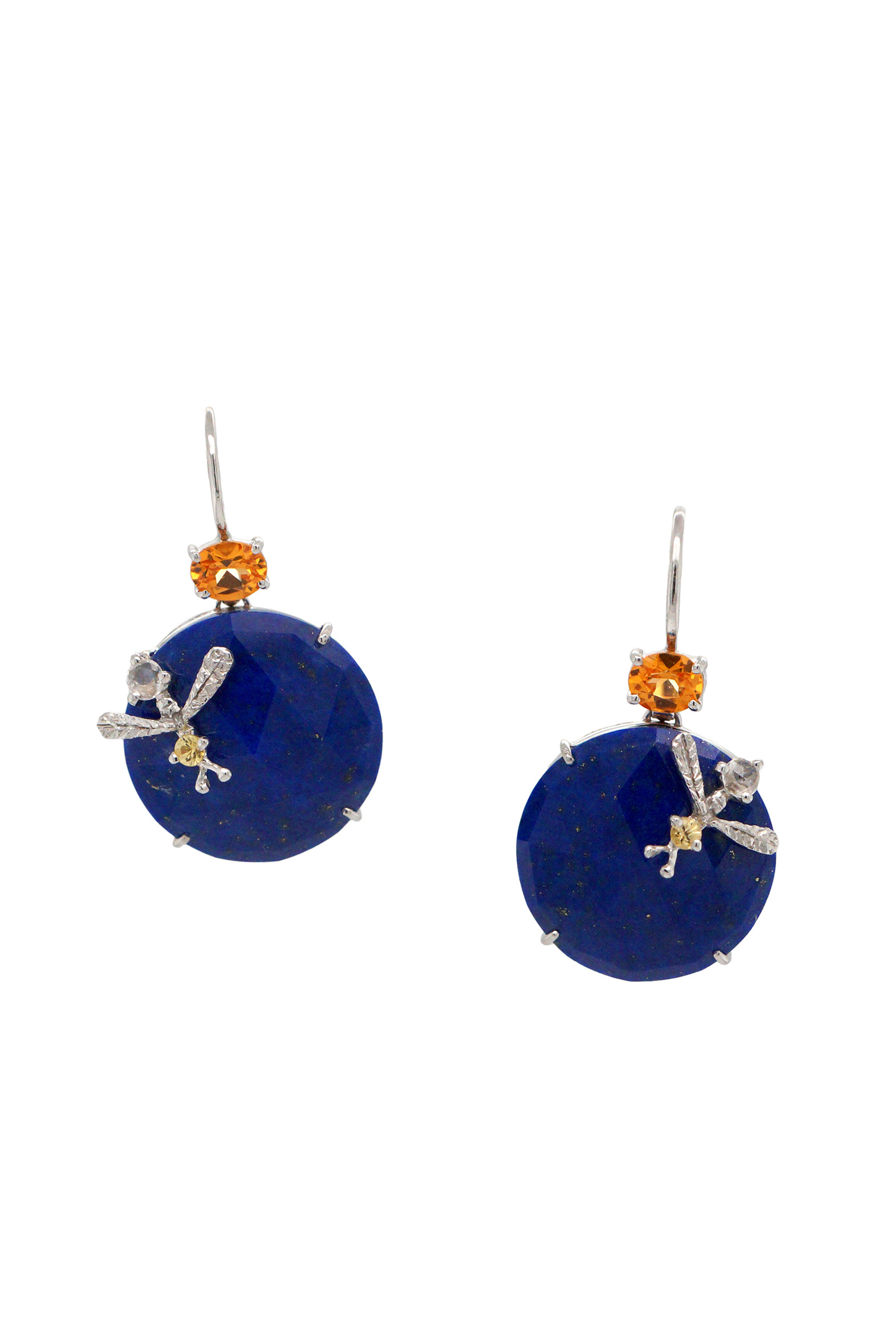 18k white gold. Diamond 0.06 total carat weight. Gemstones 21.37 total carat weight. Lapis. Spessartite. Yellow sapphire. Bee design. Prong setting. Drop style. Latch back. One of a kind. Handcrafted in New York. Length: 1.25".