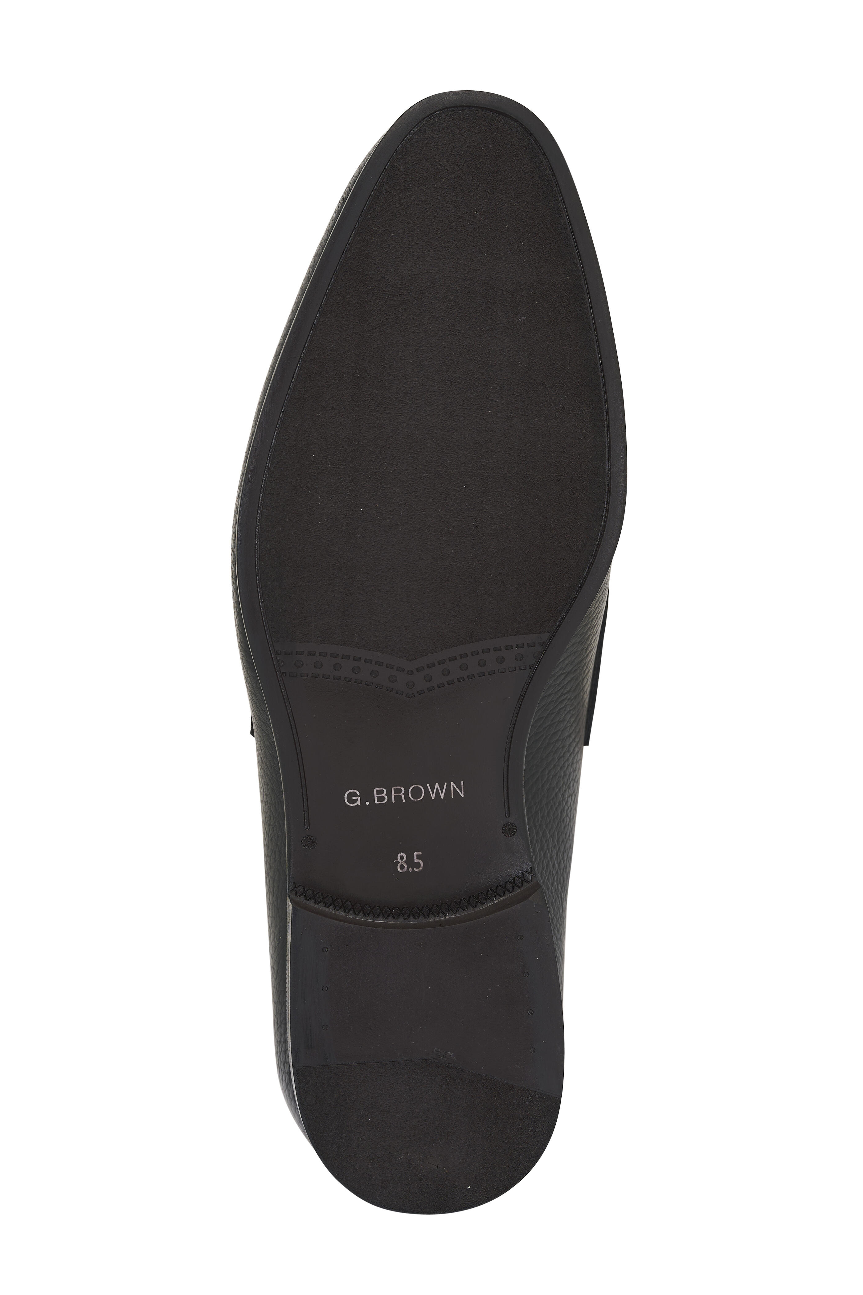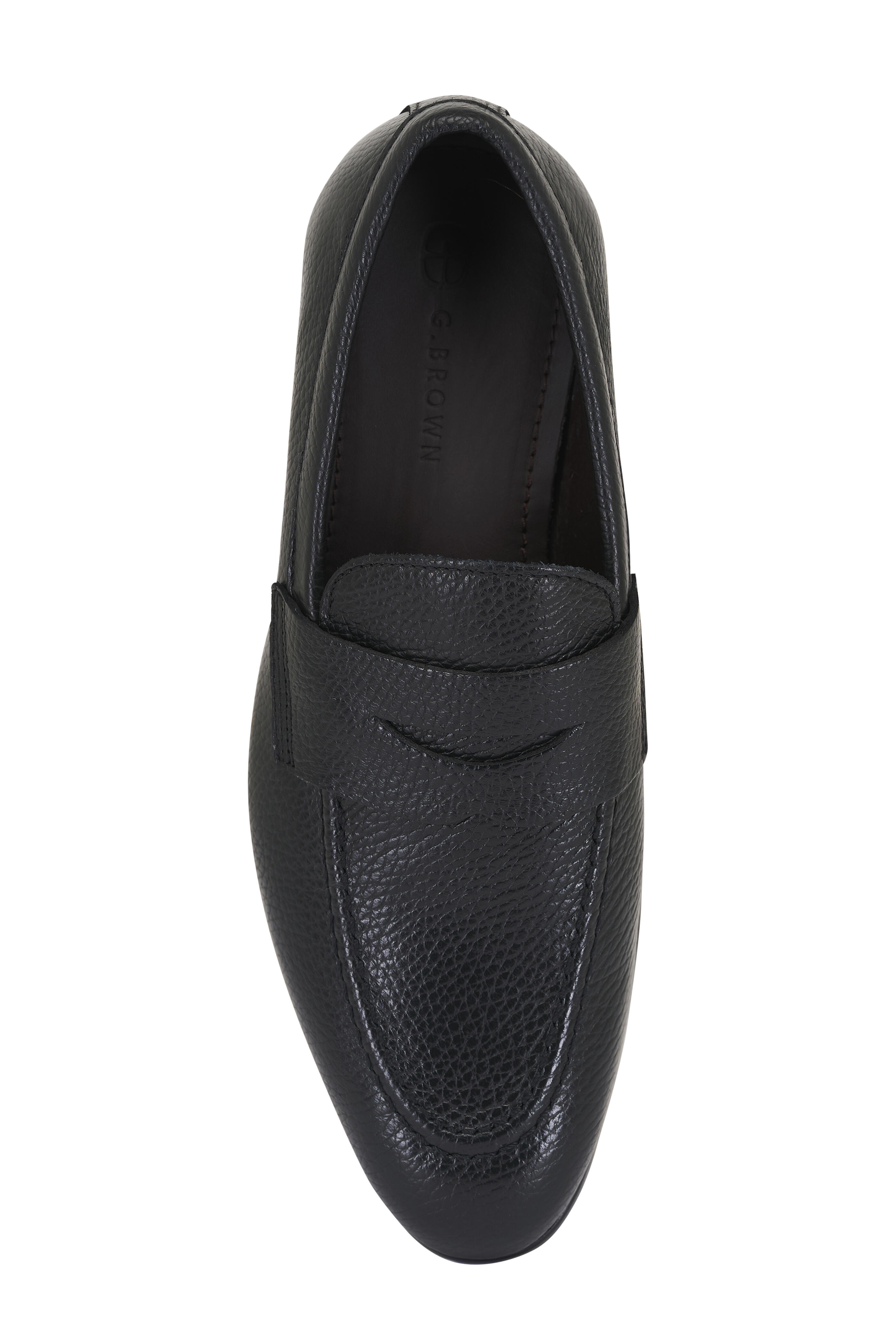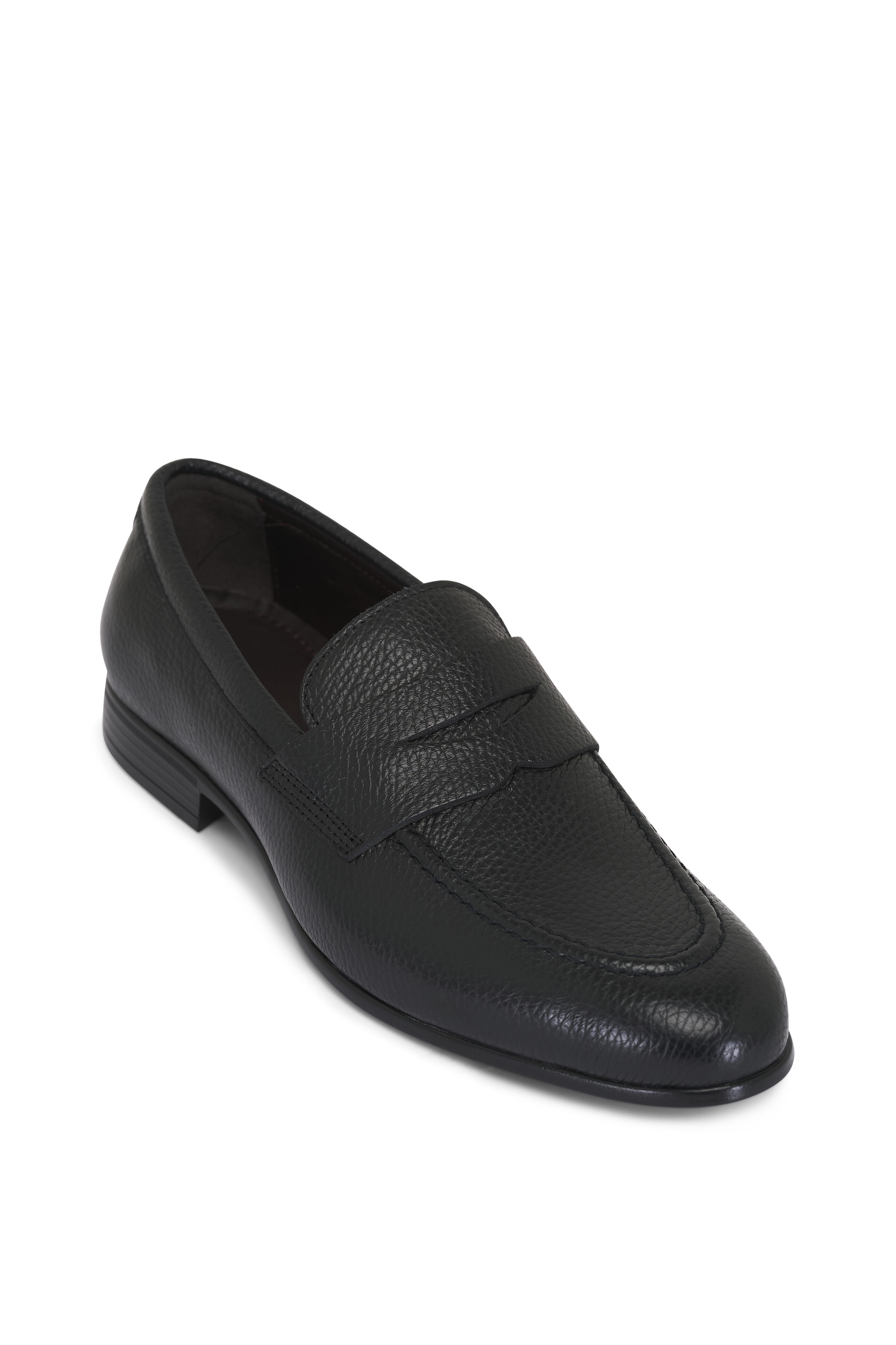Grained leather upper. Apron toe. Penny keeper strap at vamp. Slip on style. Leather lining and insole. Stacked heel. Leather sole. Made in Italy.