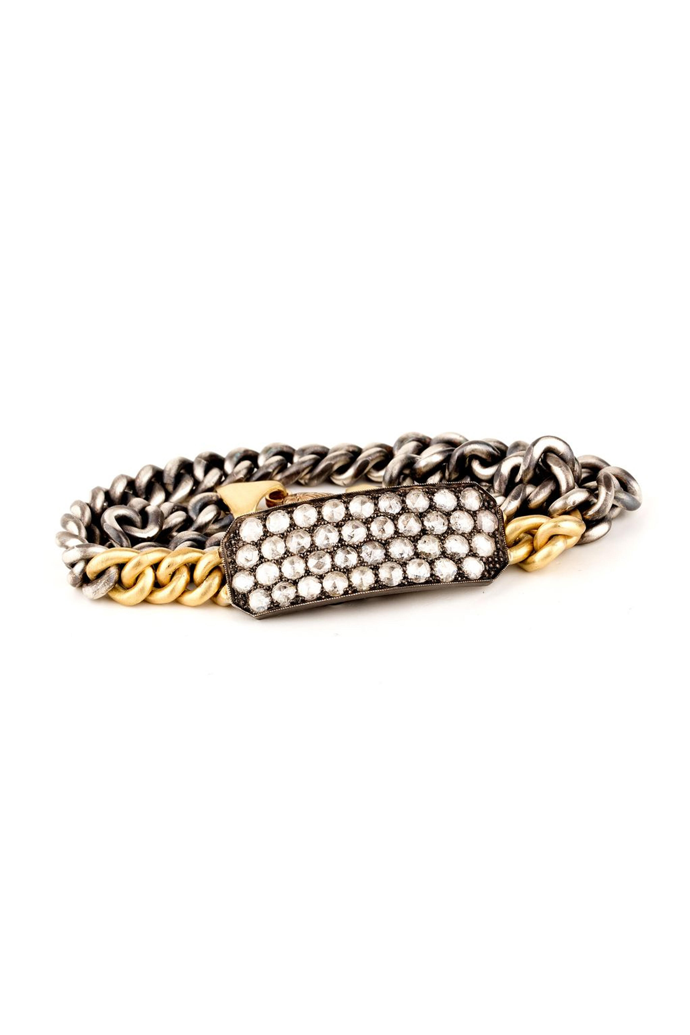 18k gold. Sterling silver. Diamond 4.93 total carat weight. Two-tone design. Ten table design. Wrap around style. Chain link. Prong setting. Lobster claw clasps. Made in the USA.
