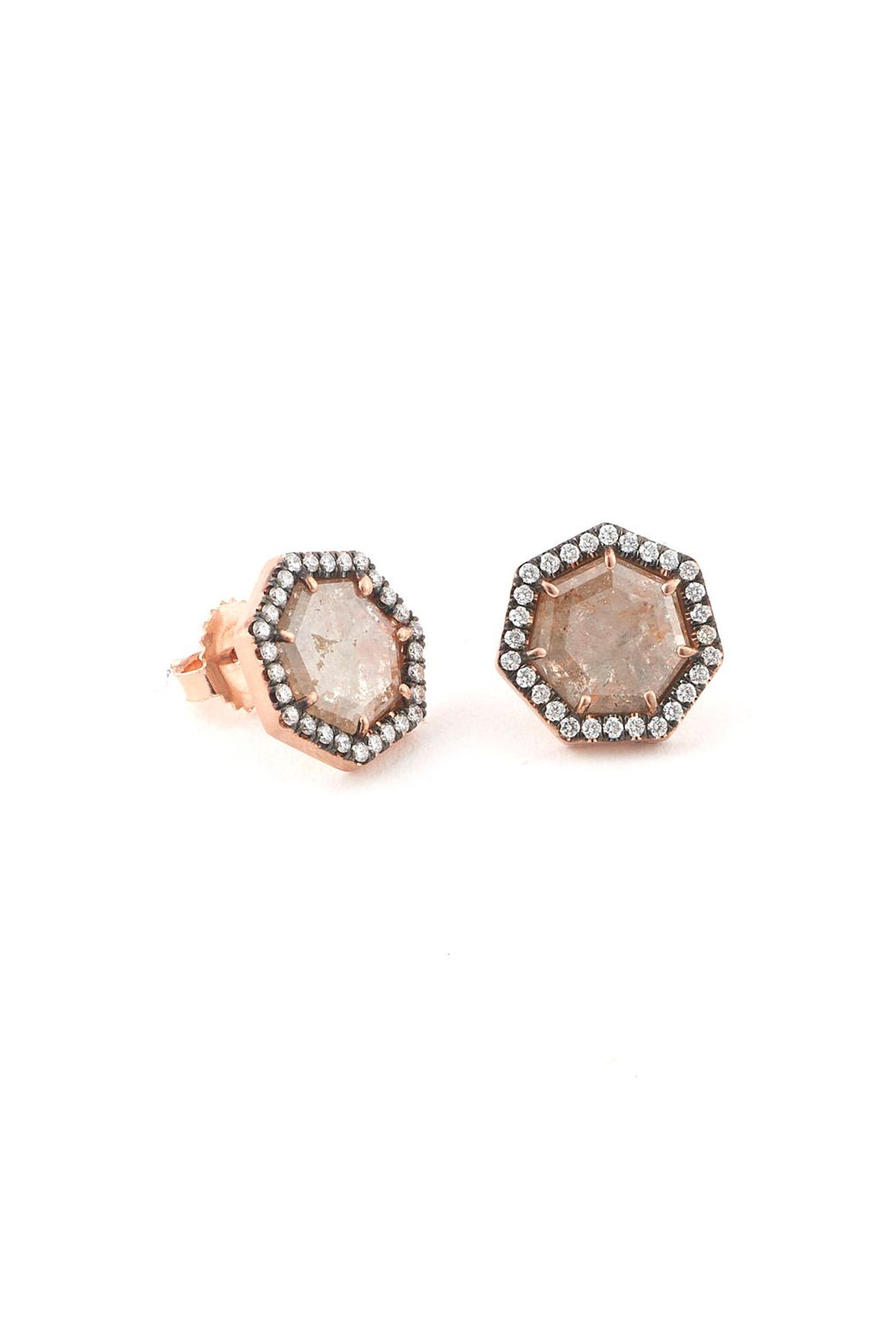 14k rose gold. Diamond 4.14 total carat weight. Rough cut diamond. Octagon shape design. Stud style. Diamond halo. Prong setting. Push back post. Made in the USA.