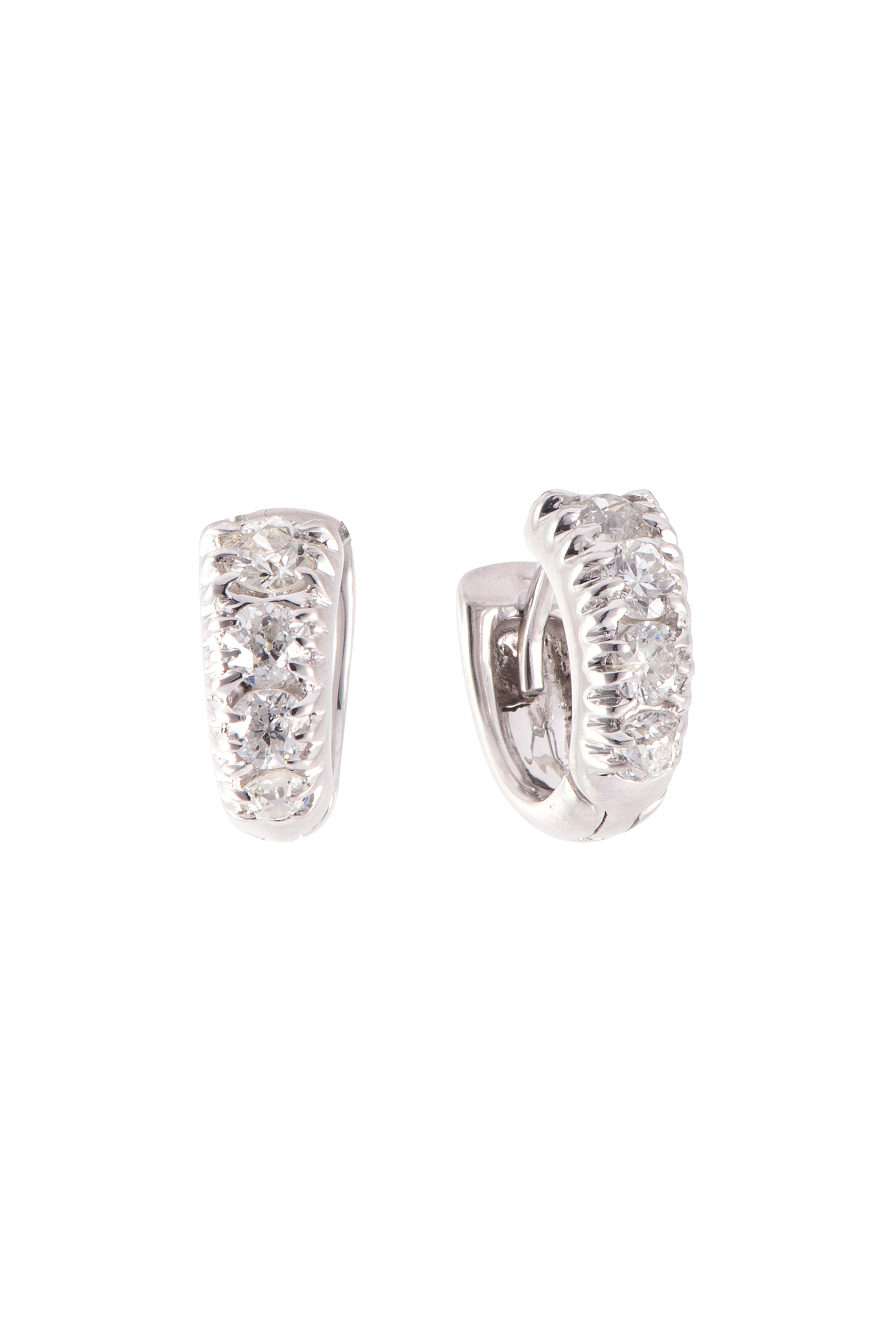 18k white gold. Diamond 1.07 total carat weight. Old European cut diamond. Hoop style. Prong setting. Hinged huggie clasp. Made in the USA.