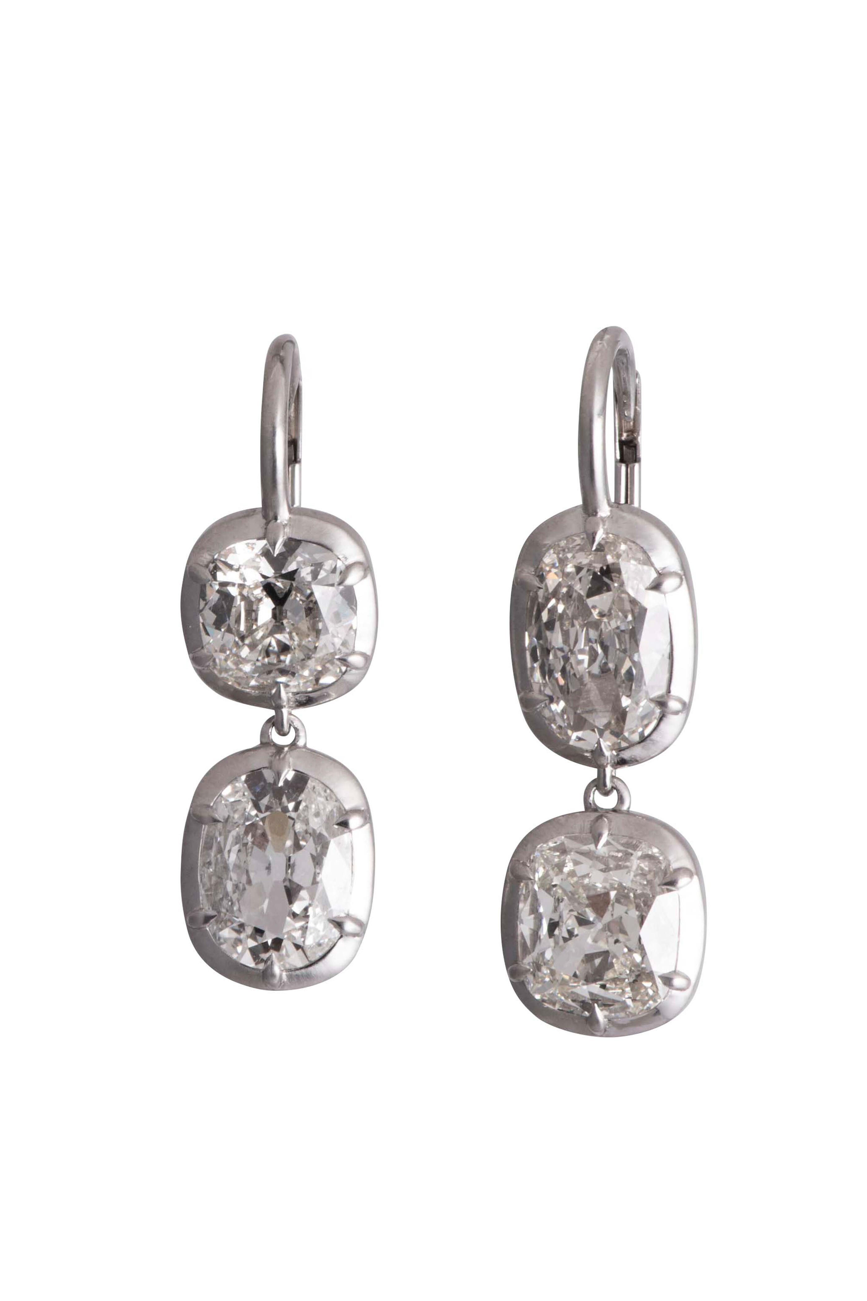 Platinum. Diamond 5.85 total carat weight. Mixed cut diamonds. Double drop design. Platinum bezel. Drop style. Prong setting. Wire back. Made in the USA.