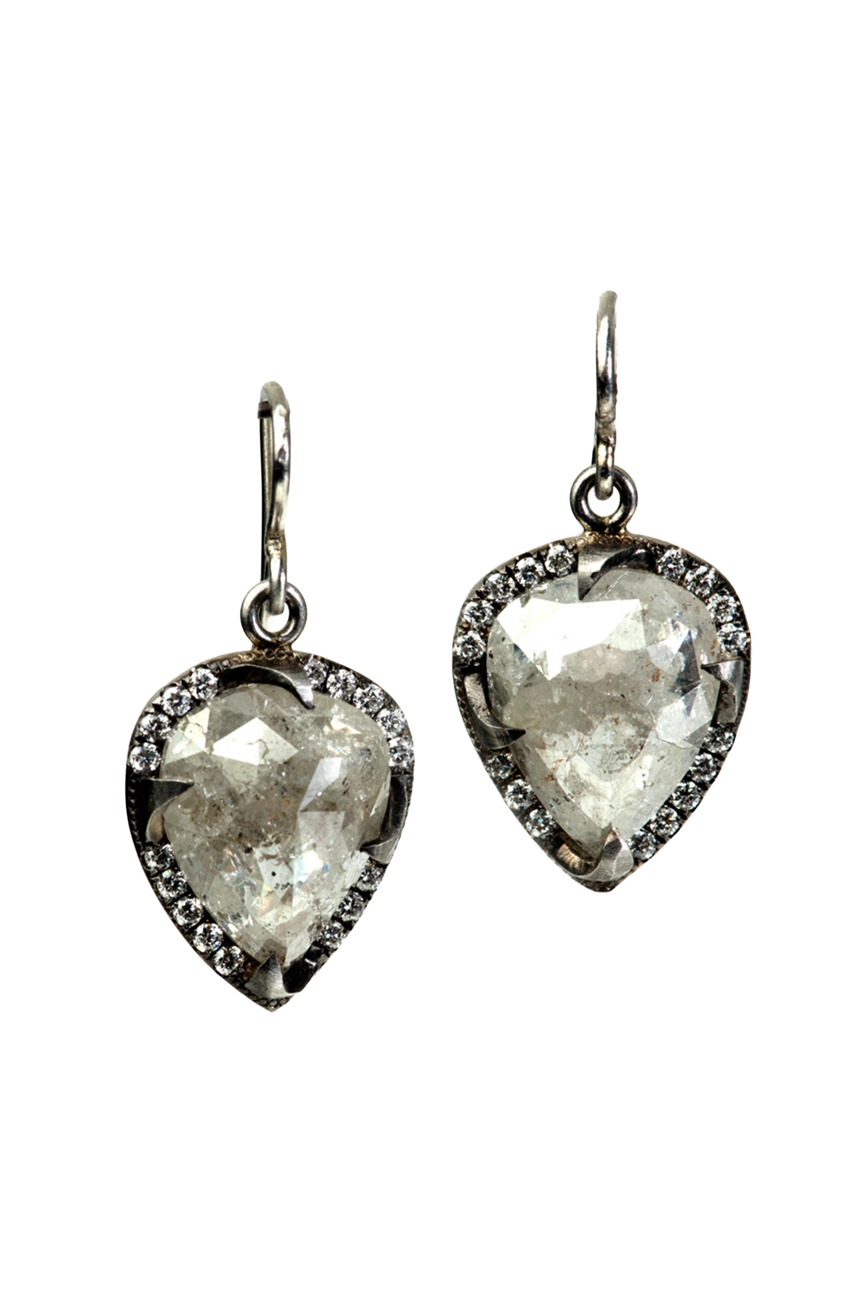 Platinum. Diamond 7.45 total carat weight. Rough cut diamond. Pear shape design. Diamond halo. Drop style. Prong setting. Wire back. Made in the USA.