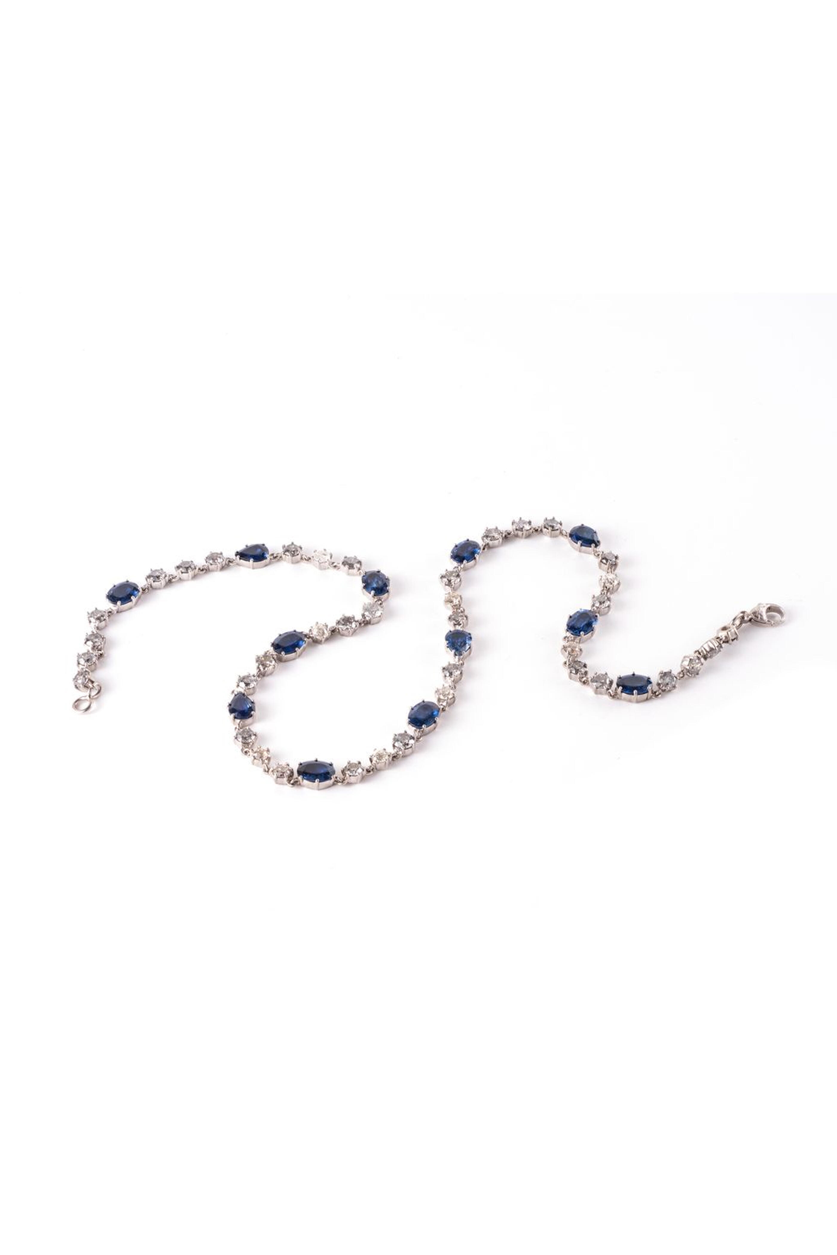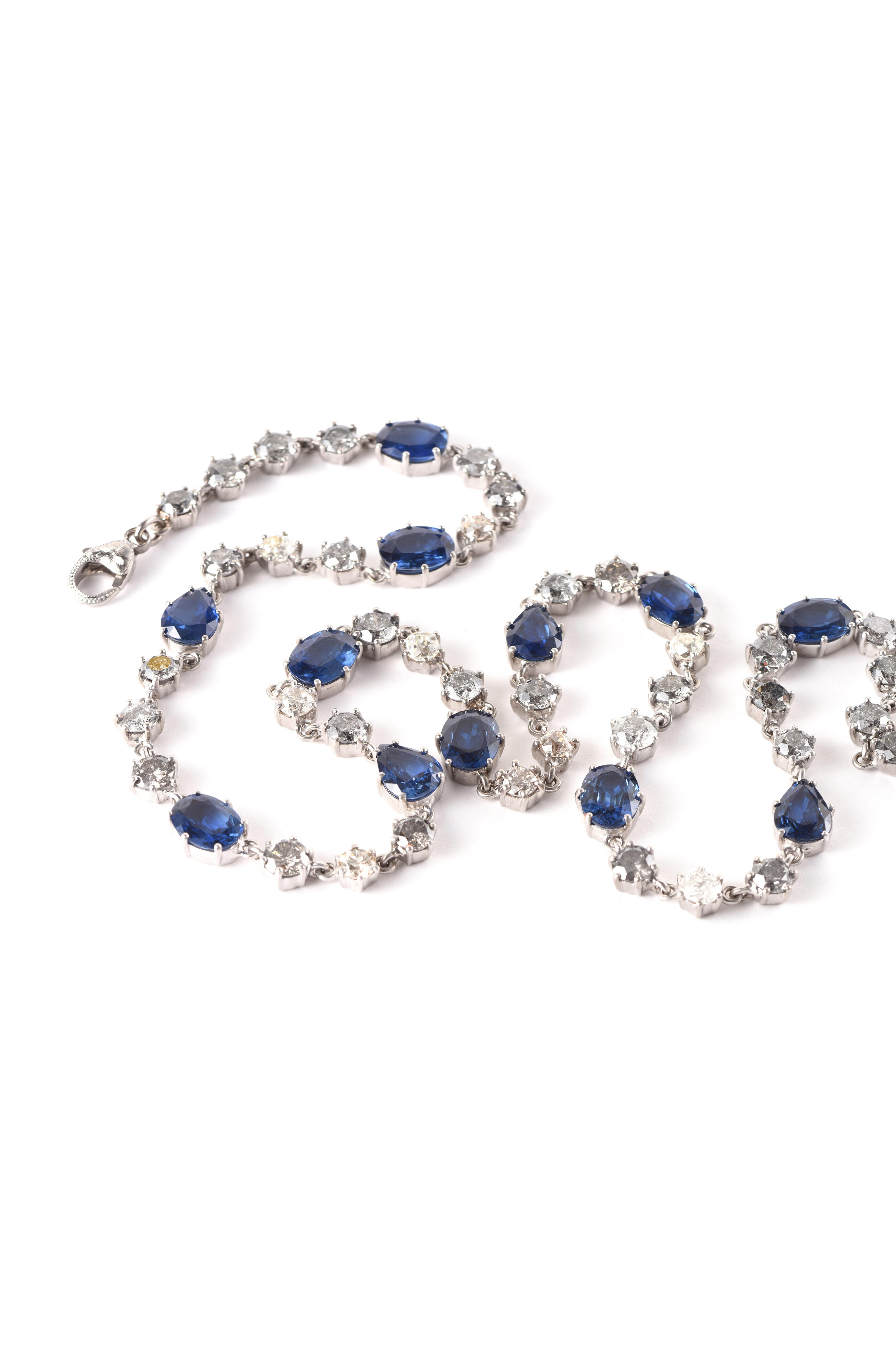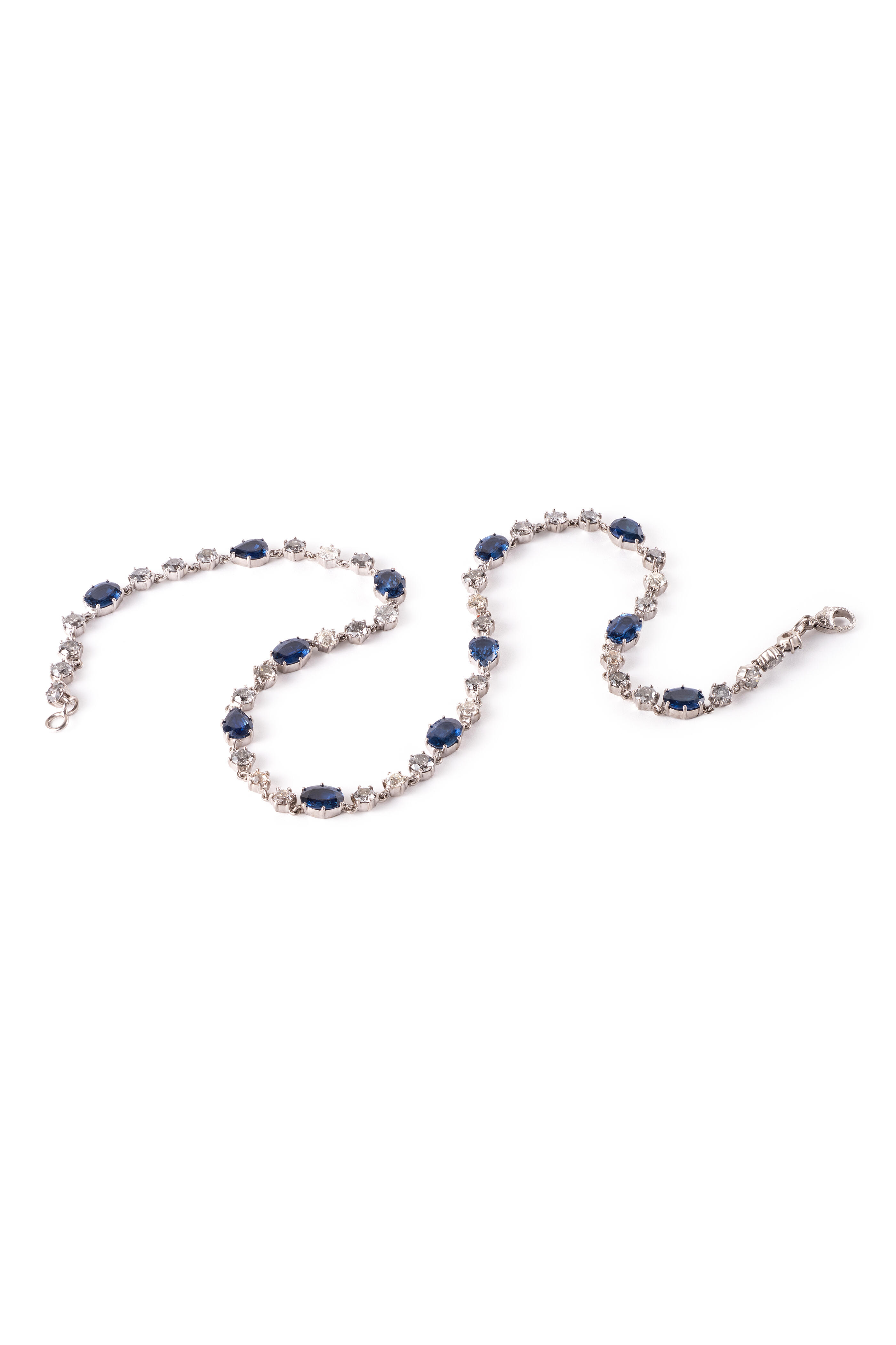 18k white gold. Diamond 1.80 total carat weight. Sapphire 14.58 total carat weight. Gray diamond 9.33 total carat weight. European cut diamond. Prong setting. Lobster claw clasps. Made in the USA.