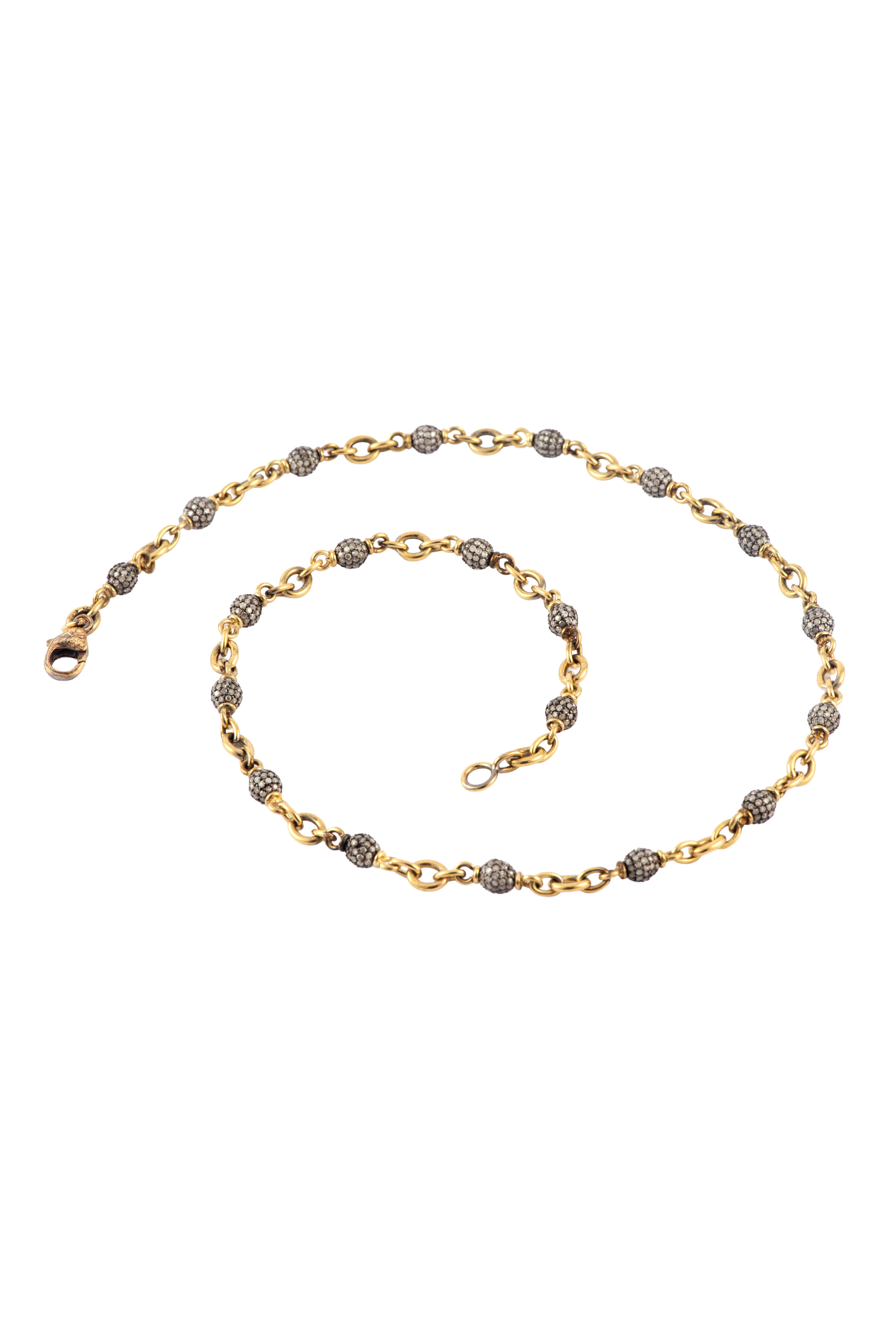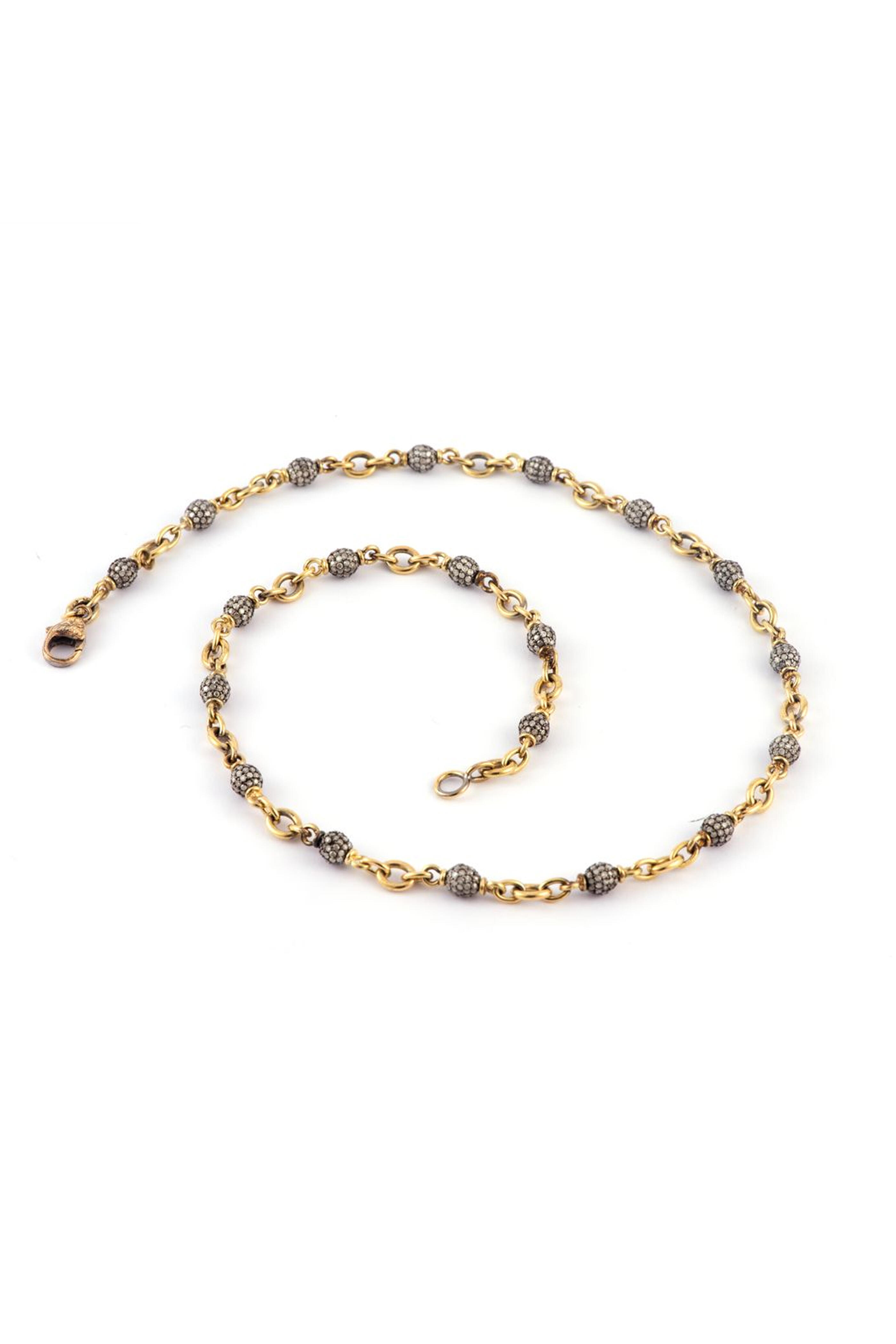 18k gold. Diamond. Disco ball beads. Link chain. Lobster claw clasps. Made in the USA. Length: 16”.