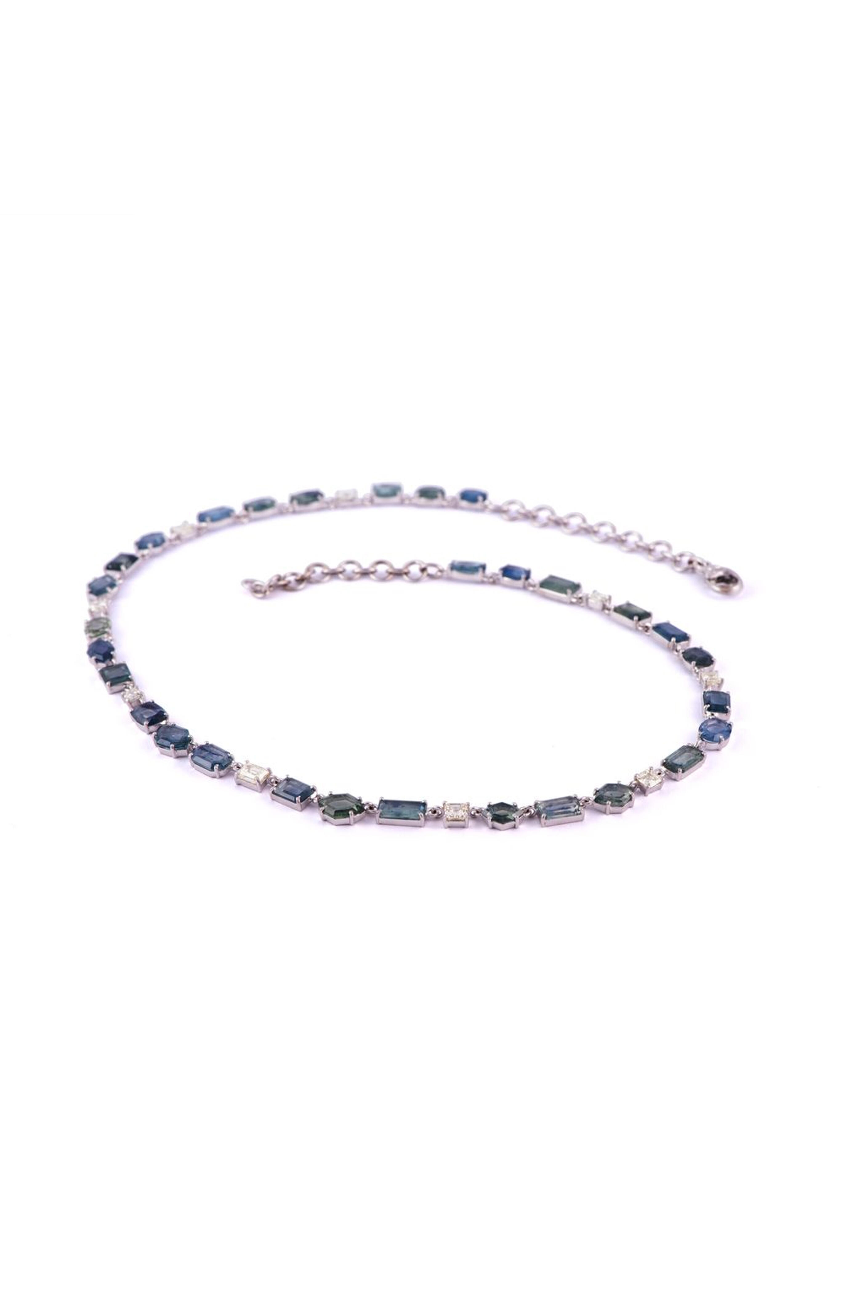 18k white gold. Diamond 1.76 total carat weight. Sapphire 19.11 total carat weight. Mixed cut gemstones. Chain link. White gold bezel. Prong setting. Lobster claw clasps. Made in the USA. Length: 16”.